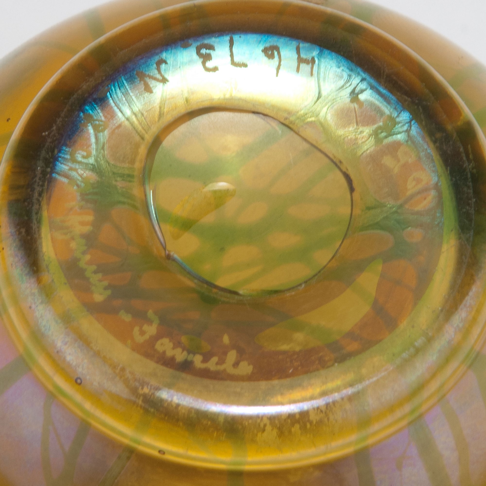 Stark bauchiger Korpus mit Trompetenhals. H. 7,6 cm. Bernsteinfarbenes Glas, aufgelegter Dekor aus grünen Blättern und Stengeln, stark gold- und perlmuttfarben mattlüstriert. Am Stand sign.: L.C. Tiffany Favrile 4673 N (gravierter Schriftzug).