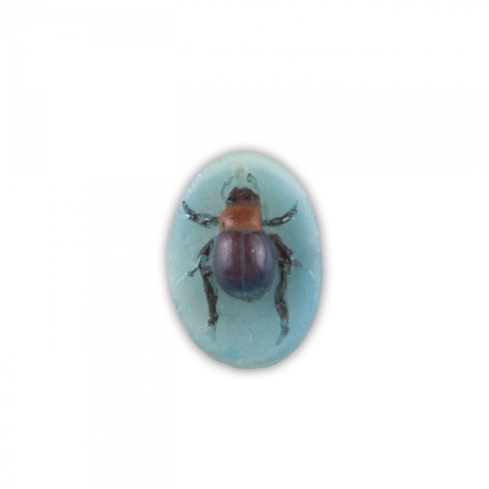 Oval. 4 x 2,8 cm. Pâte de verre, transluzide Glasmasse, vorwiegend hellblau, reliefierter Eremitenkäfer in braunen Tönen. Monogr.: AW N (geprägt).