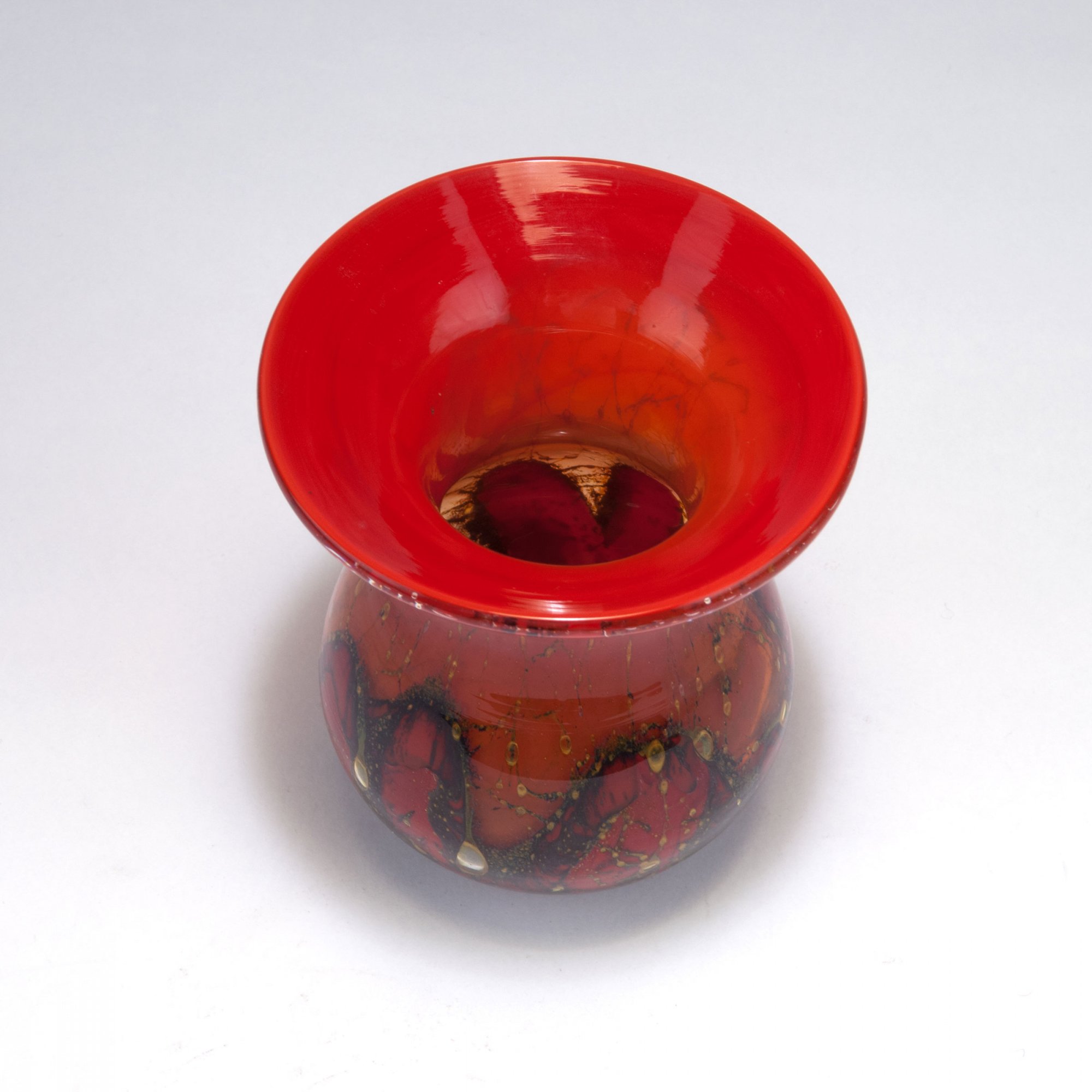 H. 12,7 cm. Überfangglas, farblos, rote Farbeinschlüsse und Oxideinschlüsse, Luftblasen.