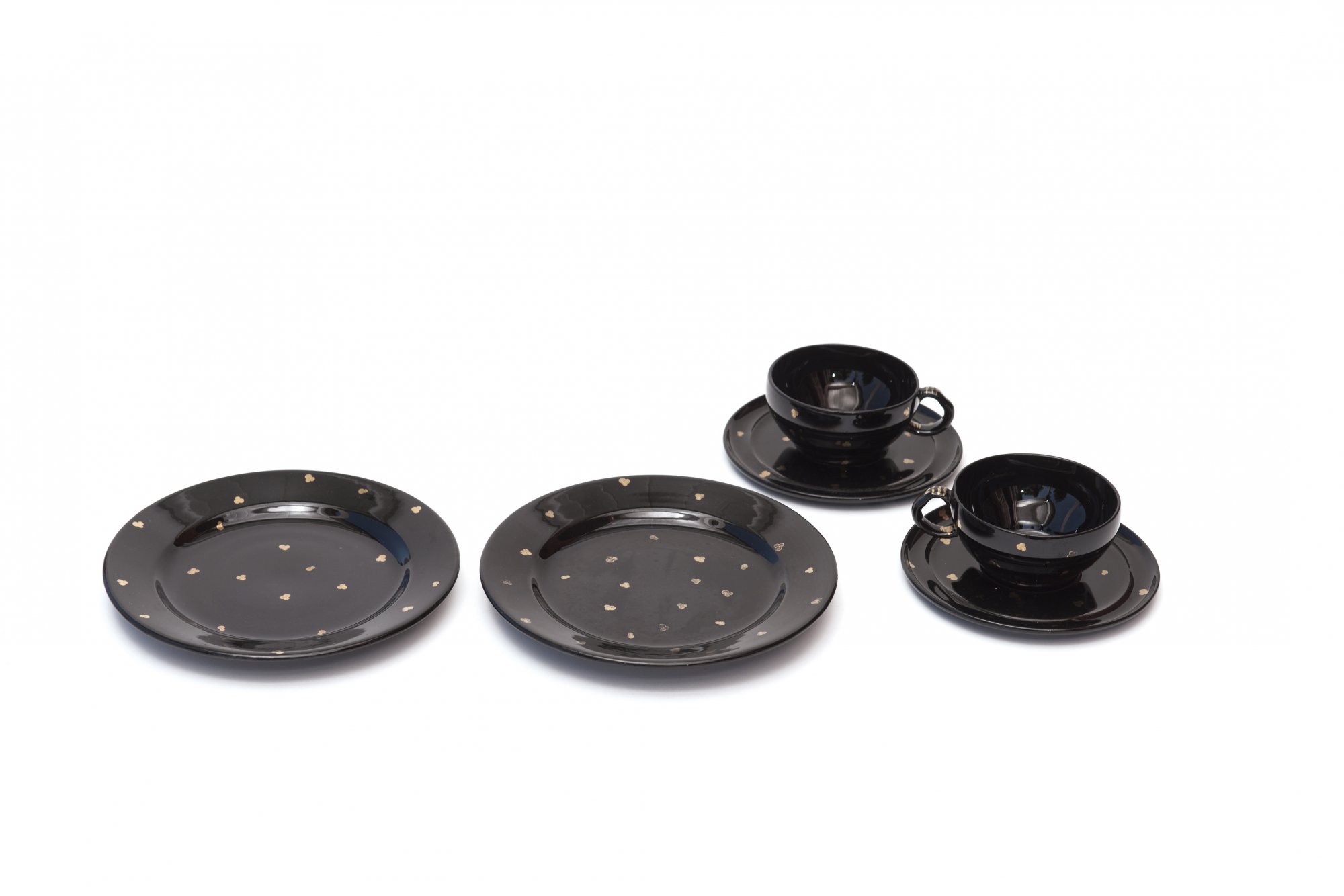 Zwei Tassen mit Untertellern, H. 4,8 cm; zwei Teller, Dm. 19,3 cm. Steingut, schwarz glasiert, goldbemalt. Bez.: Herstellermarke (gold gestempelt).