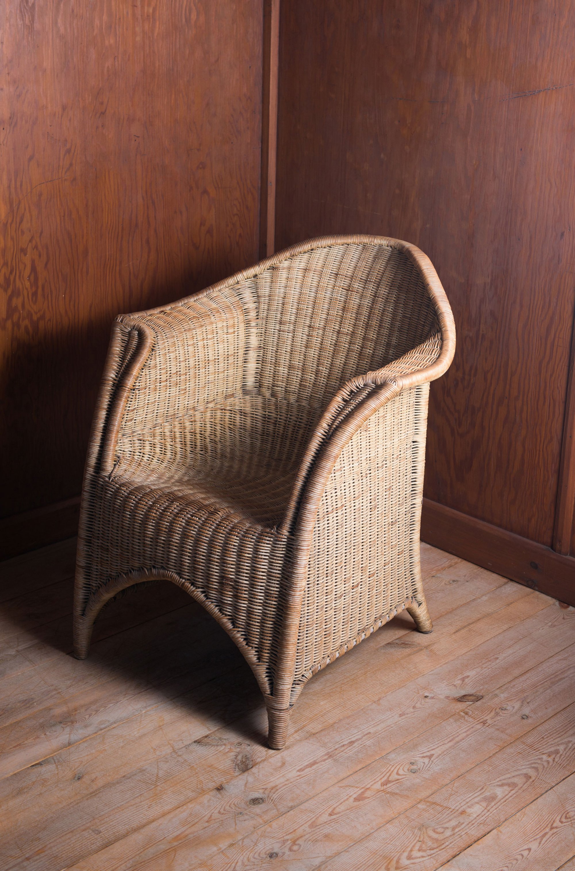 Sessel, H. 88 cm, 74,5 x 84,5 cm. Ottoman, H. 45 cm, 41 x 39 cm. Bambus, Rohrgeflecht.
