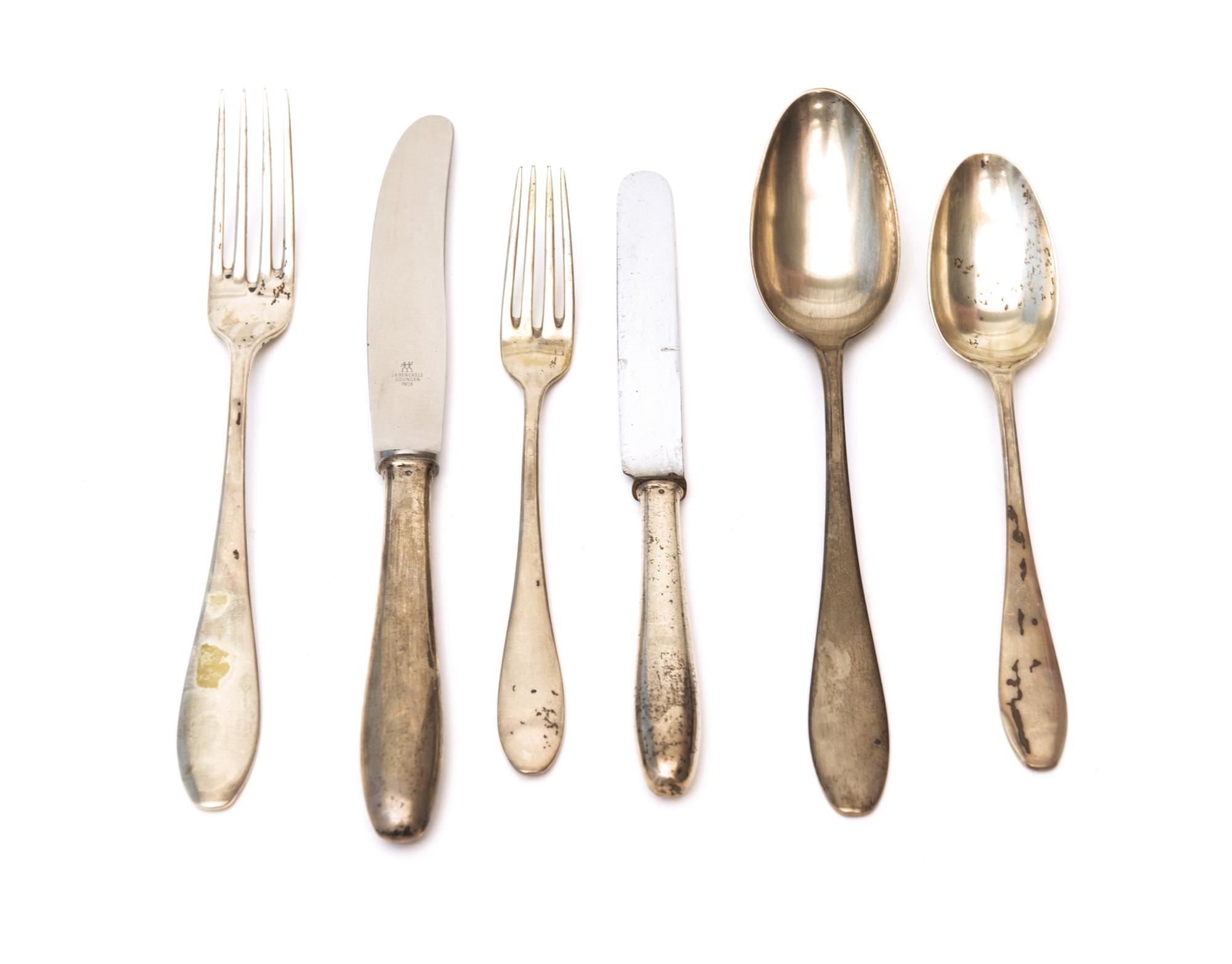 48 Teile. 11 große Suppenlöffel, L. 21,7 cm; 4 kleine Suppenlöffel, L. 18,6 cm; 10 Menügabeln, L. 21,8 cm; 8 kleine Gabeln, L. 18,1 cm; 10 Menümesser, L. 23,7 cm; 5 kleine Messer, L. 20,7 cm. Silber, Stahlklingen. Bez.: Mond, Krone 800, FOEHR (geprägt).