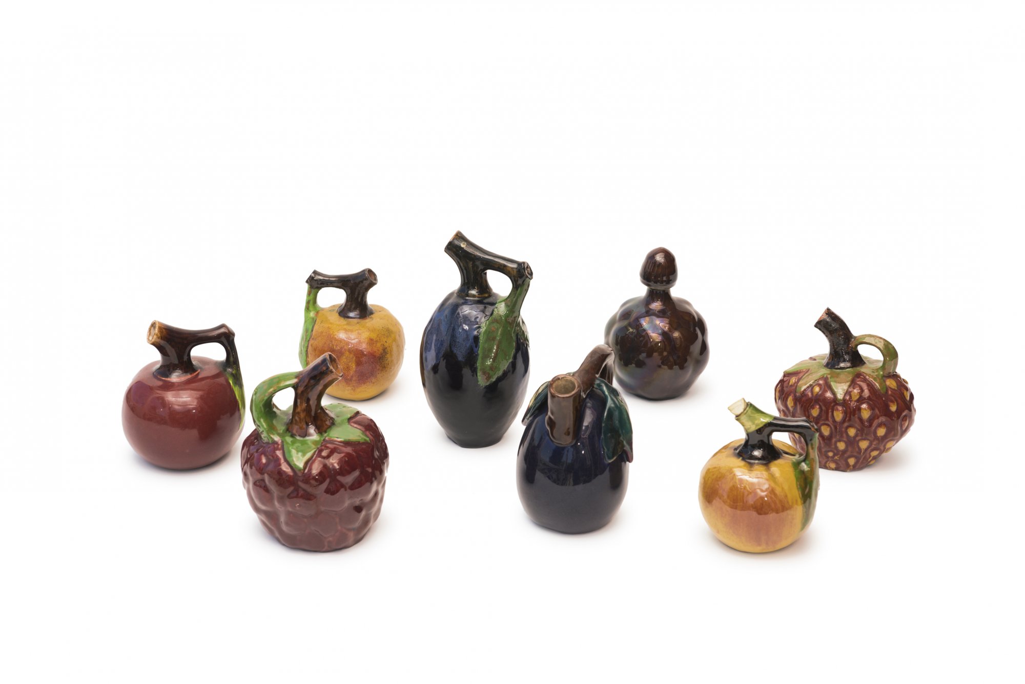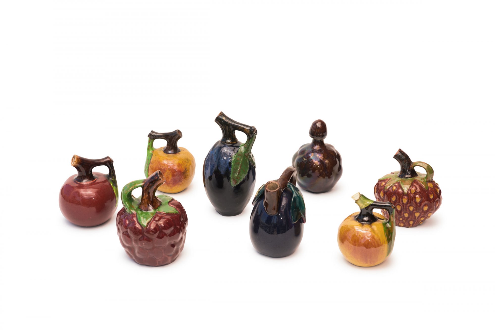 In verschiedenen Fruchtformen. H. 12,6-19,5 cm. Steingut, polychrom glasiert. Undeutl. bez.