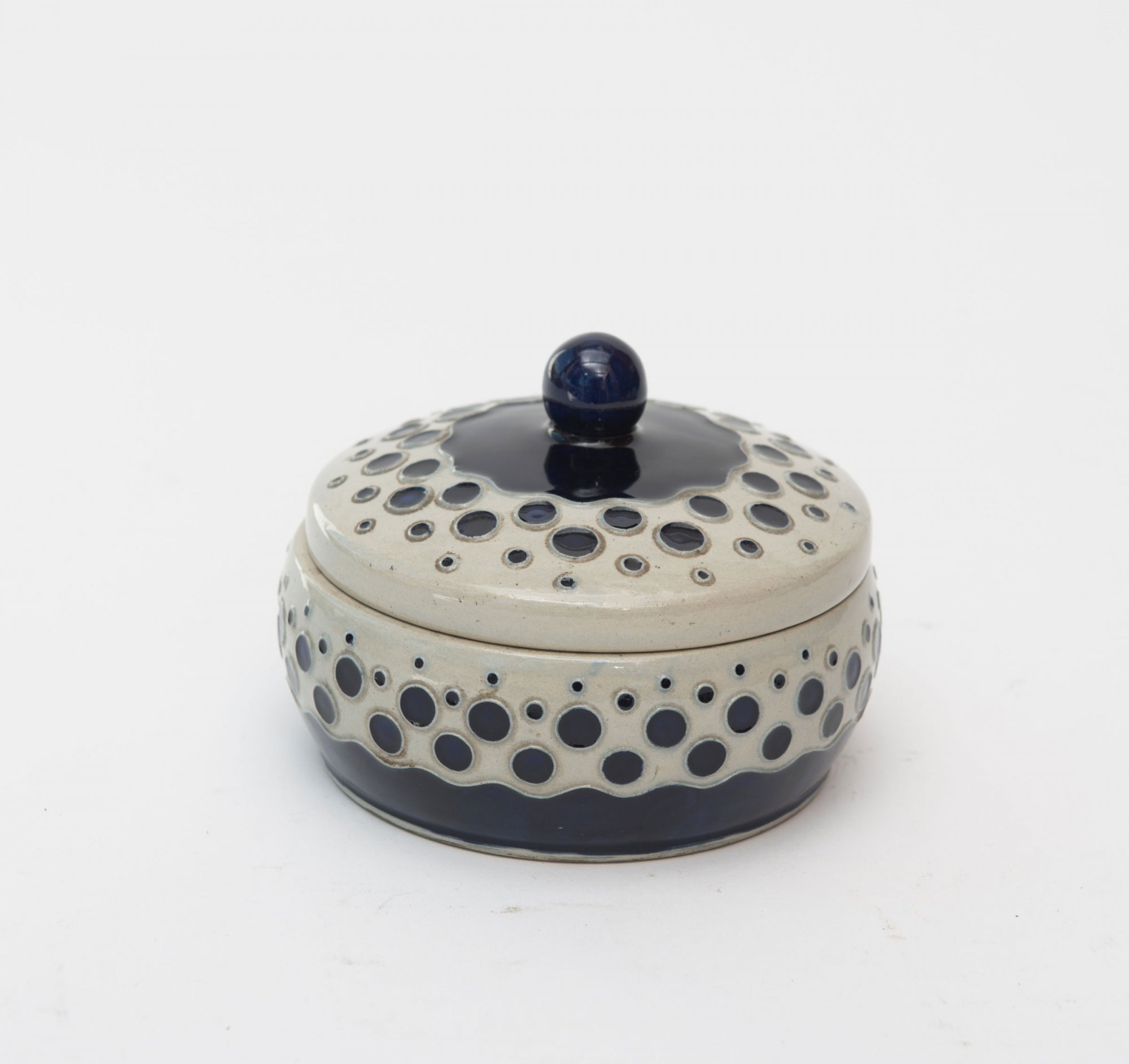 H. 9,3 cm, Dm. 12,5 cm. Heller Steinzeugscherben, kobaltblauer Reliefdekor. Bez.: R.MERKELBACH GRENZHAUSEN (zweizeilig, u.a.), 1730.