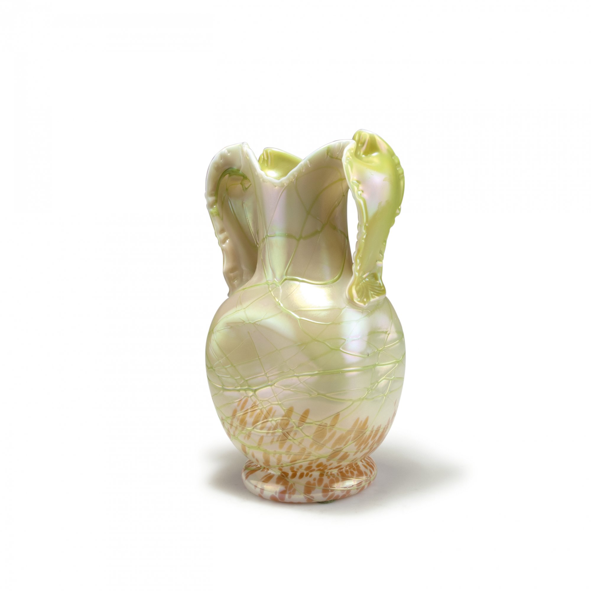 Vierfach eingedellter ovoider Korpus mit schlankem Hals, zweifach gespaltene, henkelartig ausgebildete Mündung. H. 35,5 cm. Überfangglas, opalweiß, im unteren Bereich orangefarbene Krösel, flächendeckende grüne Fadenauflage, irisiert.