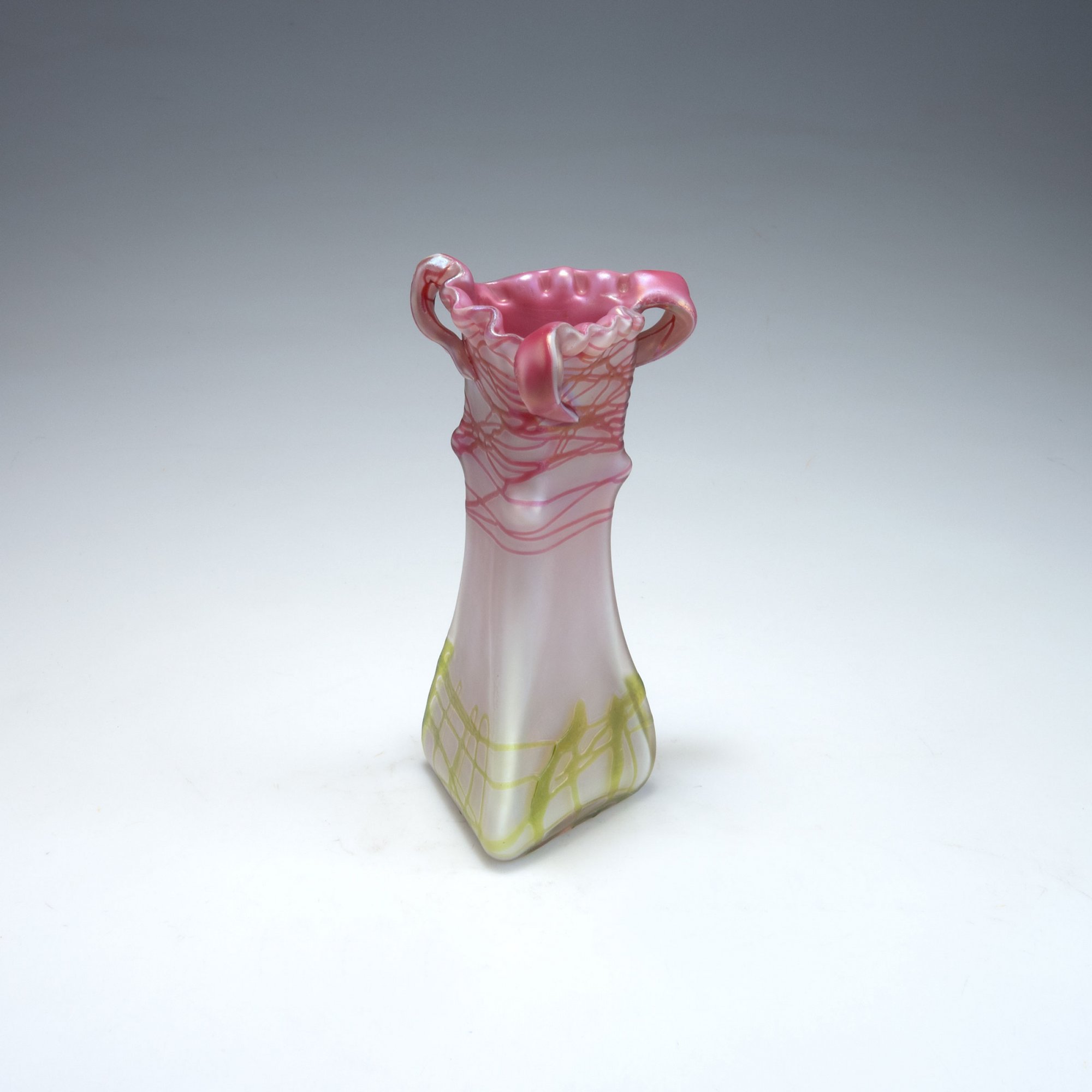 Dreikantiger Korpus mit dreifach henkelartig ausgezogener Mündung. H. 21,7 cm. Überfangglas, lachsrosa, opalweiß und farblos, im unteren Bereich grüne Fadenauflage, im oberen Bereich rosafarbene Fadenauflage, irisiert.