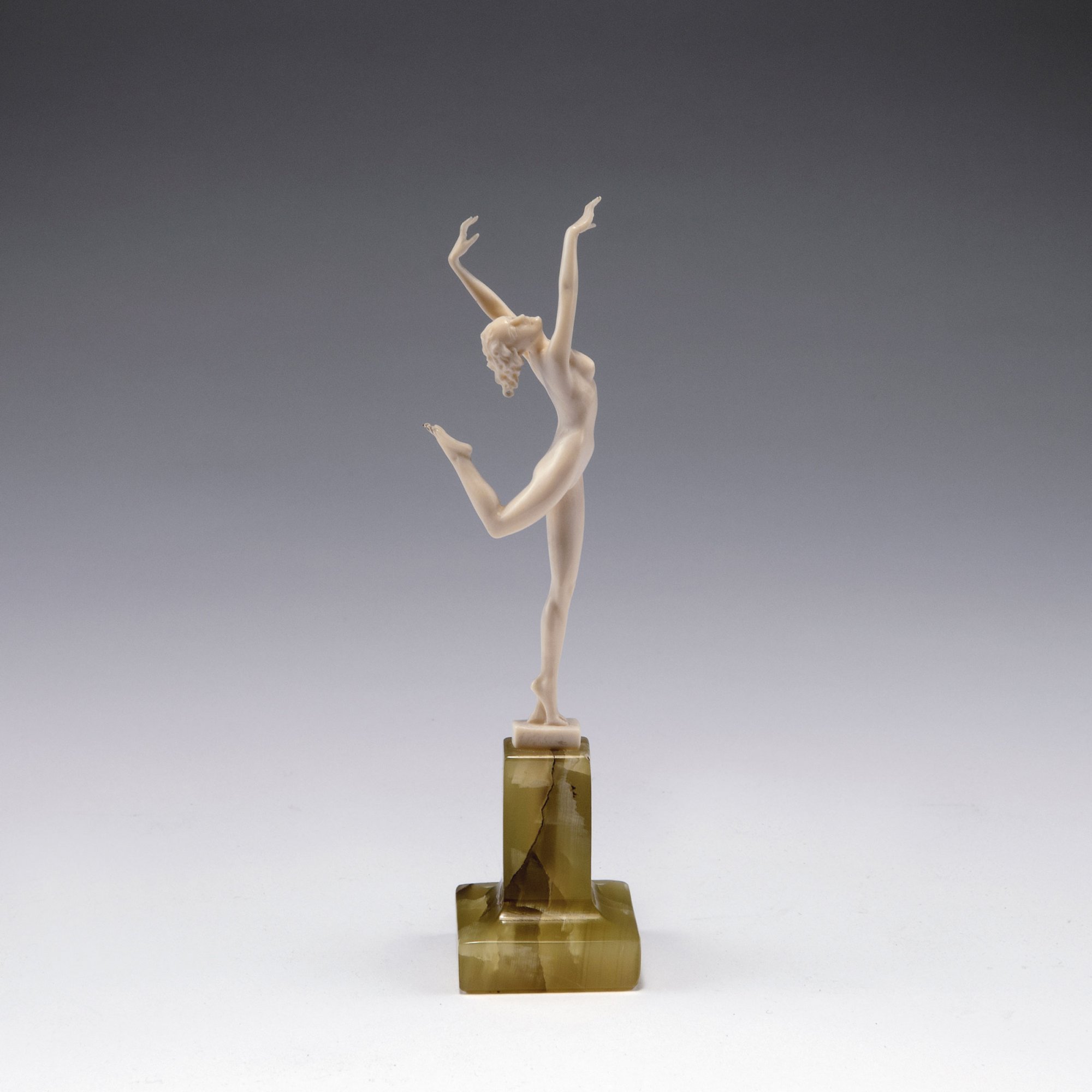 Unbekleidete Frauengestalt, in Pose auf einem Bein balancierend. H. 17,1 cm (inkl. Sockel). Geschnitztes Elfenbein, grüner Onyx. Plinthe bez.: F. Preiss.