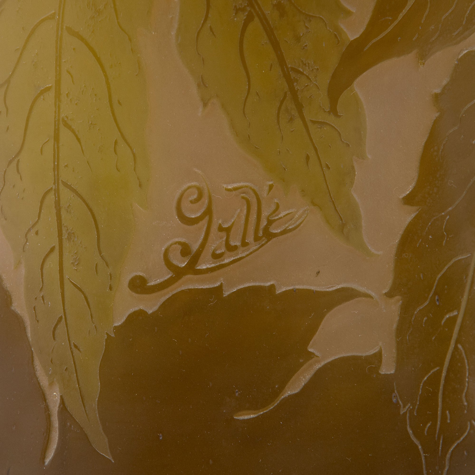 H. 62,3 cm. Überfangglas, farblos, opaleszent, rosa und olivgrün. Umlaufender, in mehreren Arbeitsgängen geätzter Dekor mit Doldenblüten. An der Wandung sign.: Gallé (hochgeätzter Schriftzug).