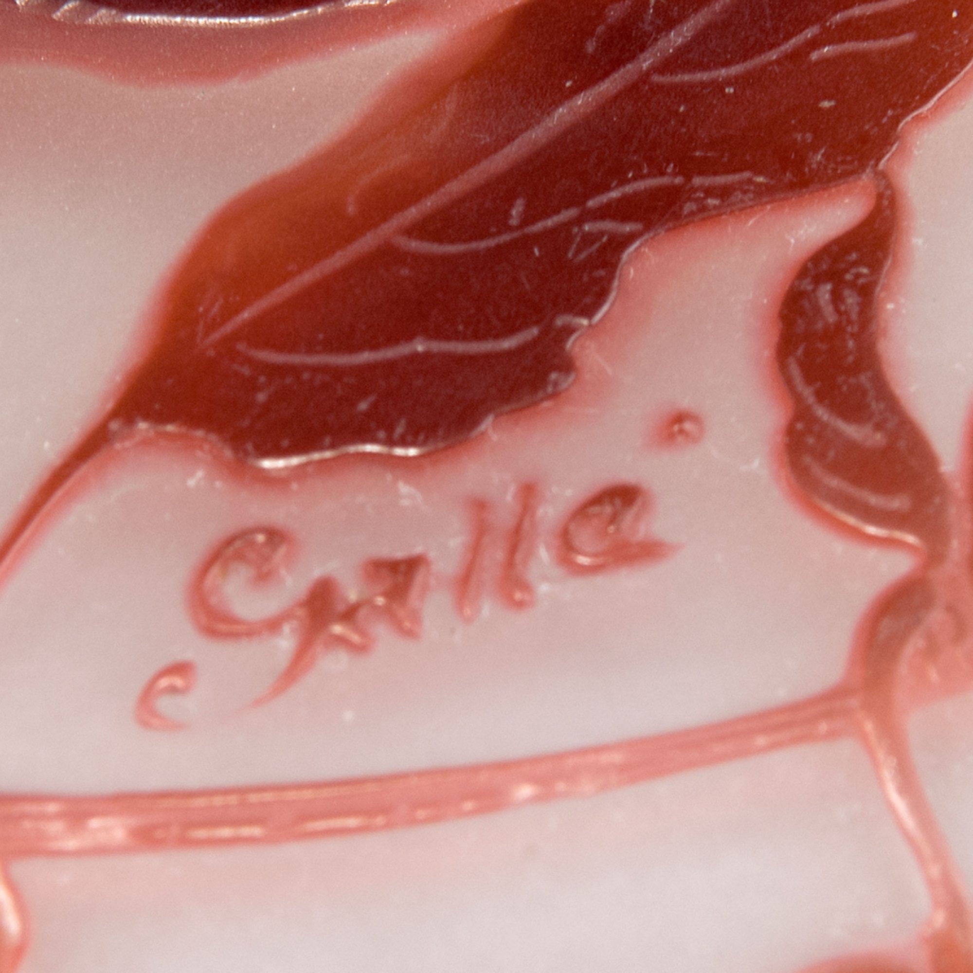 H. 5,4 cm, Dm. 10,5 cm. Überfangglas, farblos, gelb und rot. Geätztes Motiv mit Physalisranken. Sign.: Gallé (hochgeätzt).