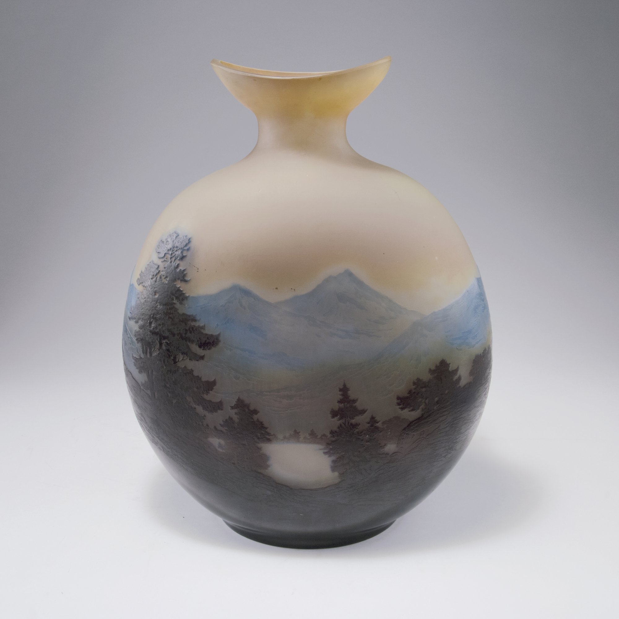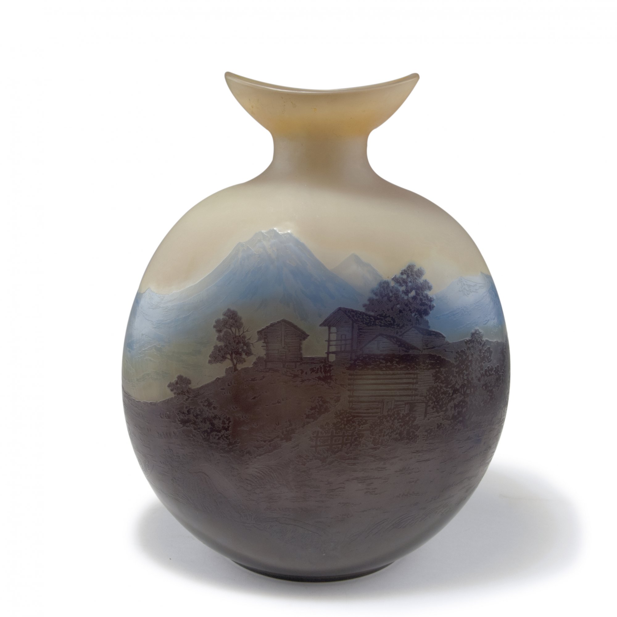 Stark flachgedrückter Korpus mit zweifach ausgezogener, spitzovaler Mündung. H. 43 cm. Überfangglas, bernsteinfarben, farblos und blau. In mehreren Arbeitsgängen geätzter Dekor. Motiv einer Vogesenlandschaft mit See und Gehöft in abendlicher Stimmung. Sign.: Gallé (hochgeätzter Schriftzug).