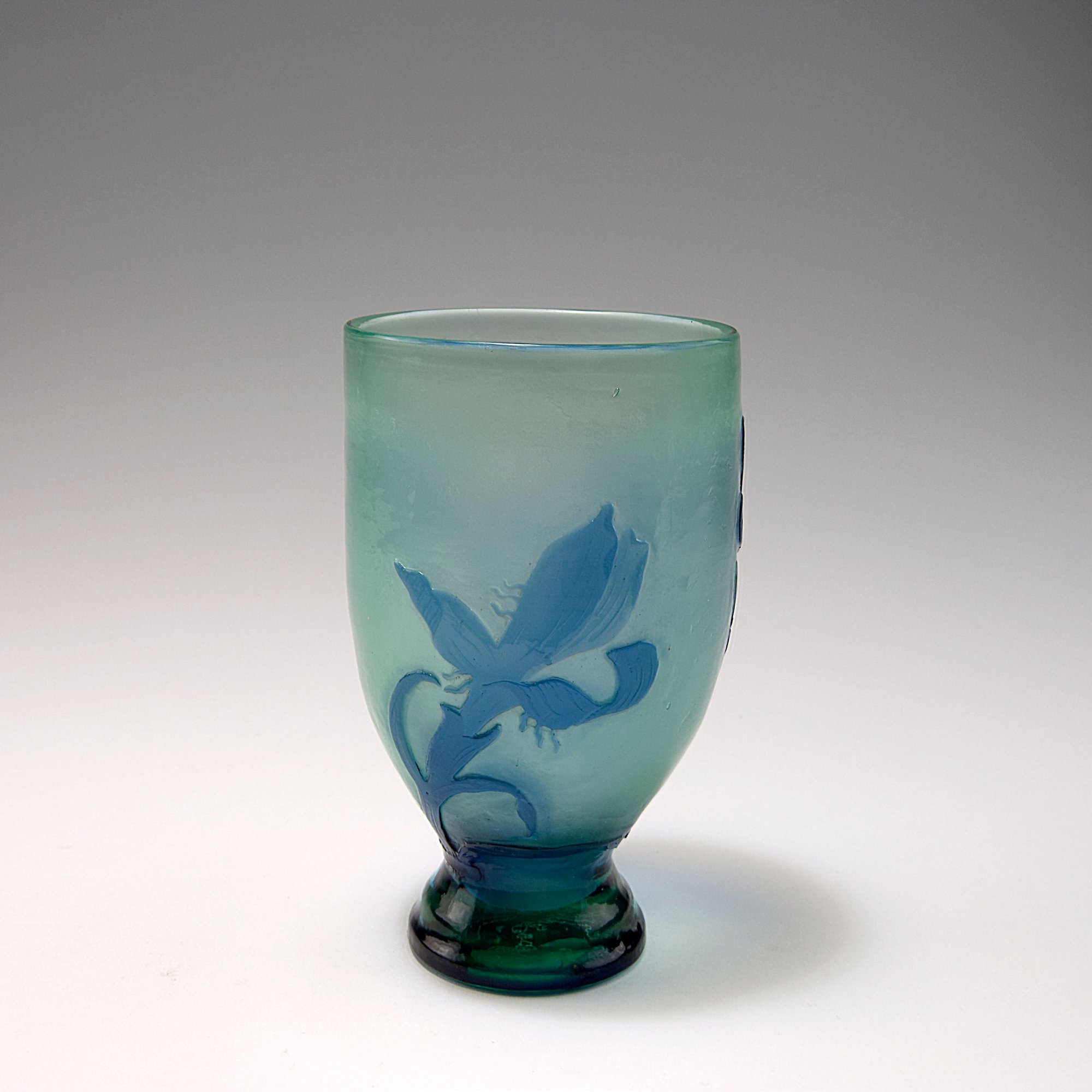 H. 16,2 cm. Überfangglas, leicht grünlich, farblos und blau. In mehreren Arbeitsgängen geätzter Dekor, Motiv mit blühendem Krokus, Innenwandung mattgeätzt. Im ausgeschliffenen Abriß sign.: Gallé déposé (Schriftzug in Nadelätzung).