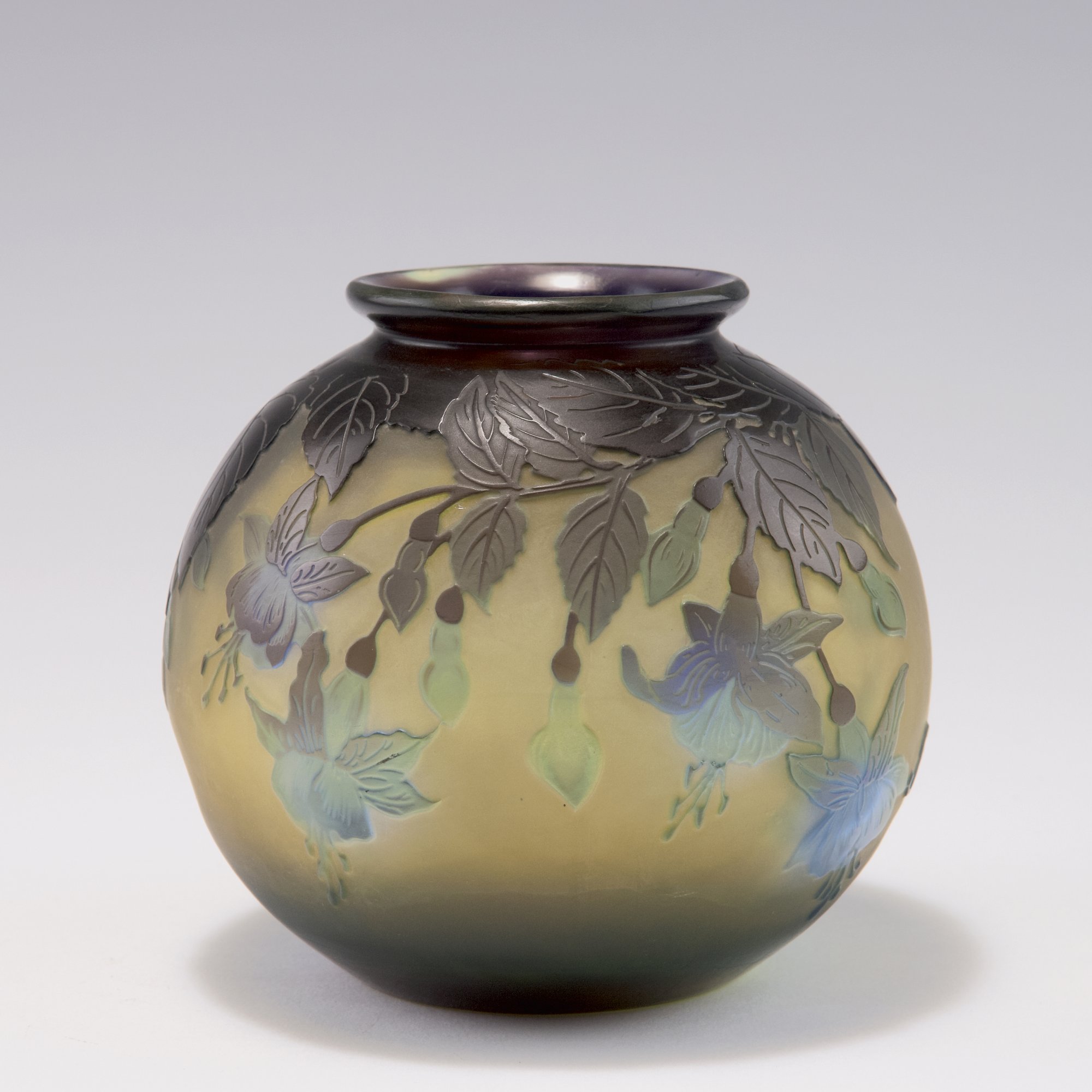 H. 11 cm. Überfangglas, farblos, gelb und blau. In mehreren Arbeitsgängen geätztes Motiv mit blühenden Fuchsien. Sign.: Gallé (hochgeätzter Schriftzug).