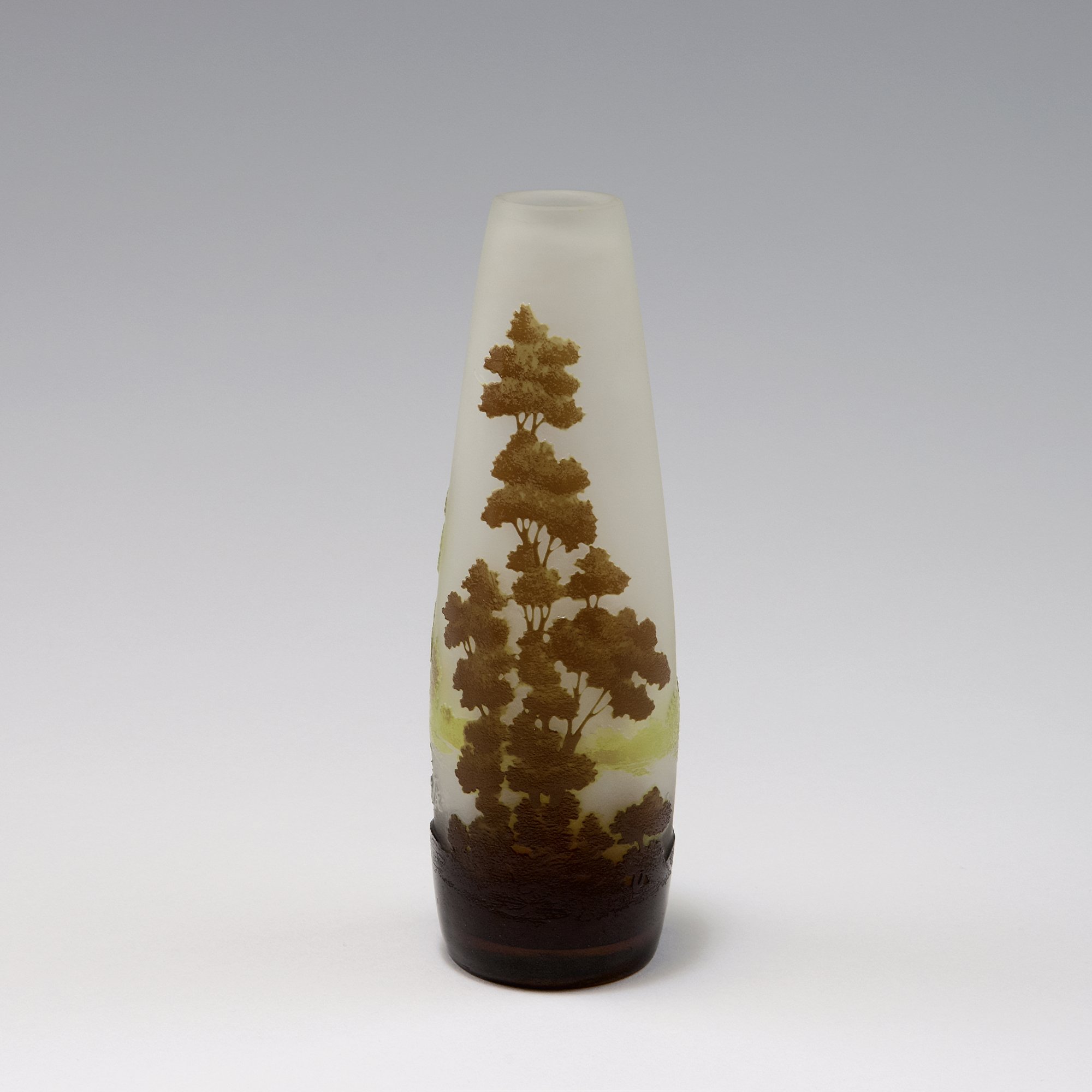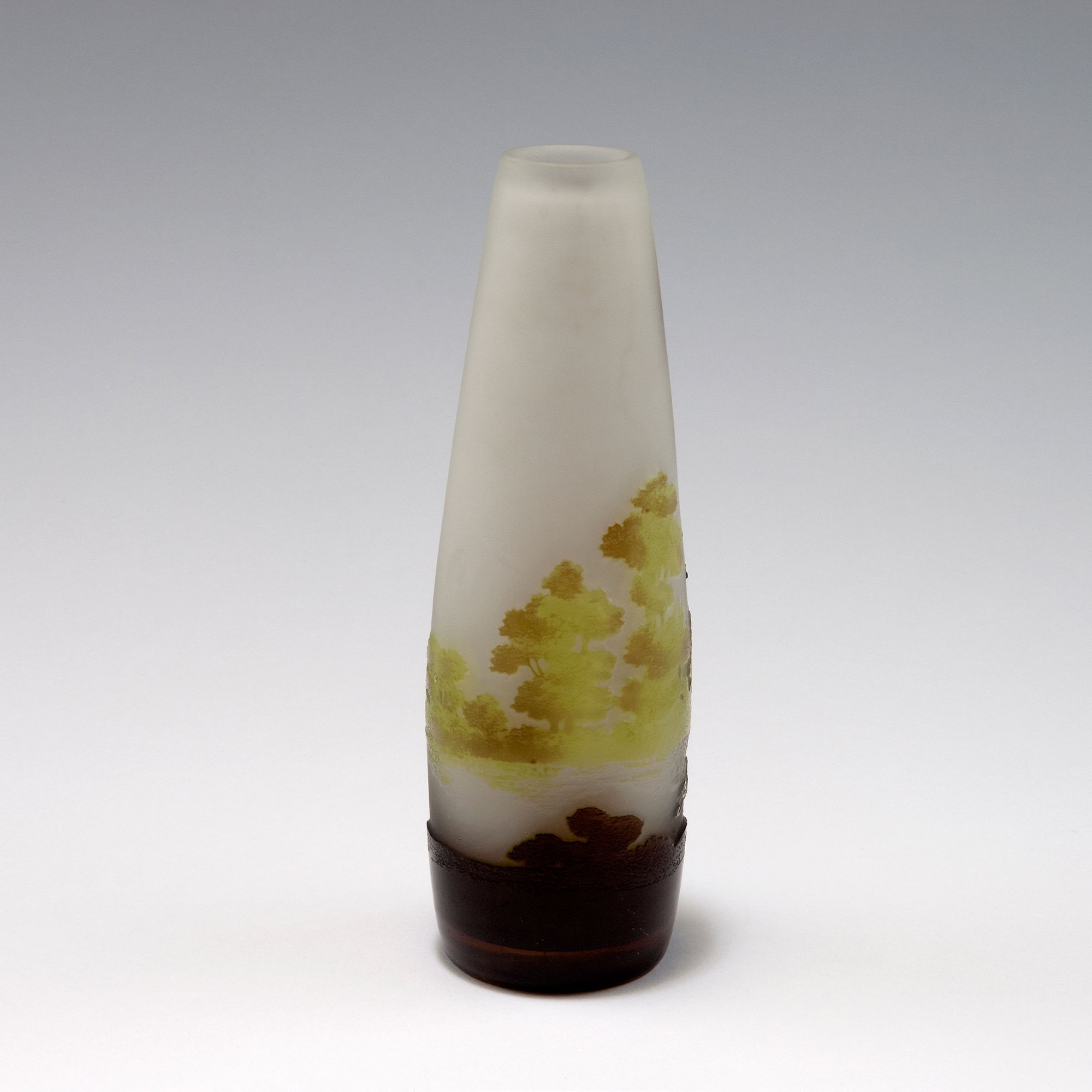 H. 17,2 cm. Überfangglas, farblos, grün und braun. Geätztes Motiv mit Auenlandschaft. An der Wandung sign.: Gallé (hochgeätzt).