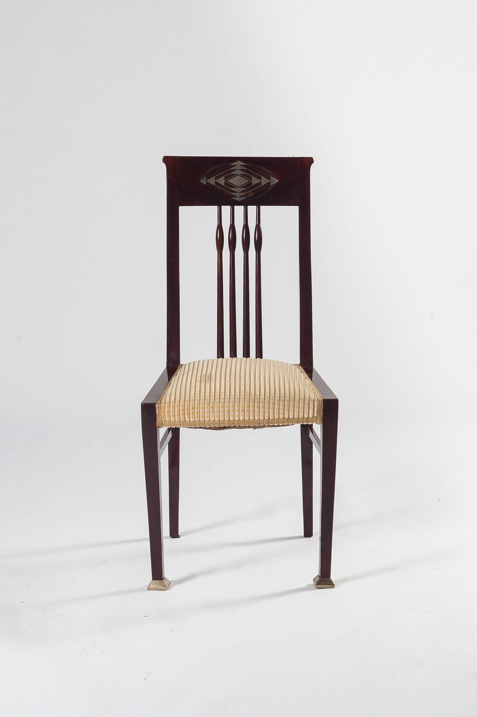 H. 90 cm, 42,5 x 47 cm. Ausführung: Ludwig Schäfer, Mainz (zugeschrieben). Mahagoni, Mahagonifurnier, Aluminiumeinlage, Messingschuhe, gelber Cordsamtbezug.