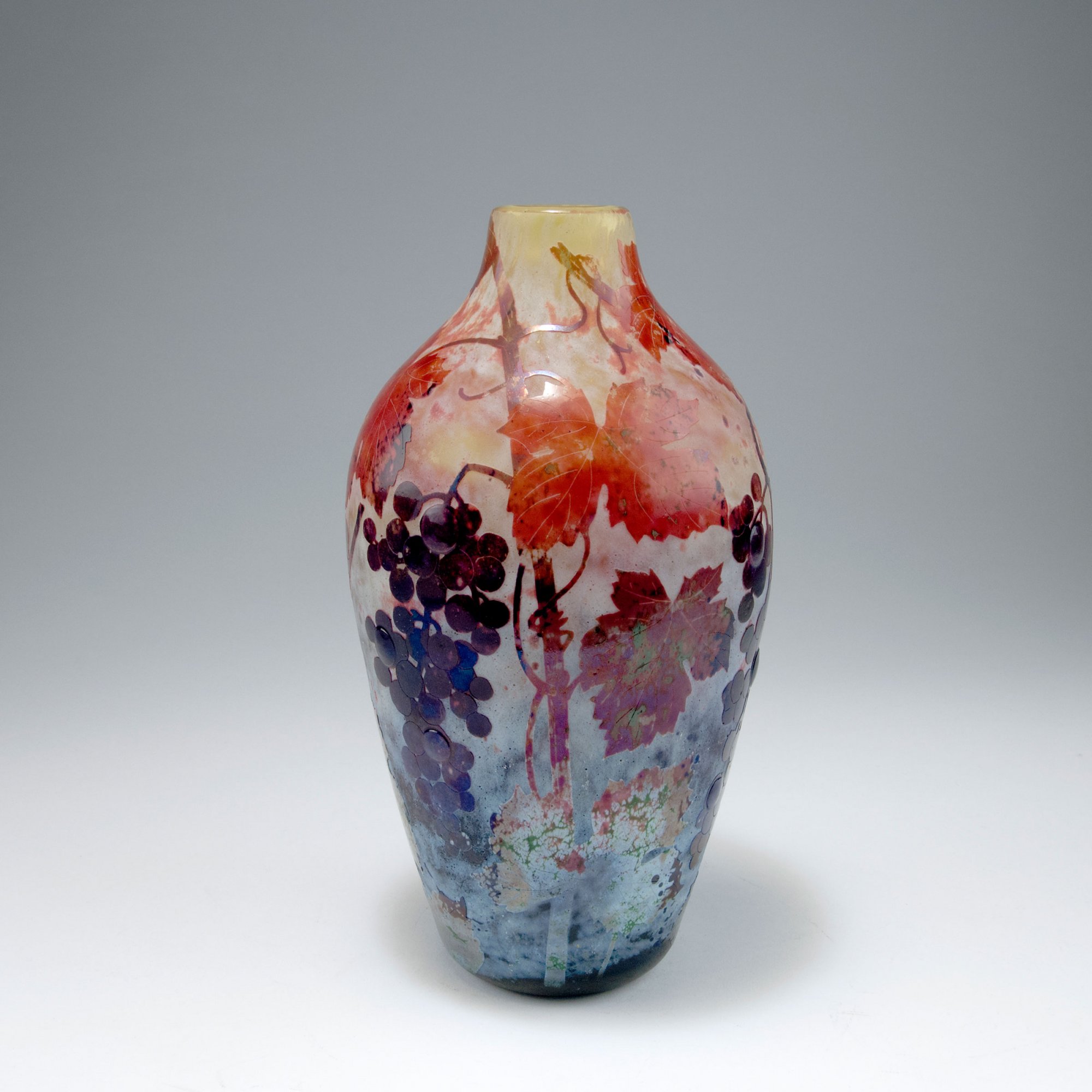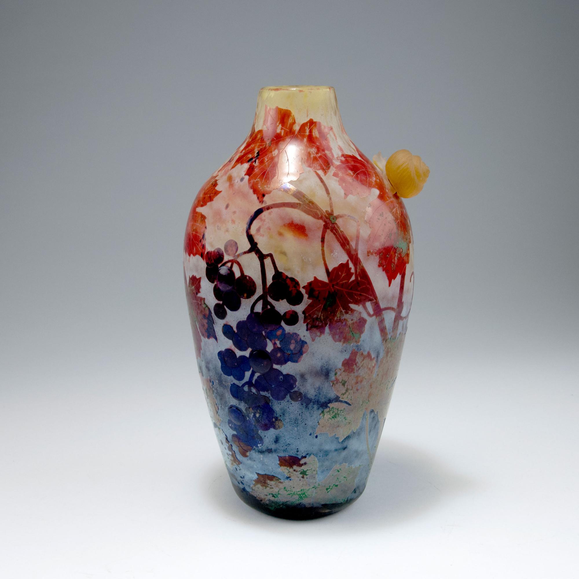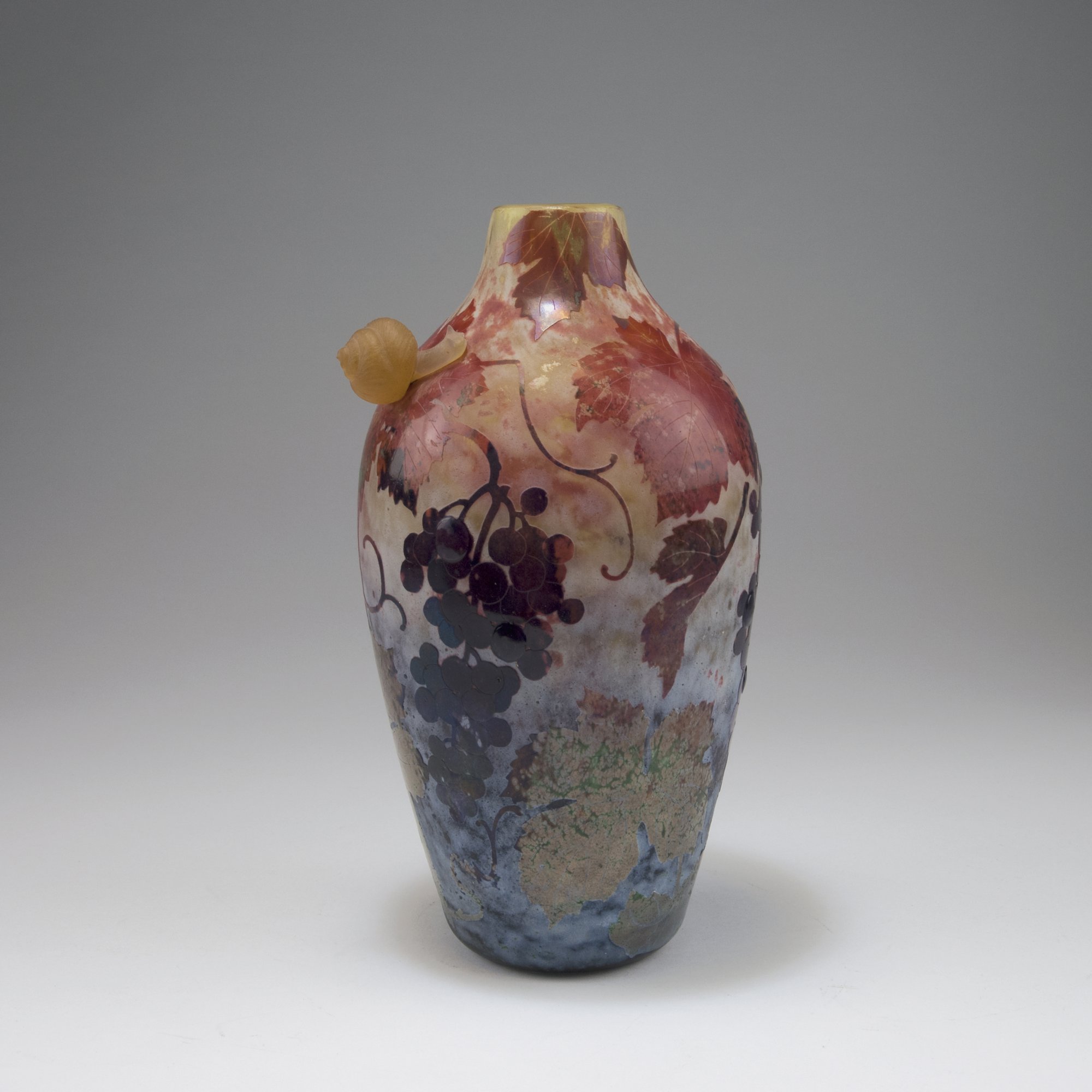 Ovoider Korpus mit einschwingender Mündung. H. 27,7 cm. Entwurf: Henri Bergé. Überfangglas, farblos, gelbliche und blaue Pulvereinschlüsse, rote, tiefblaue, braune und grüne Emailaufschmelzungen (vitrifications). In mehreren Arbeitsgängen geätzter Dekor, Motiv mit herbstlichen Weinranken, sieben Weintrauben als applizierte Cabochons, im oberen Bereich eine applizierte, auf einem Blatt kriechende Weinbergschnecke, mit dem Rad überarbeitet, rauh ausgeätzter Grund, Dekor partiell metallisch irisiert. Im ausgeschliffenen Abriß sign.: DAUM NANCY, Lothringer Kreuz (gravierter Schriftzug, goldberieben).