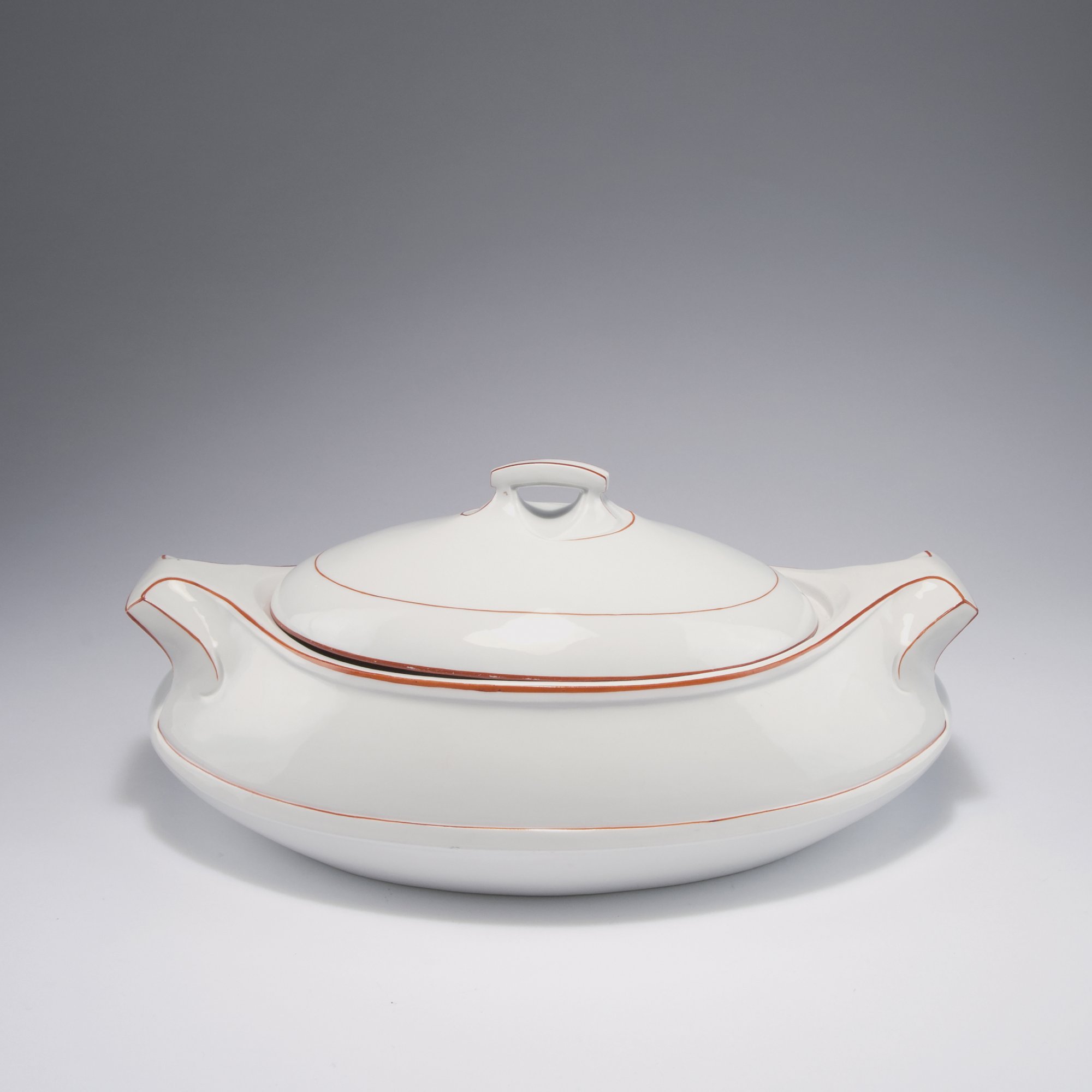 Oval mit eckigen Handhaben, flacher Deckel. H. 16 cm, 36,3 x 23 cm. Ausführung: Königl. Porzellanmanufaktur Meissen, vor 1924. Porzellan, weiß, glasiert, reliefierter Peitschenhiebdekor, rote Aufglasur. Bez.: Knopfschwerter (blau, unter Glasur, zweifach gestrichen), Künstlersignet (geprägt), Gemüsenapf No. 1 (geritzt).