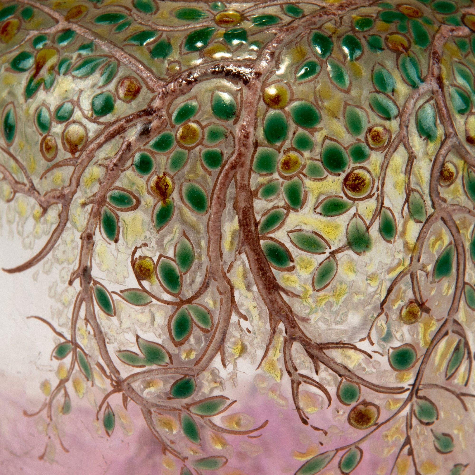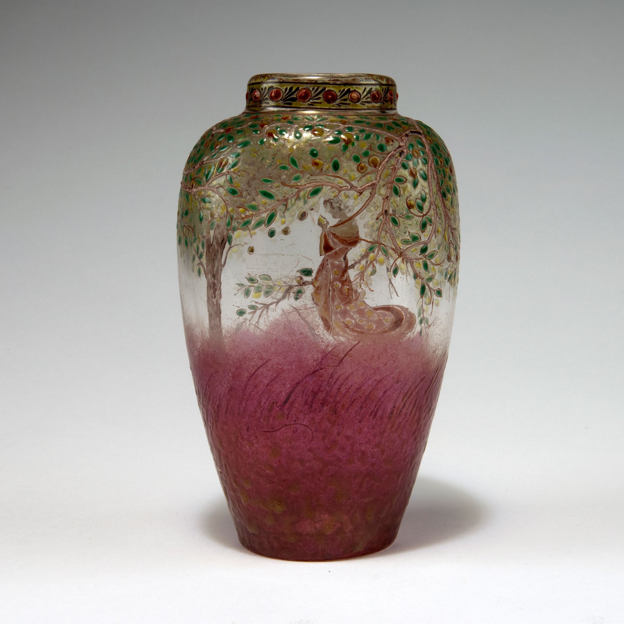 Ovoider Korpus mit beidseitig abgeflachter Wandung. H. 14,9 cm. Farbloses Glas, im unteren Bereich rosafarbene Aufschmelzungen. In feiner Emailmalerei ausgeführter Dekor. Motiv einer Ostasiatin unter einem Apfelbaum stehend. Sign.: Gallé (Schriftzug in Schwarzlot).