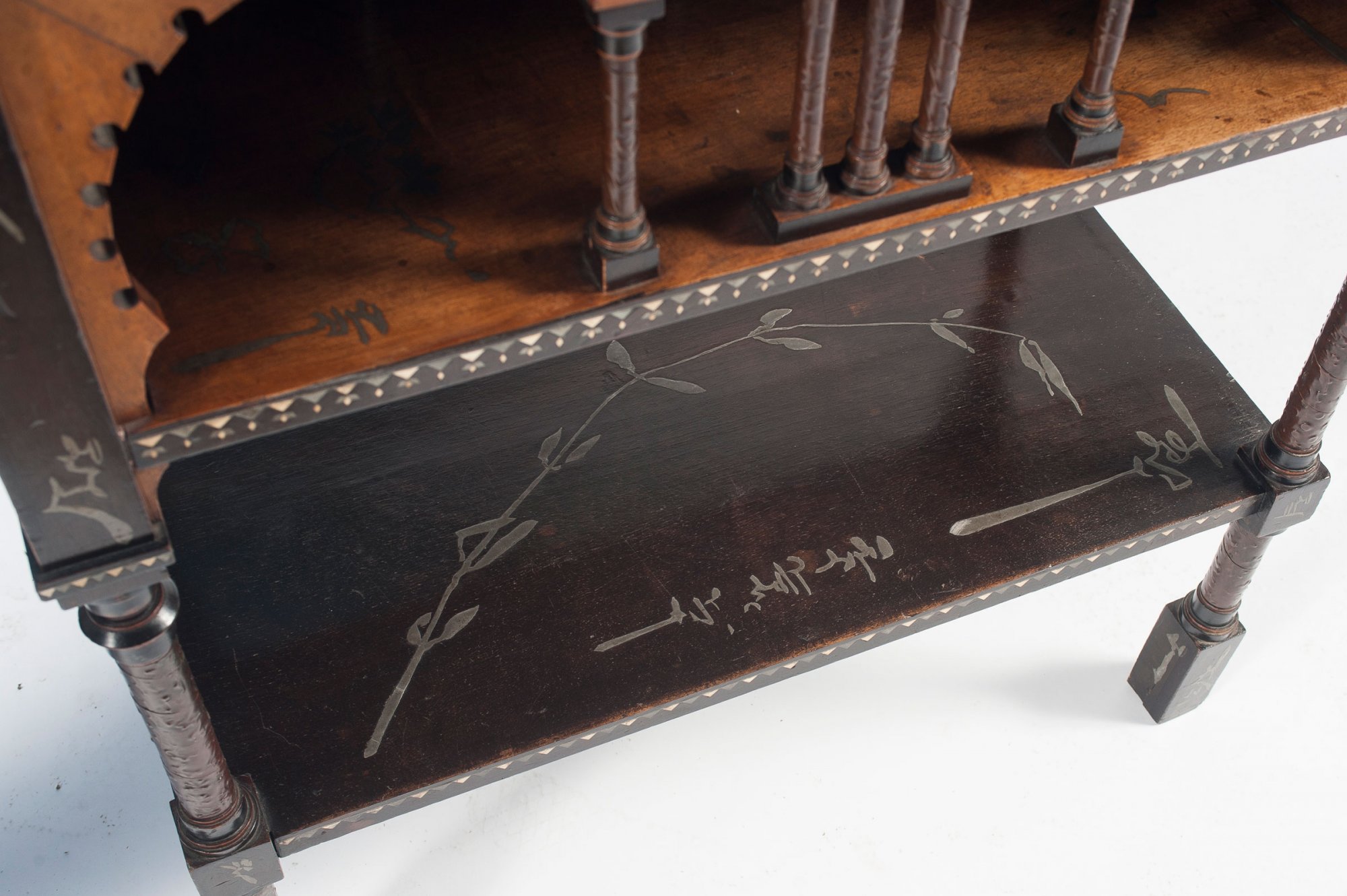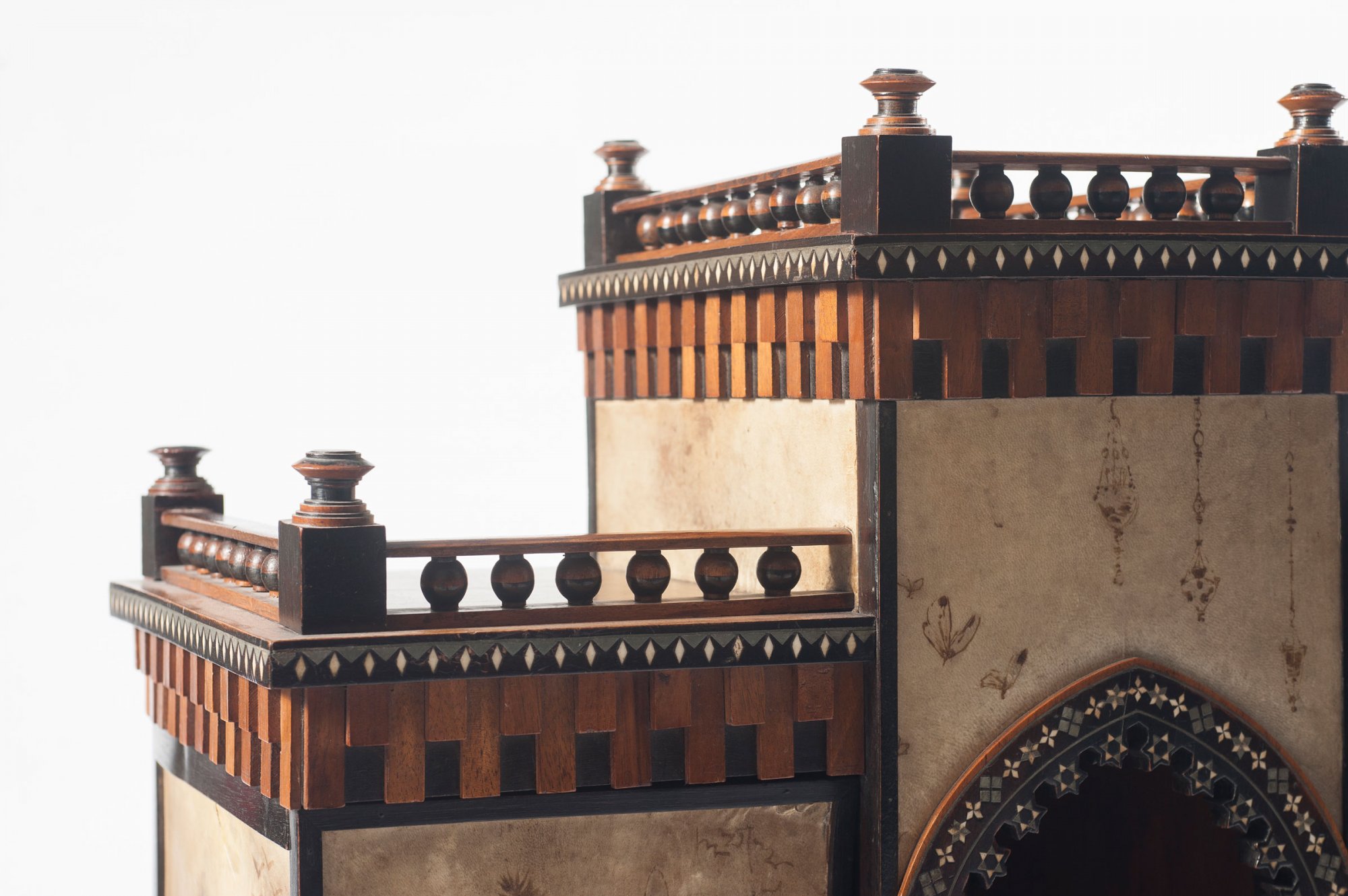 Mehrstöckiger Aufbau. Auf vier schlanken, durch Klötzchen gegliederten Beinen kleine Arkatur mit Hufeisenbögen. Leicht zurückgesetzter Aufsatz, mittig erhöhtes Fach mit Hufeisenbogen auf schlanken Säulen, profiliertes Gesims mit Zahnschnitt, seitlich Schrankteile mit Flügeltüren, analog gestaltete Gesimse mit Balustraden. H. 170,5 cm, 75 x 38 cm. Unterschiedliche Edelhölzer, darunter Ebenholz und Mahagoni. Einlagen aus Zinn und Bein, Motive mit arabischen Schriftzeichen, Pflanzen und Hängeampeln. Vorne und an den Seiten getriebene Scheiben aus Kupfer in intarsierter Rahmung. Auf den Türfüllungen orientalisierende Genregemälde von Riccardo Pellegrini, rechts Orientalin mit Tamburin, links zwei Raucher, unten sign.