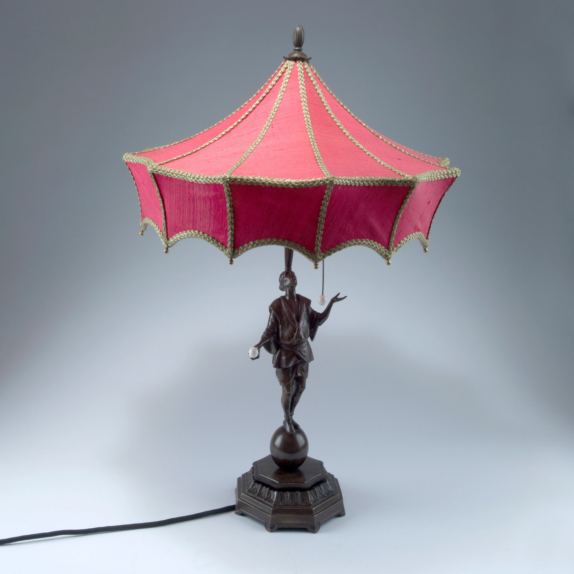 Jongleur auf achteckigem Stand, den asiatisch anmutenden Schirm auf der Stirn balancierend, eine Kugel in der Hand, die anderen, wie in die Luft geworfen, als einzeln zu bedienende Lampenschalter. H. 67 cm, Dm. 44 cm. Bronze, dunkel patiniert. Kugeln aus Elfenbein. Nicht bez.