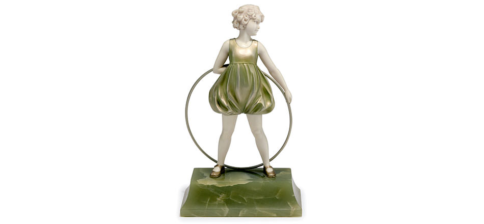 Schon auf der Leipziger Messe 1930 fand das Mädchen mit Reif ‚Hoop Girl’ von Ferdinand Preiss (€4.400-5.000) große Beachtung. Die umfangreiche Offerte von Bronzen und Chryselephantin-Skulpturen wird durch ein großes und hochkarätiges Angebot von Keramik- und Pozellanfiguren ergänzt. Zwei ‚Sommer‘-Putten von Michael Powolny werden in unterschiedlicher Bemalung mit €5.000-8.000 bzw. 6.000-9.000 angeboten. Eine große Rarität ist eine Modedame, die Annie Offterdinger 1914 für die Wächtersbacher Keramikmanufaktur schuf und die nun mit €5.000-6.000 im Angebot ist.