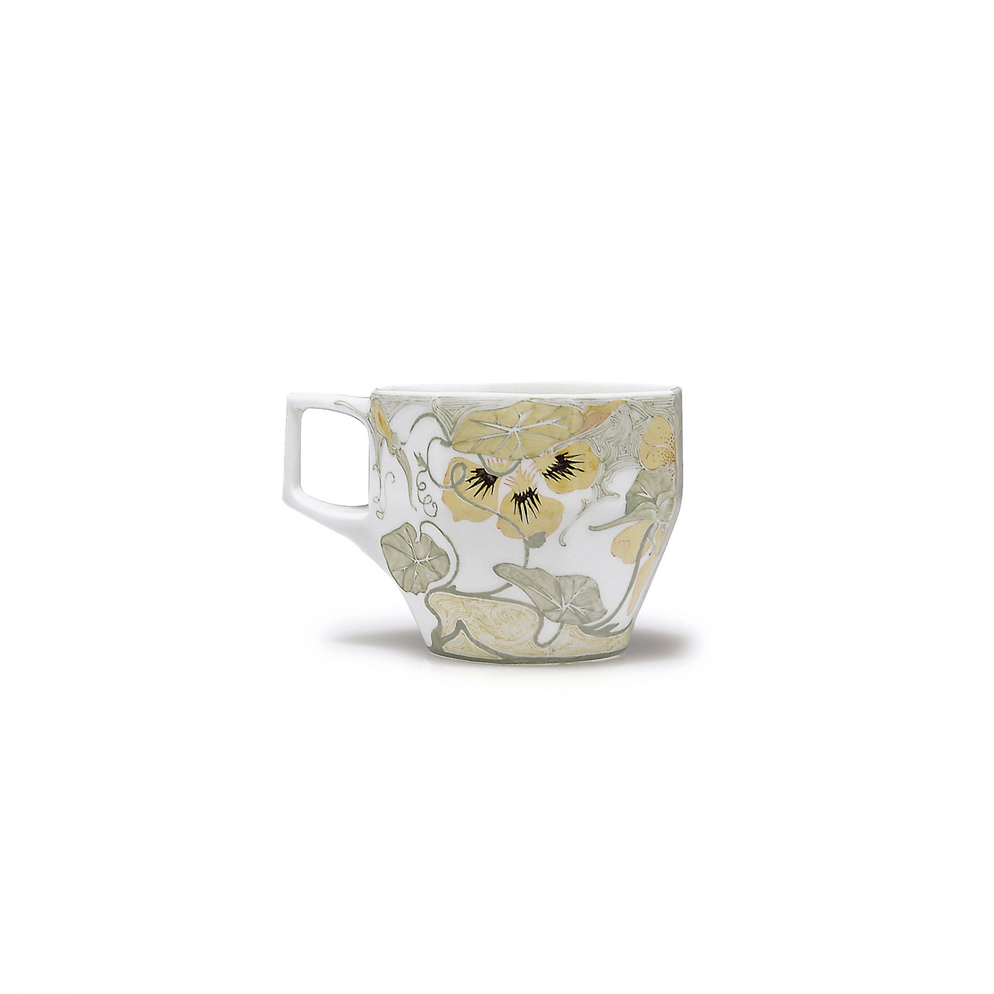 Auf rundem Stand achteckig gerippter, sich am Ansatz erweiternder Korpus, eckiger Henkel. H. 5,7 cm. Ausführung: Haagsche Plateelbakkerij Rozenburg, Den Haag. Eierschalenporzellan, weißlicher Scherben. Polychrome Glasurmalerei. Kapuzinerkresse. Bez.: Storchenmarke mit Krone Rozenburg den Haag (grauer Glasurstempel), Jahreszeichen für 1909/10, Fenster 489, SS, B (schwarz, gemalt).