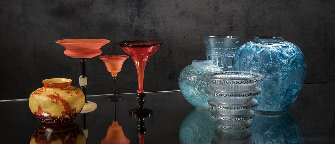Die Gegenüberstellung zweier der wichtigsten Glasmanufakturen des Art Déco, enthüllt die Vielfältigkeit dieser Epoche. Die Entwürfe René Laliques fokussieren die Form des Objekts, verewigt in monochromer, teils opaleszenter Glasmasse. Schlichte Eleganz wohnt den skulptural anmutenden Objekten inne. Ein Spiel von Farbe und Struktur findet sich hingegen bei Charles Schneider. Malerische Pulvereinschlüsse stehen geätzten Dekoren mit grafischem Charakter gegenüber.