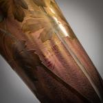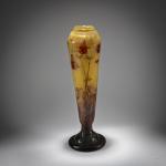 H. 52,5 cm. Überfangglas, farblos mit gelben und tiefvioletten Pulvereinschlüssen. Geätzter und polychrom emaillierter Dekor mit blühender Akelei. Sign.: DAUM NANCY, Lothringer Kreuz (hochgeätzt).