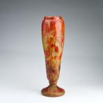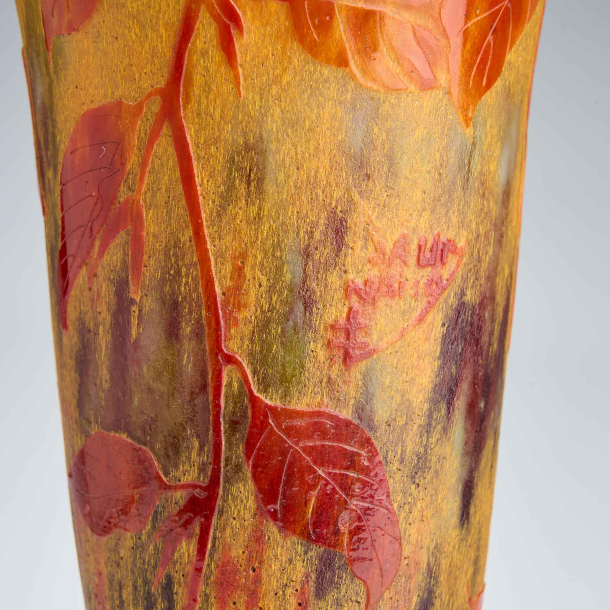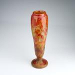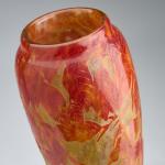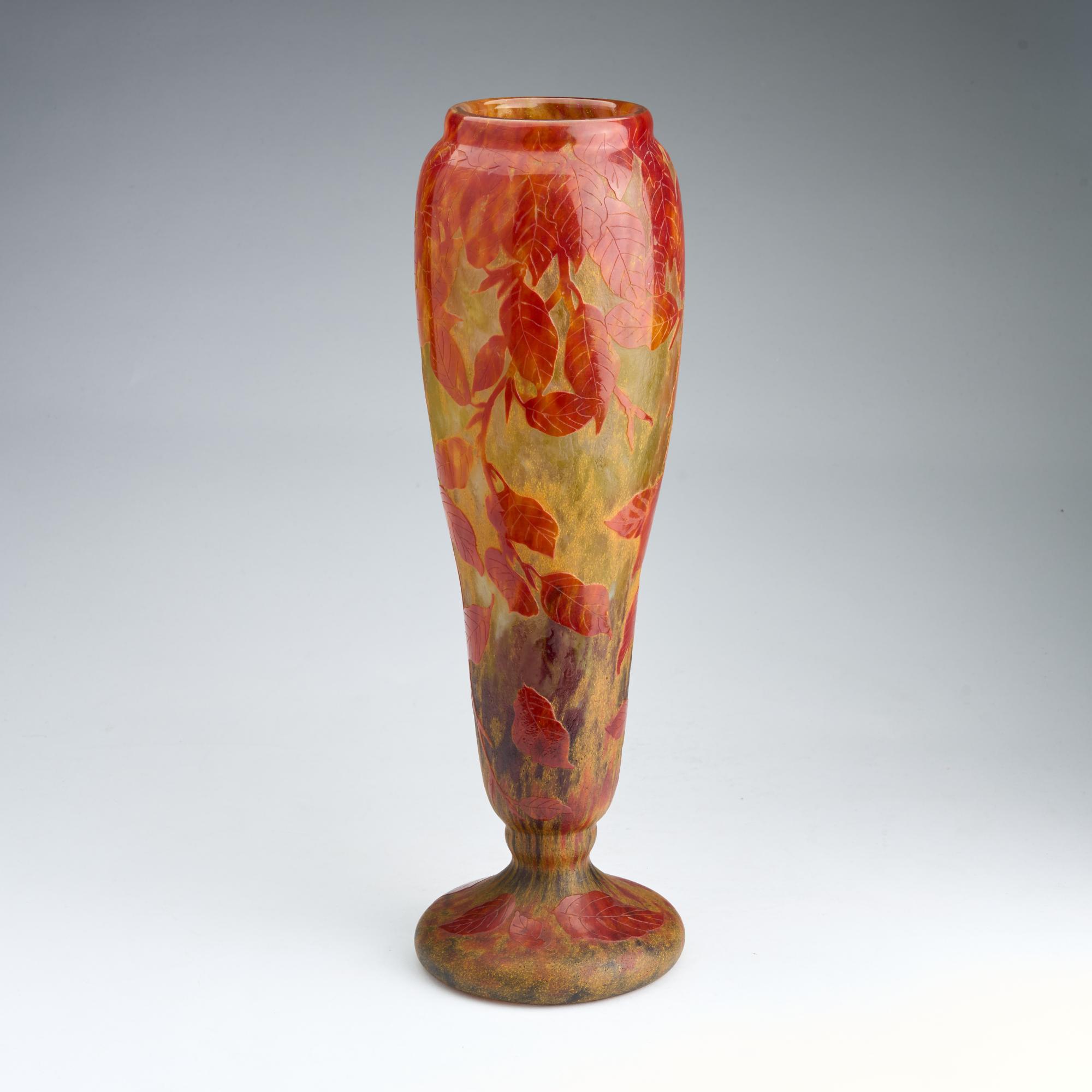 H. 35,5 cm. Überfangglas, farblos, milchweiße und gelbe Pulvereinschlüsse, rostbraune Emailaufschmelzungen. Geätzter Dekor mit herbstlichen Blättern. Sign.: DAUM NANCY, Lothringer Kreuz (hochgeätzt).