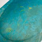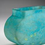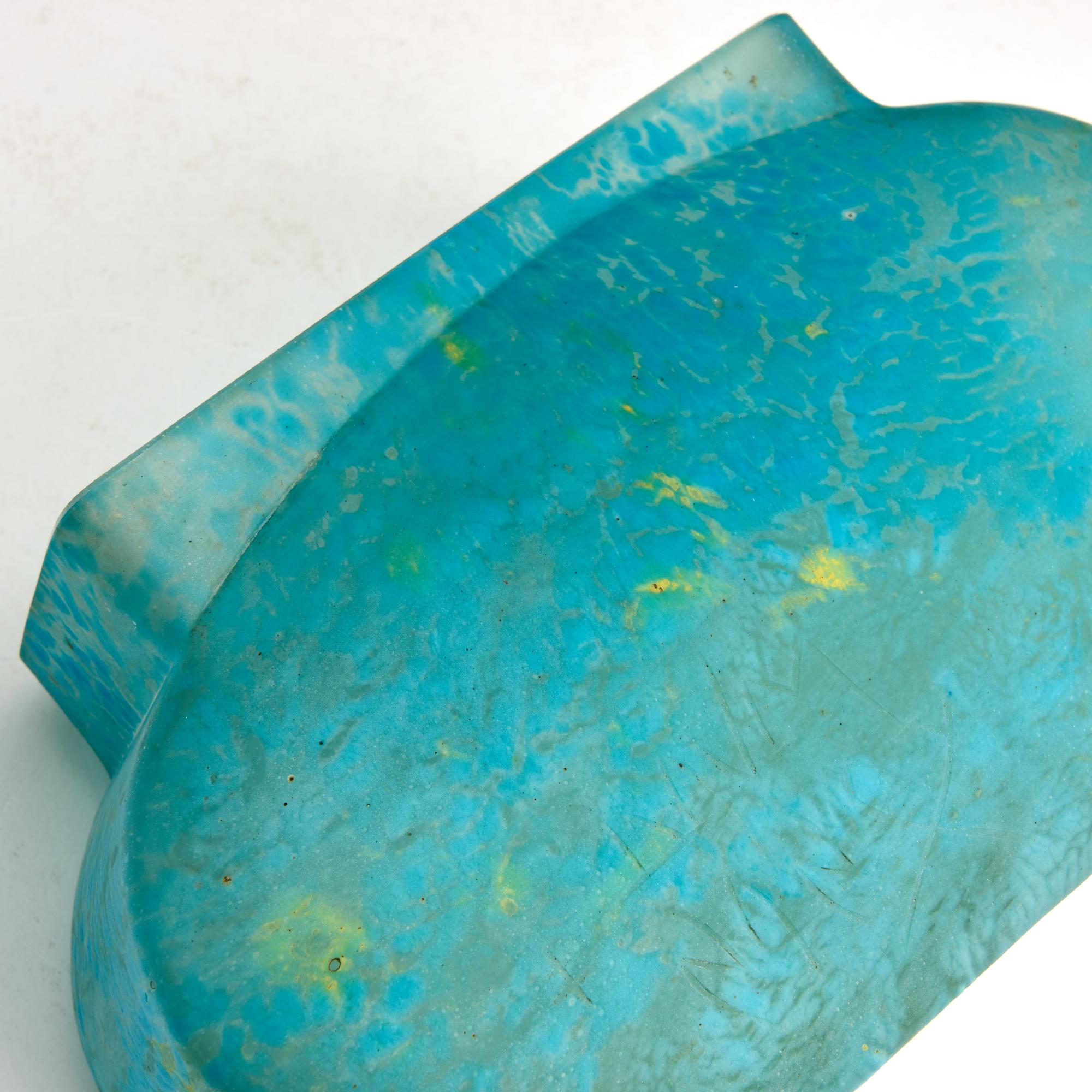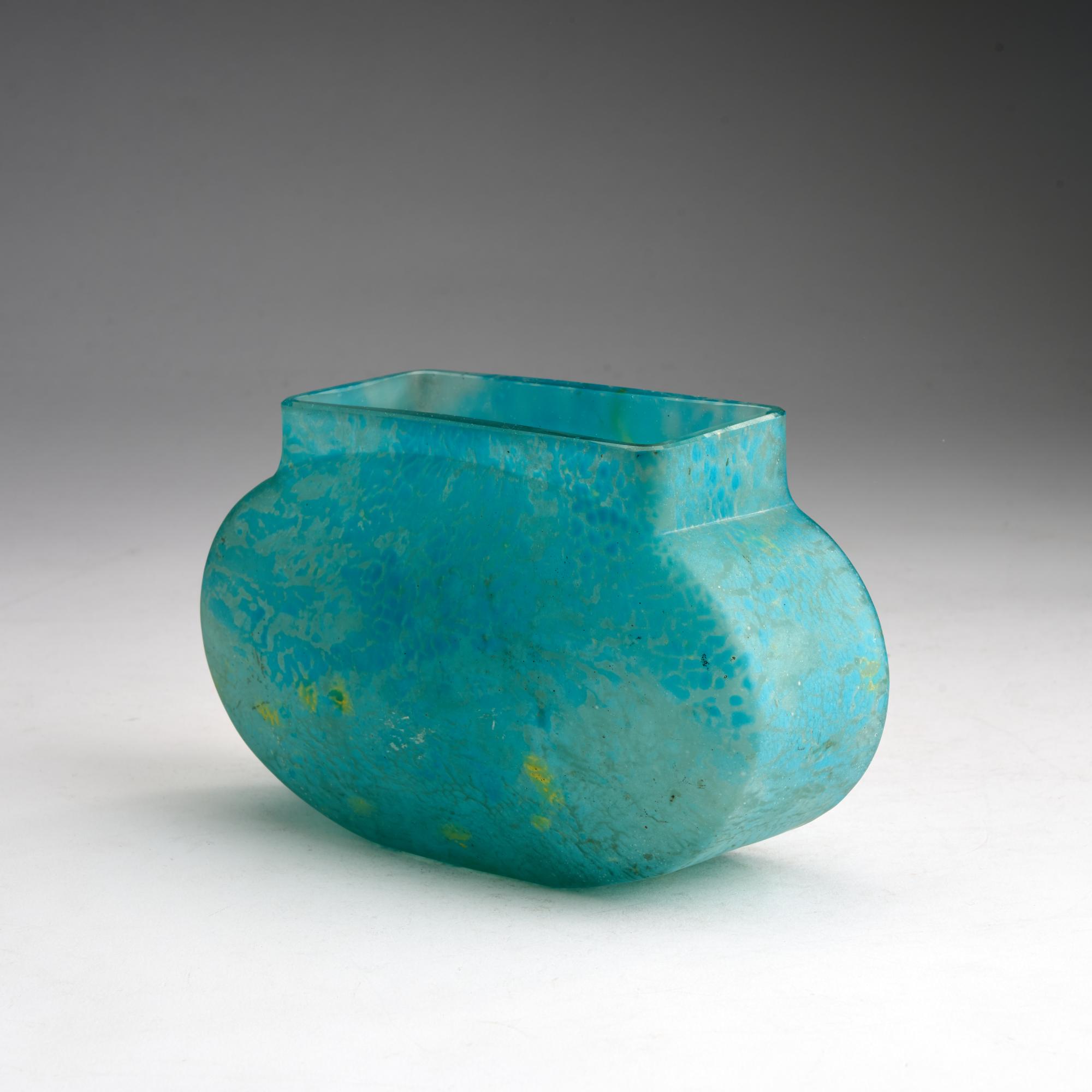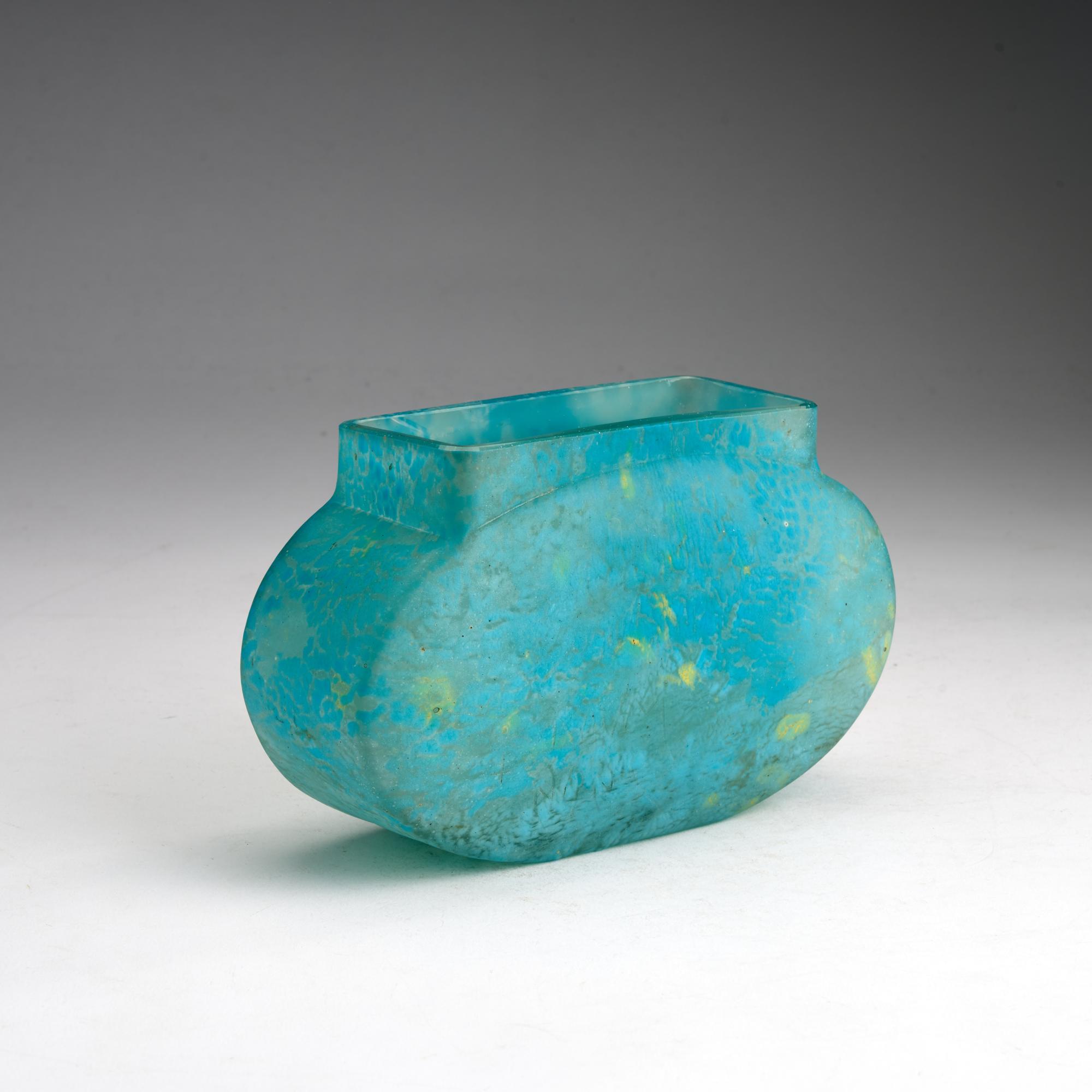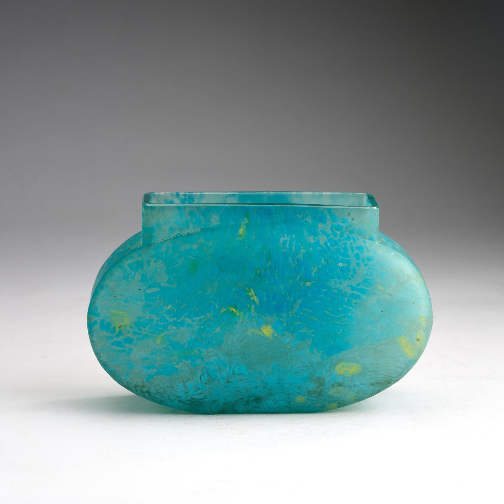 H. 11 cm. Überfangglas, farblos, blaue und gelbe Pulveraufschmelzungen. Sign.: DAUM, Lothringer Kreuz, NANCY (graviert).