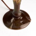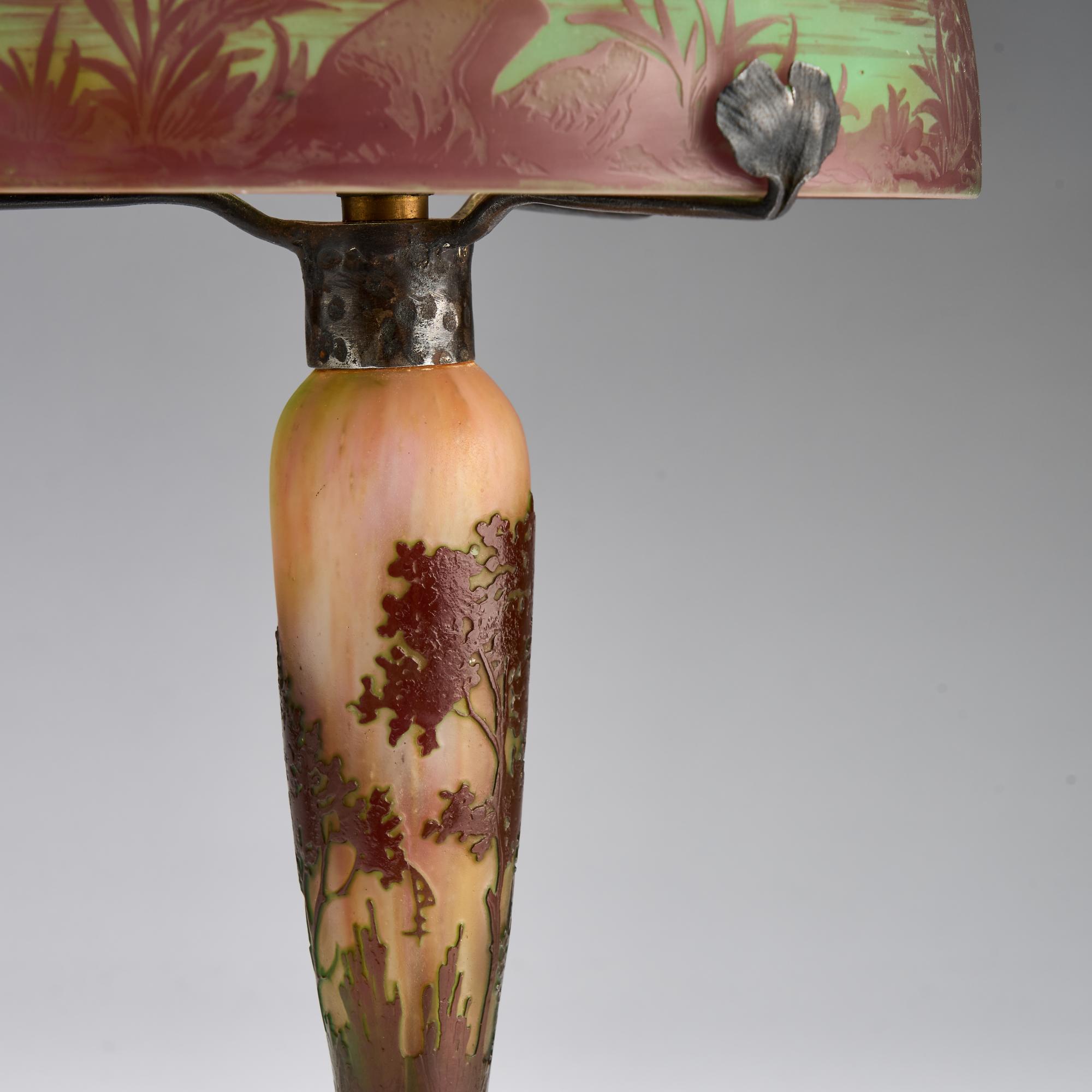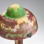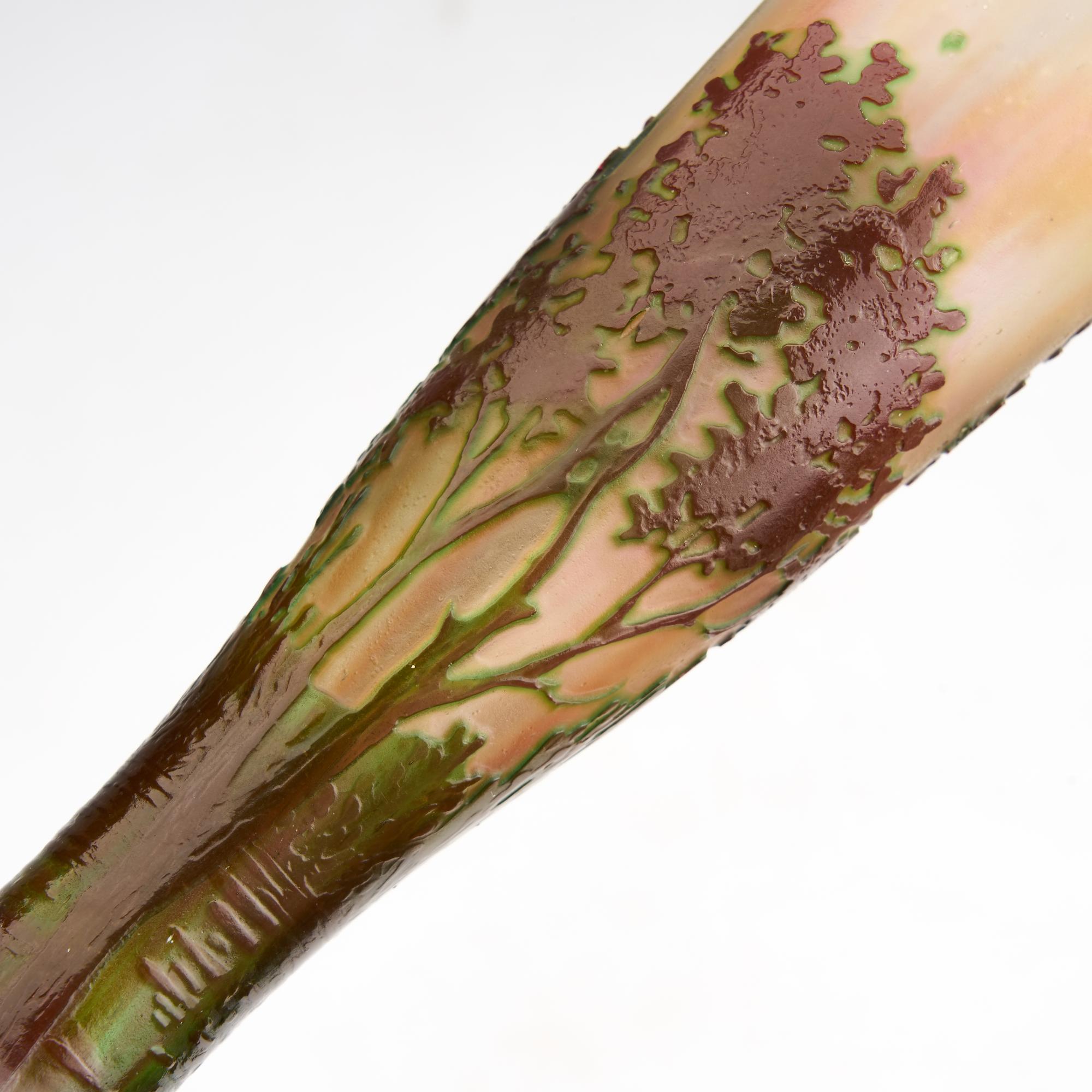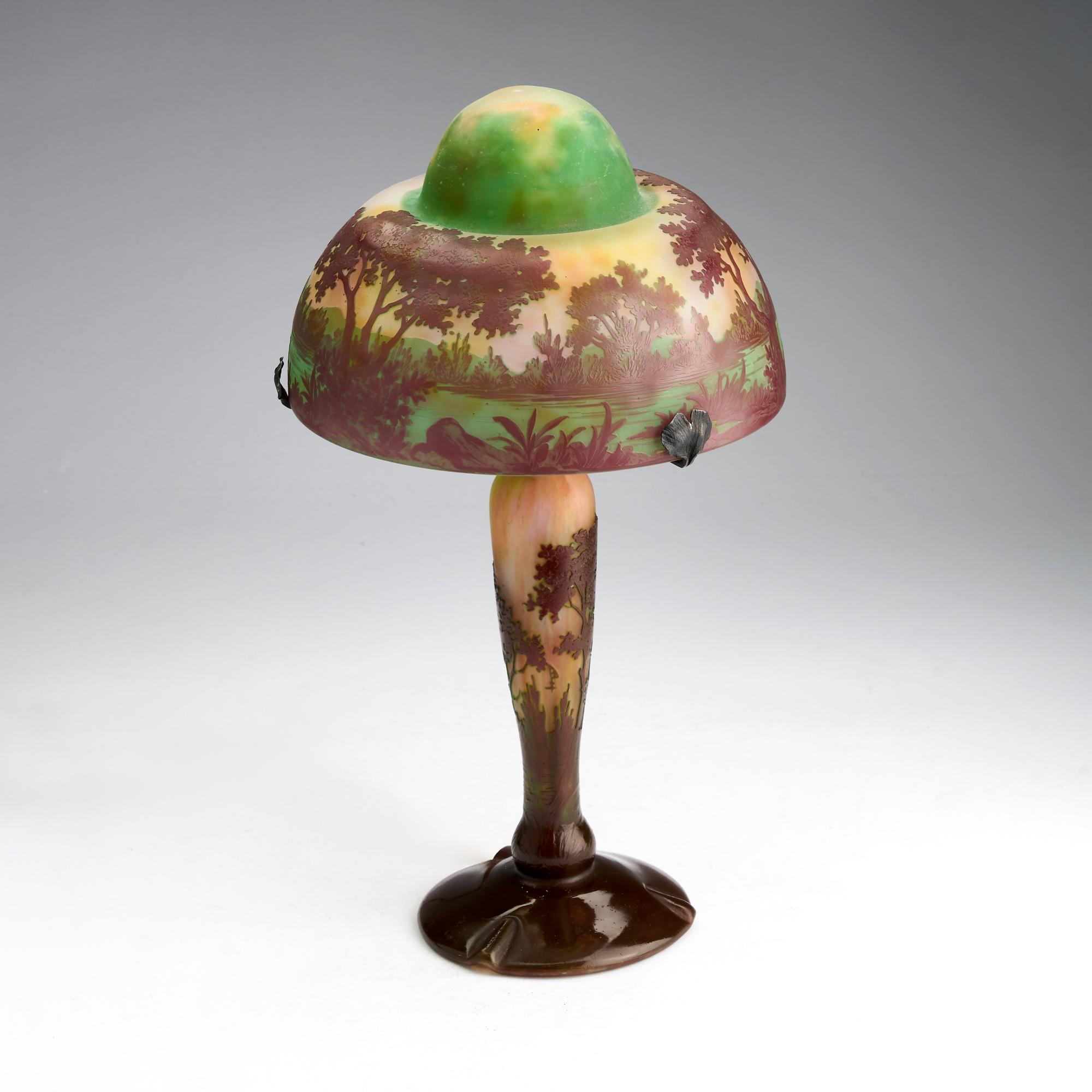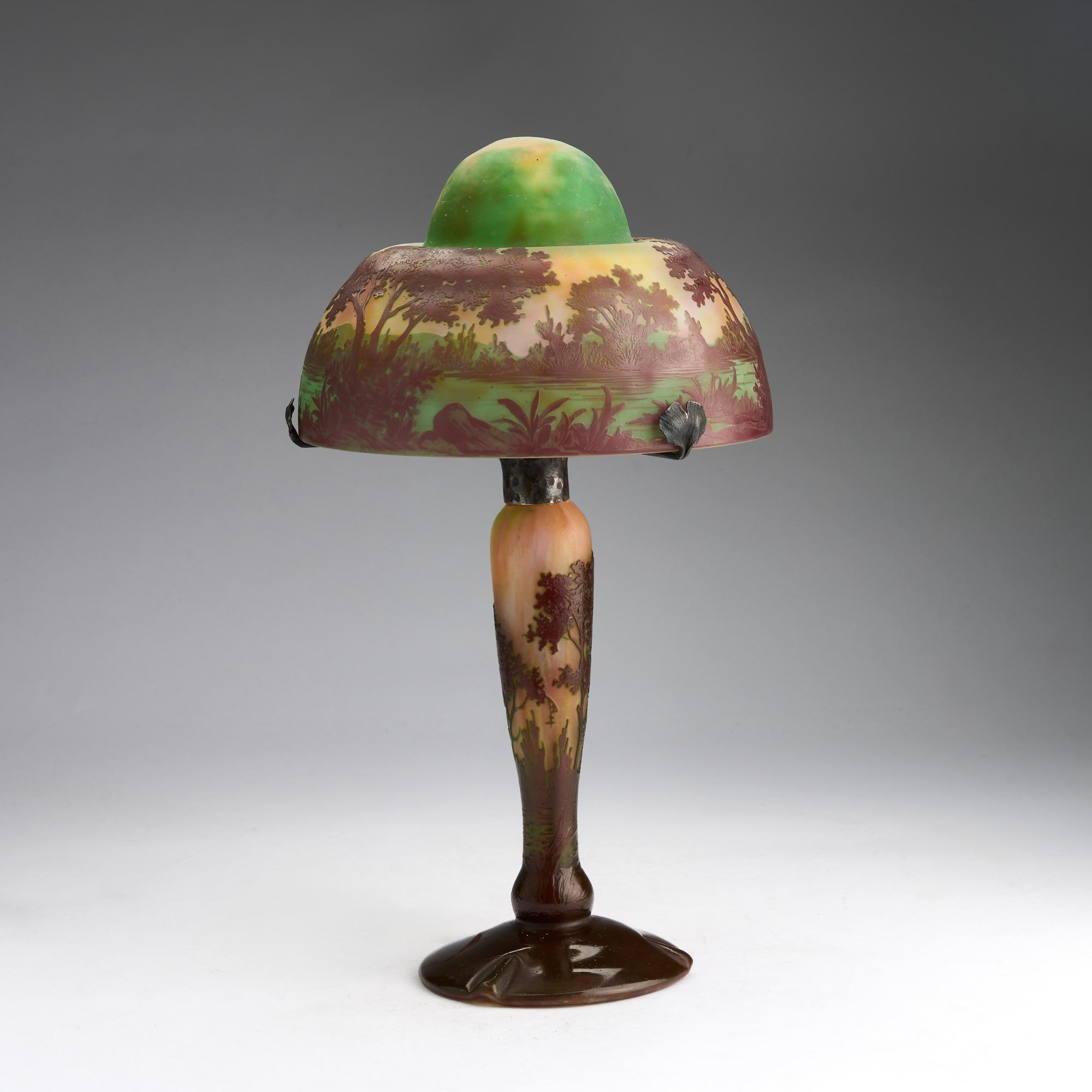 H. 35 cm, Ø 19,5 cm. Überfangglas, farblos, weiße und rosafarbene Pulvereinschlüsse, grüne Emailaufschmelzungen. Geätzter Dekor mit einer baumbestandenen Seenlandschaft. Sign.: DAUM NANCY, Lothringer Kreuz bzw. DN, Lothringer Kreuz(hochgeätzt). Schmiedeeiserne Montierung.