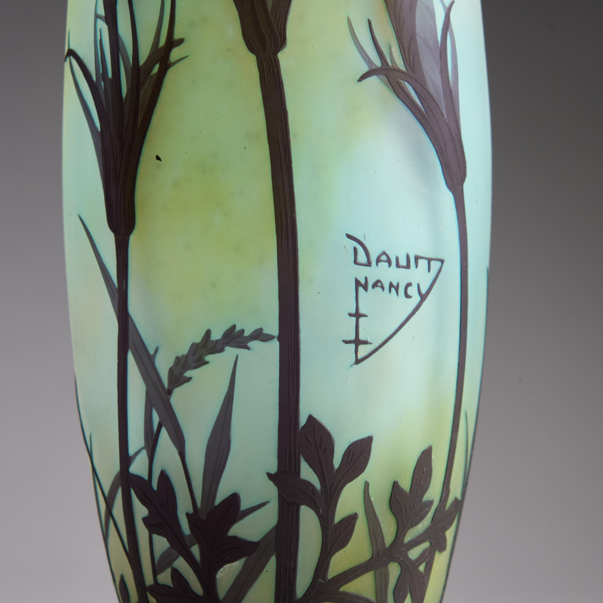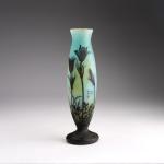 H. 28,5 cm. Überfangglas, farblos und violett, blaue und gelbe Pulvereinschlüsse. Geätzter Dekor mit Küchenschelle in abendlicher Stimmung. Sign.: DAUM NANCY, Lothringer Kreuz (hochgeätzt).