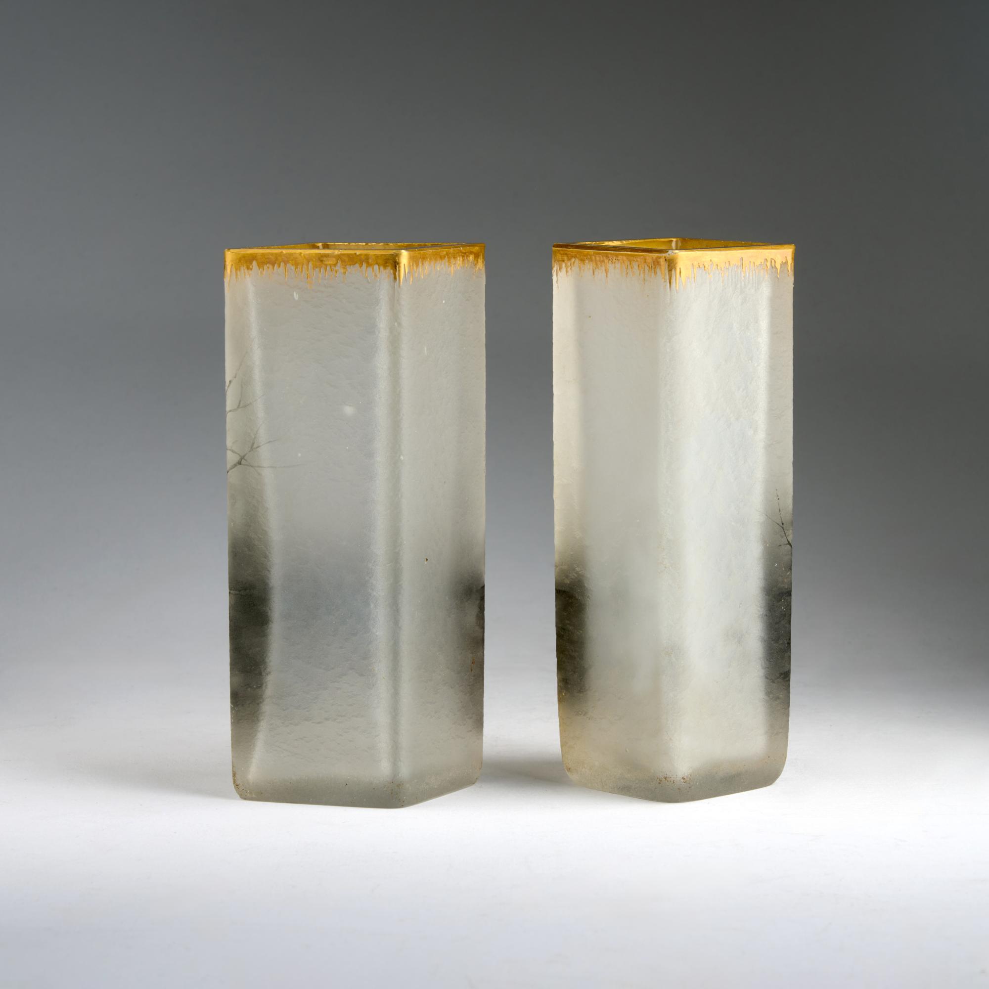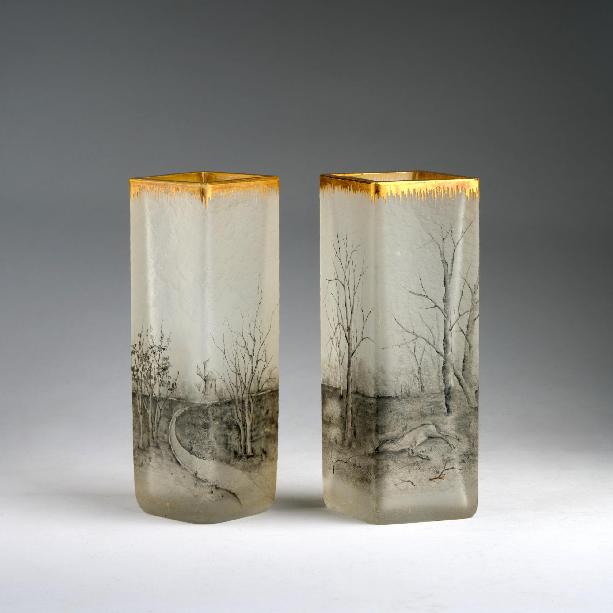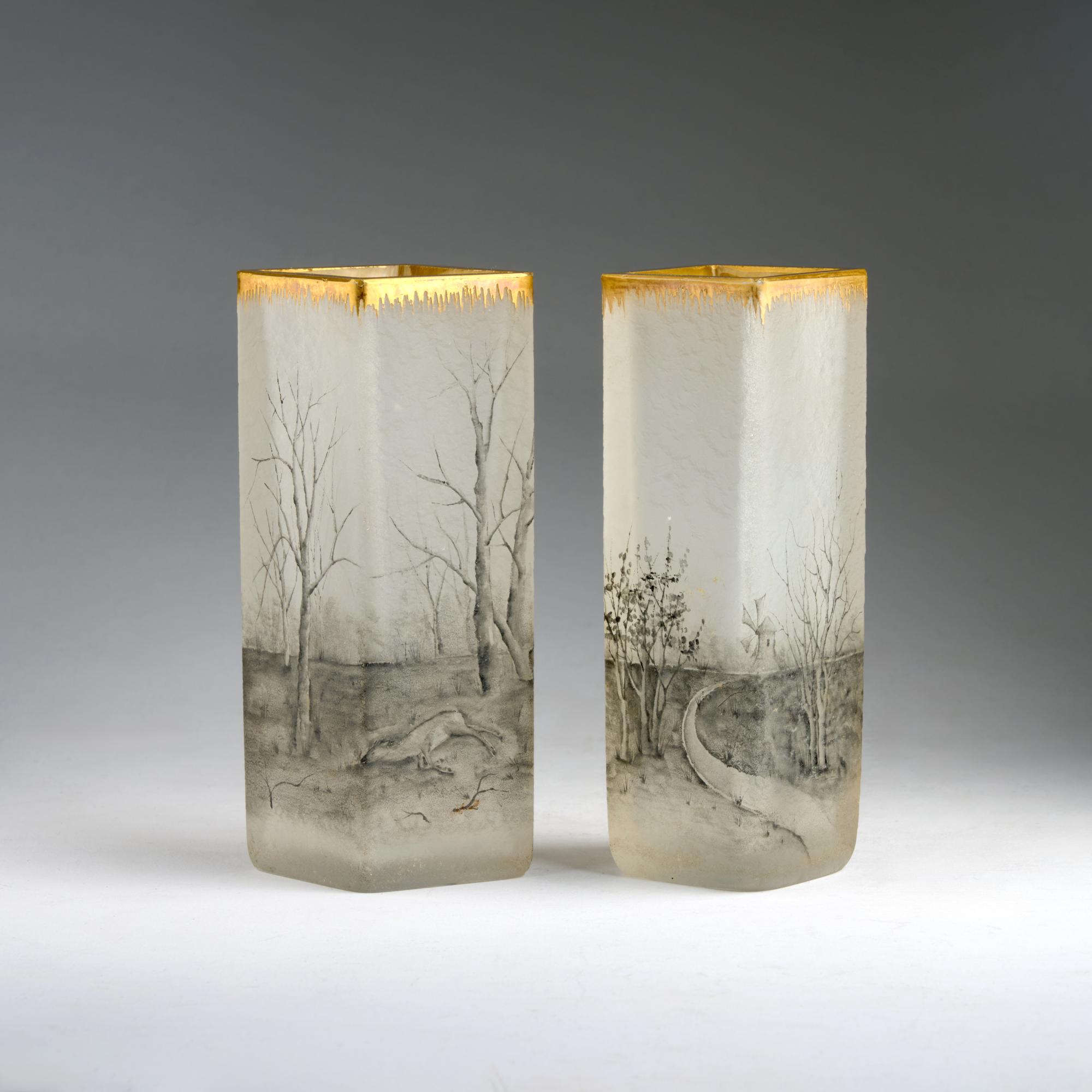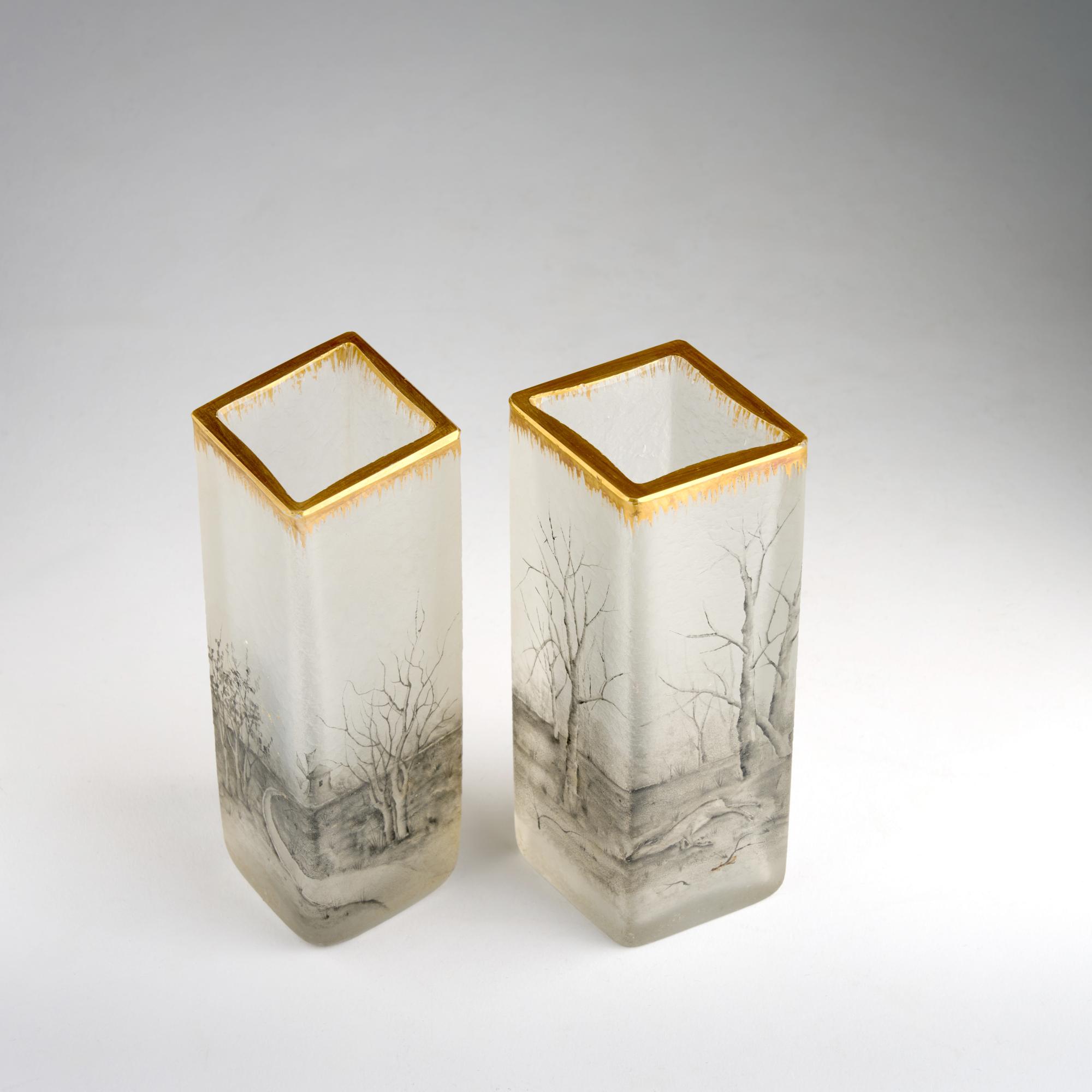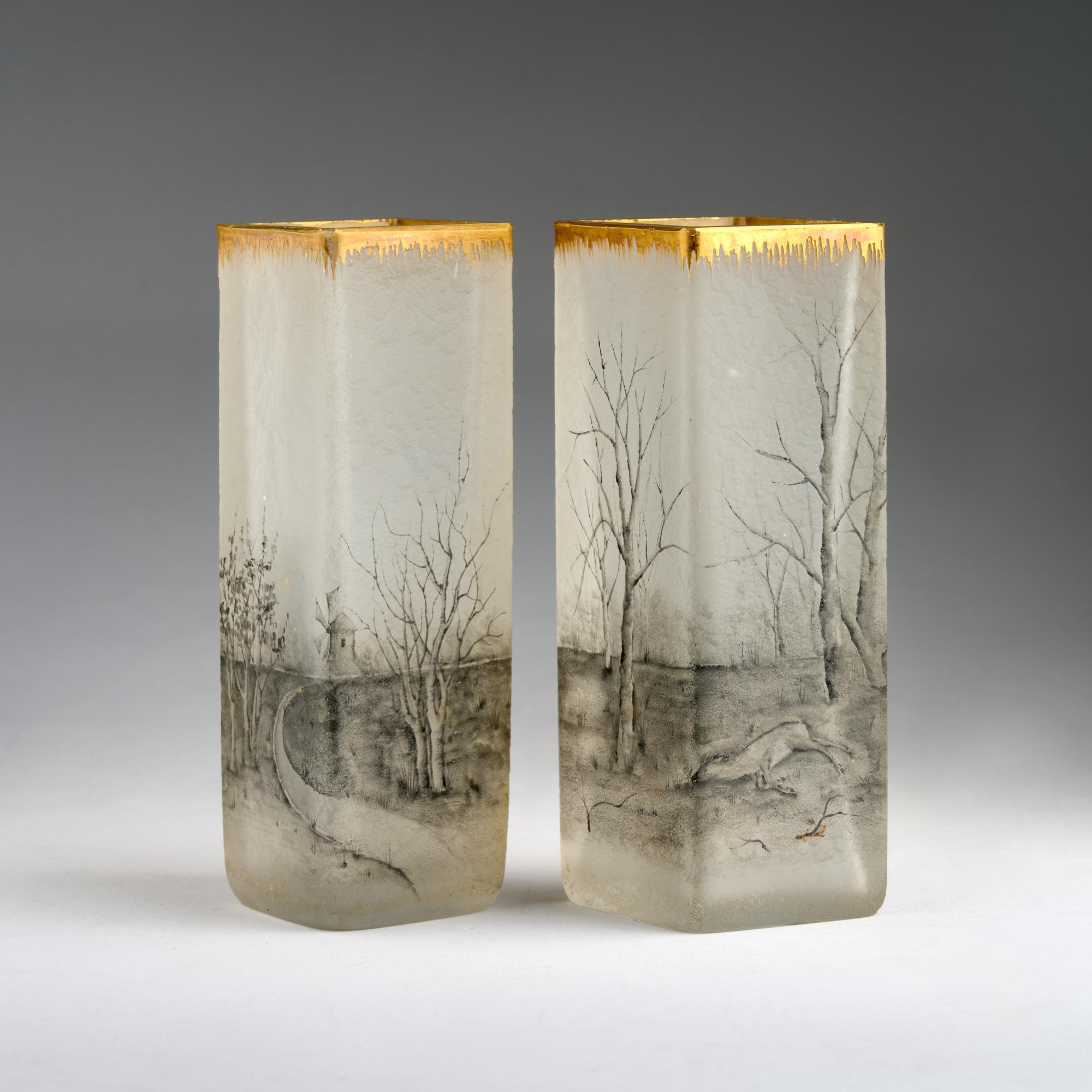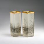 H. 13,7 cm. Glas, farblos. Geätzter und mit Schwarzlot gehöhter Landschaftsdekor. Rand vergoldet. Nicht sign.