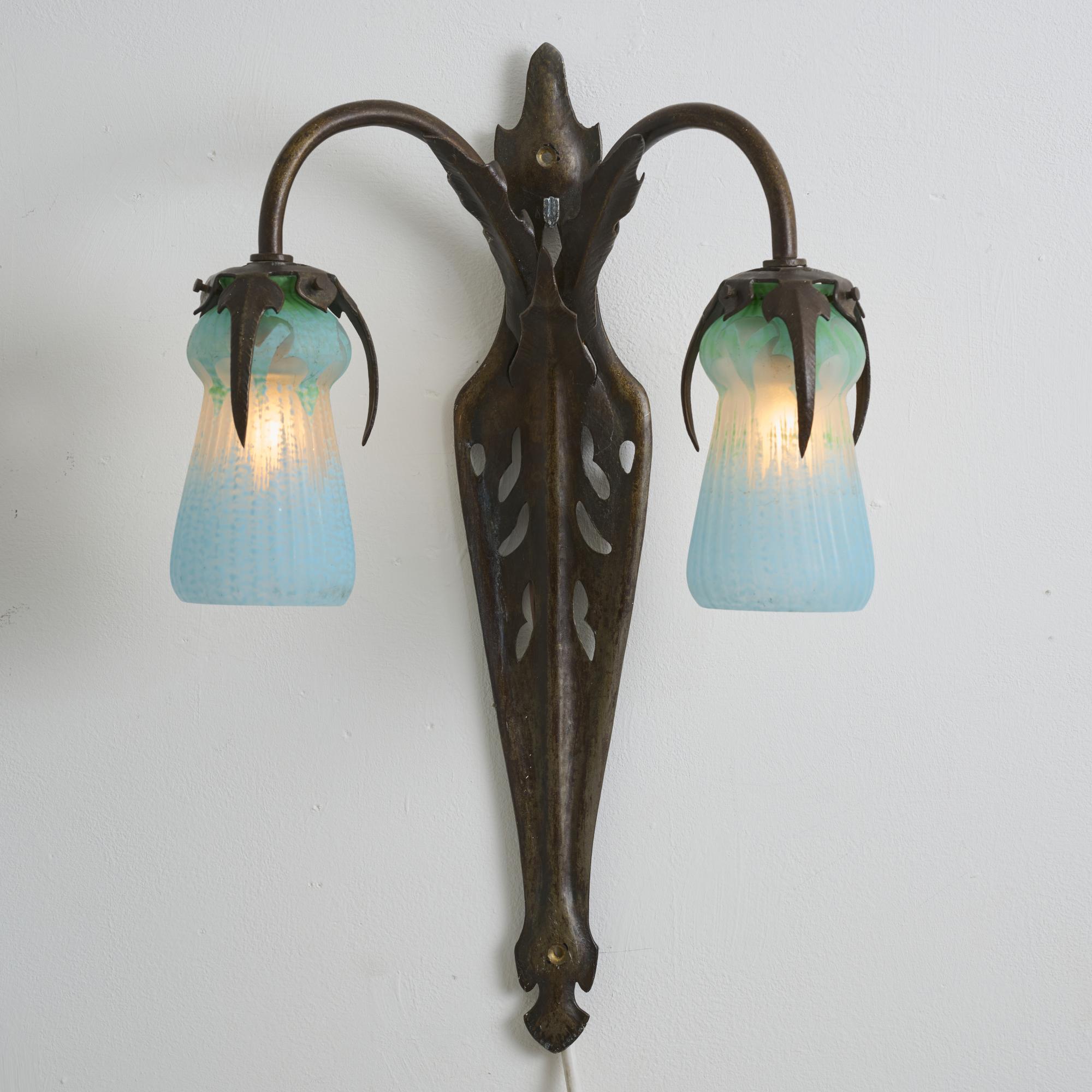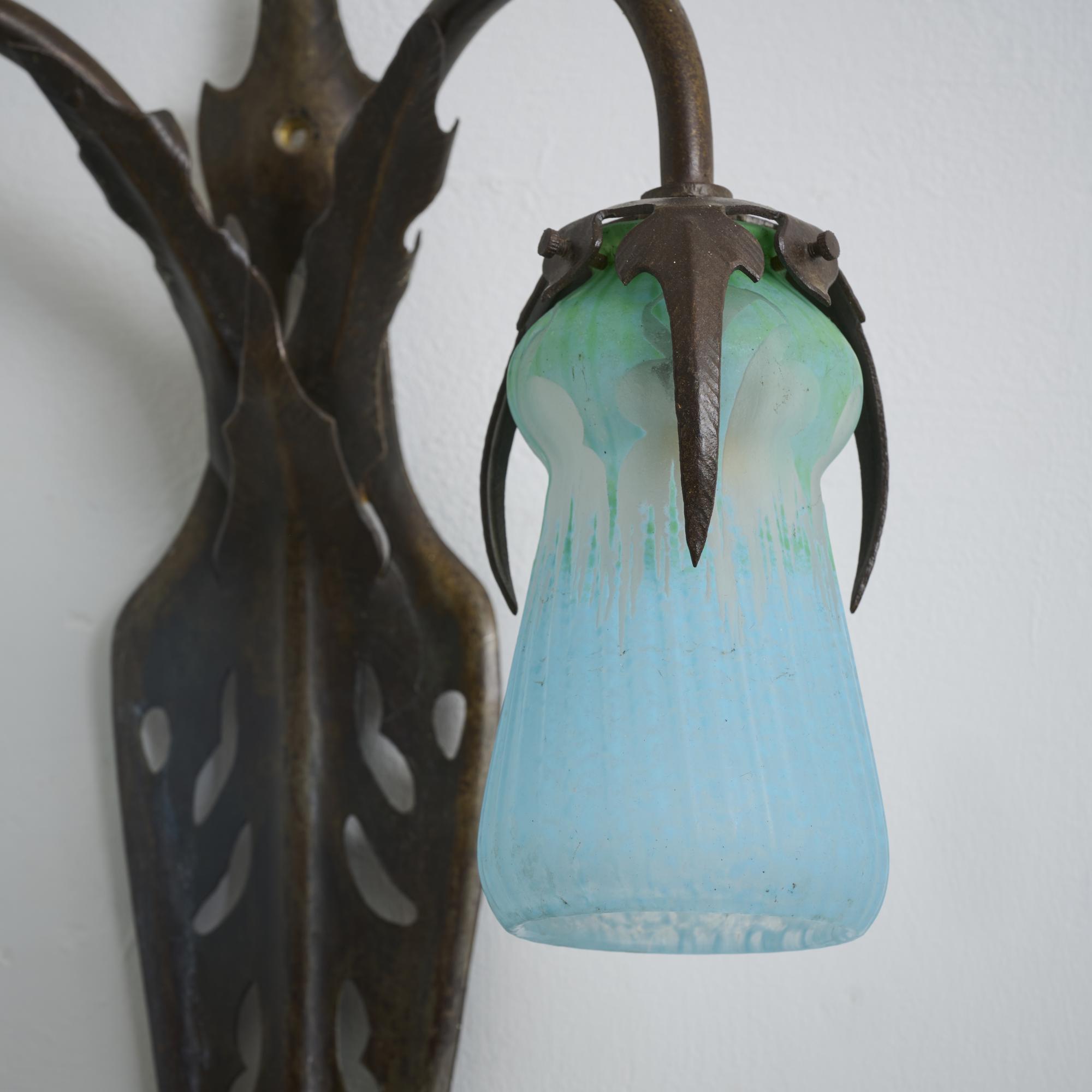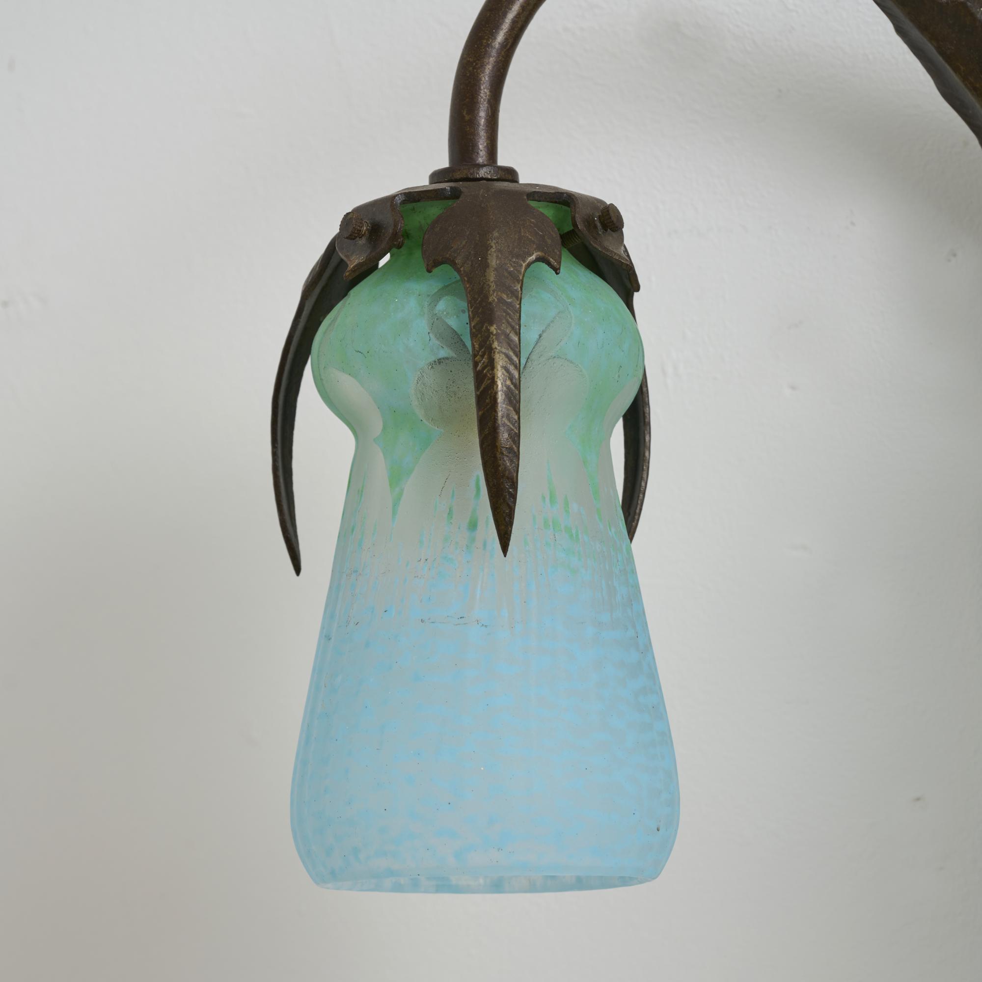 H. 47 cm, 31,5 x 16 cm. Überfangglas, farblos, hellblaue Pulveraufschmelzungen und grüne Emailaufschmelzungen. Geätzter Löwenzahndekor. Schirme sign.: DAUM, Lothringer Kreuz, NANCY (graviert). Bronzemontierungen.