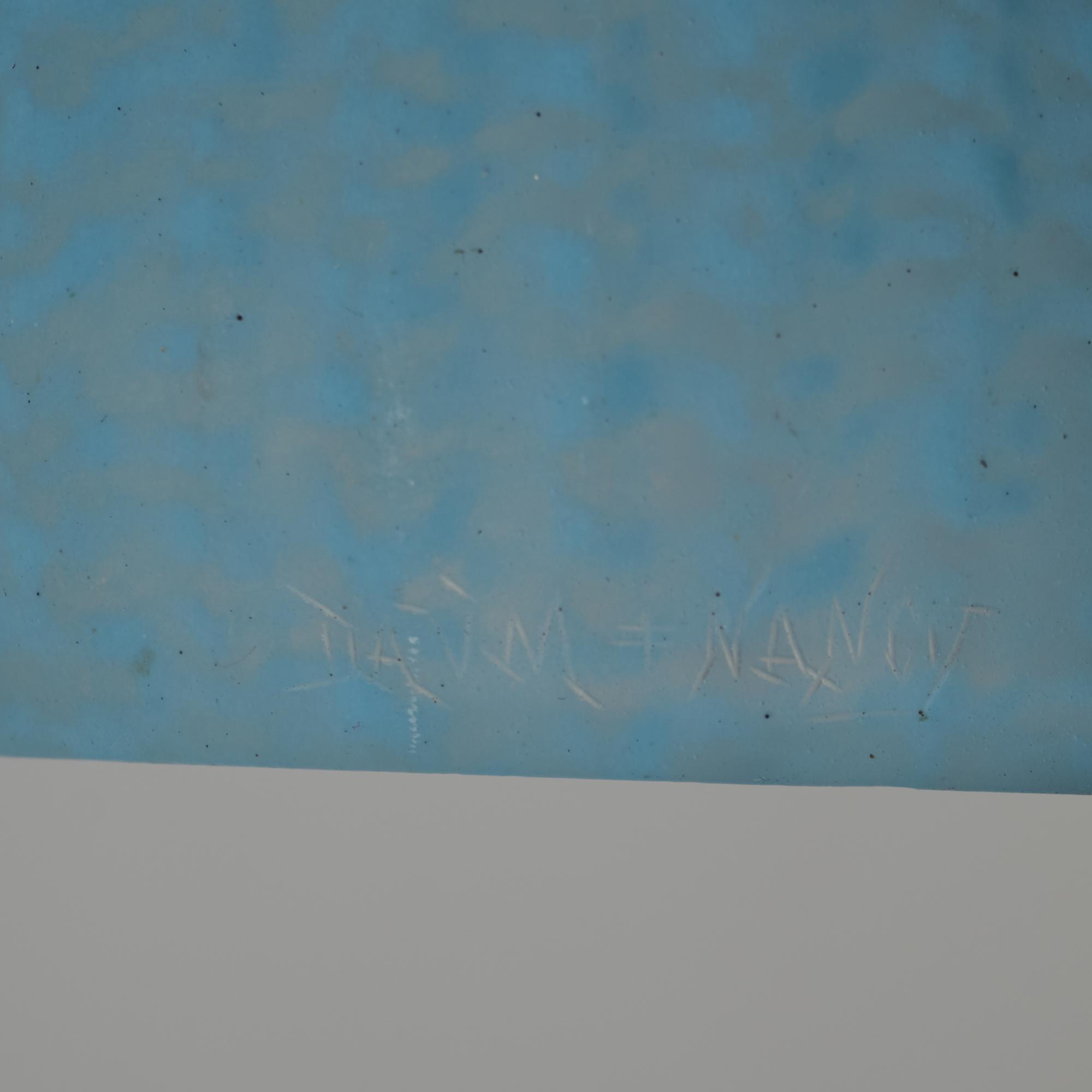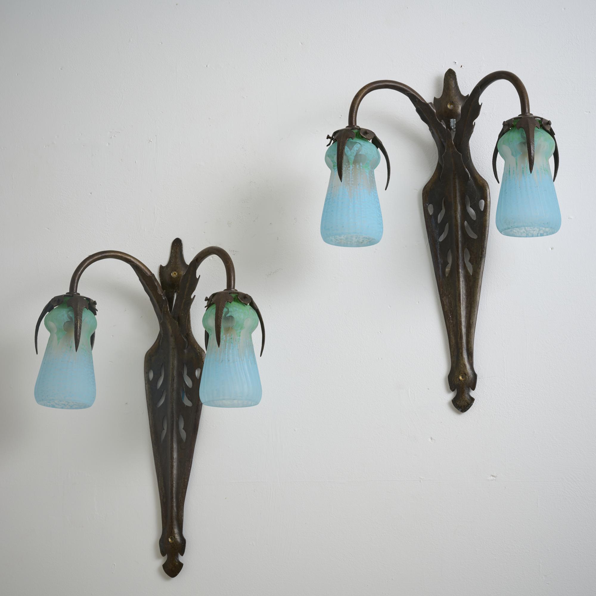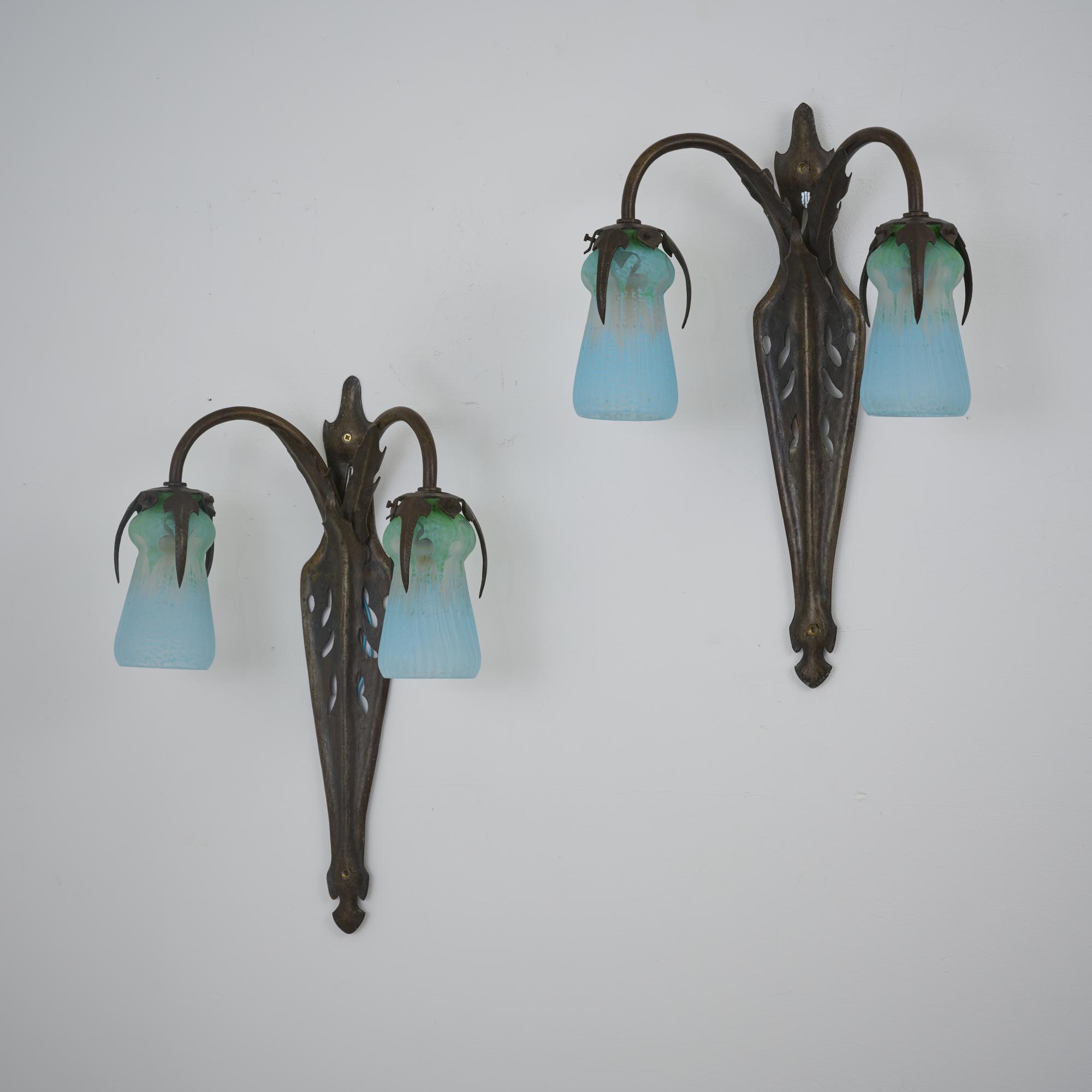 H. 47 cm, 31,5 x 16 cm. Überfangglas, farblos, hellblaue Pulveraufschmelzungen und grüne Emailaufschmelzungen. Geätzter Löwenzahndekor. Schirme sign.: DAUM, Lothringer Kreuz, NANCY (graviert). Bronzemontierungen.