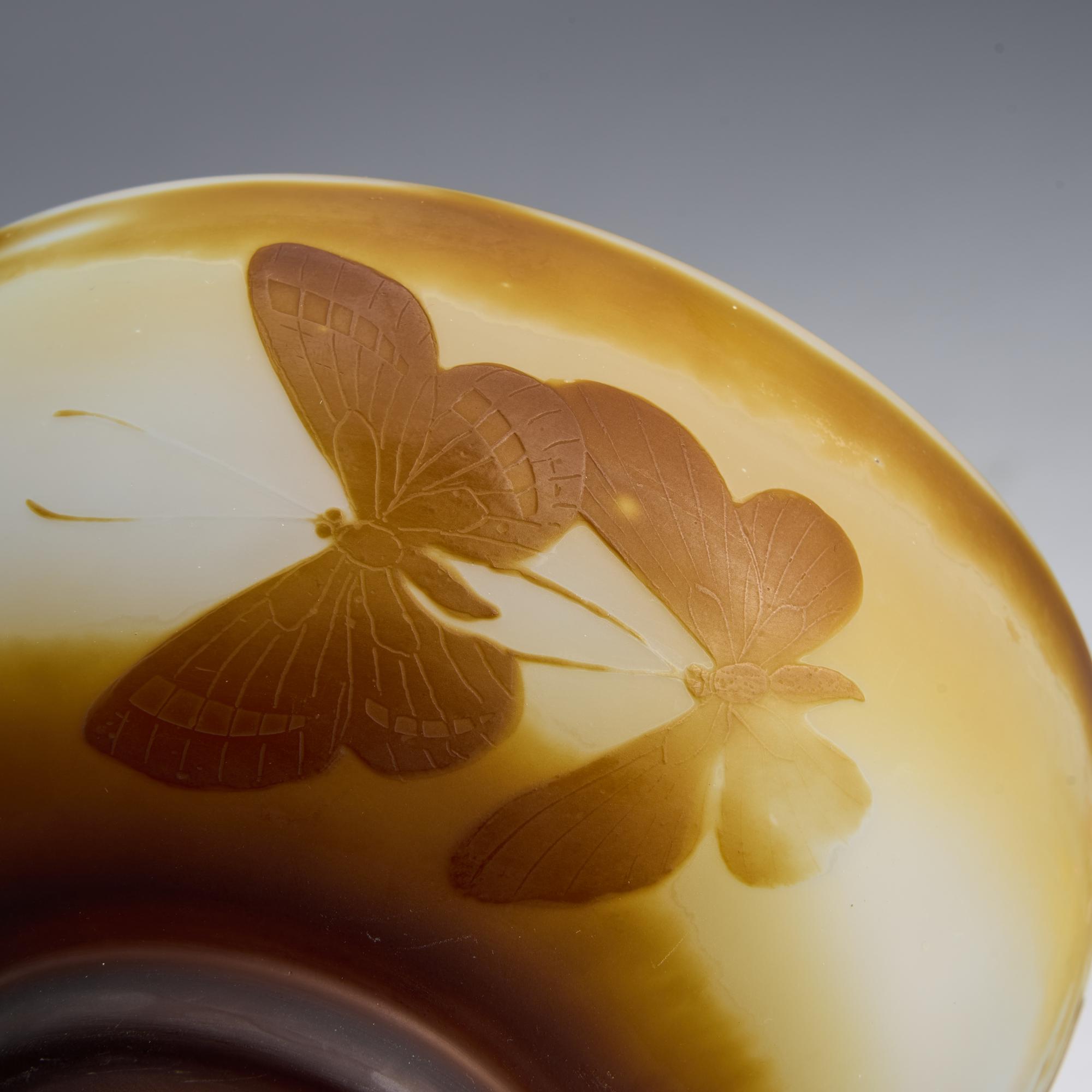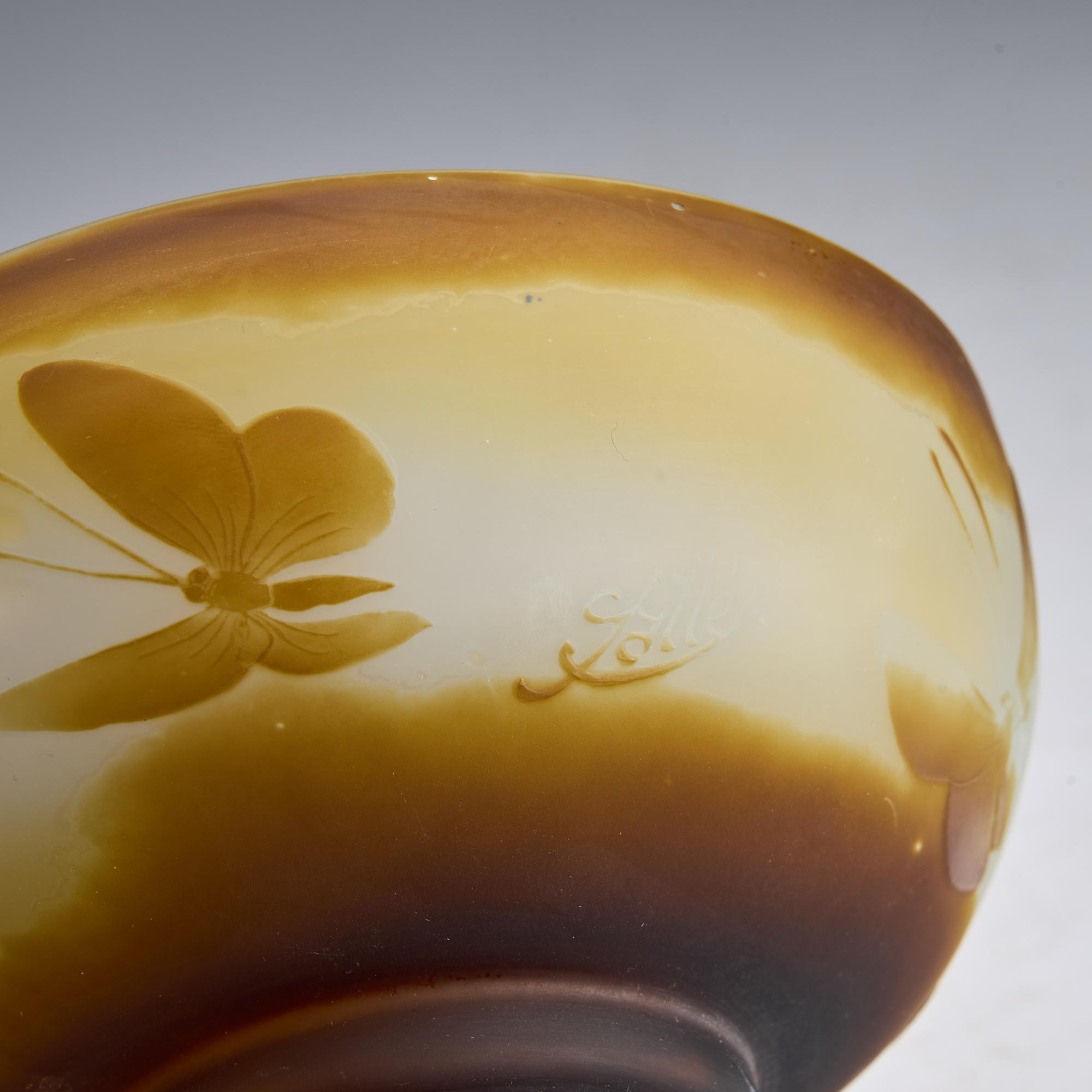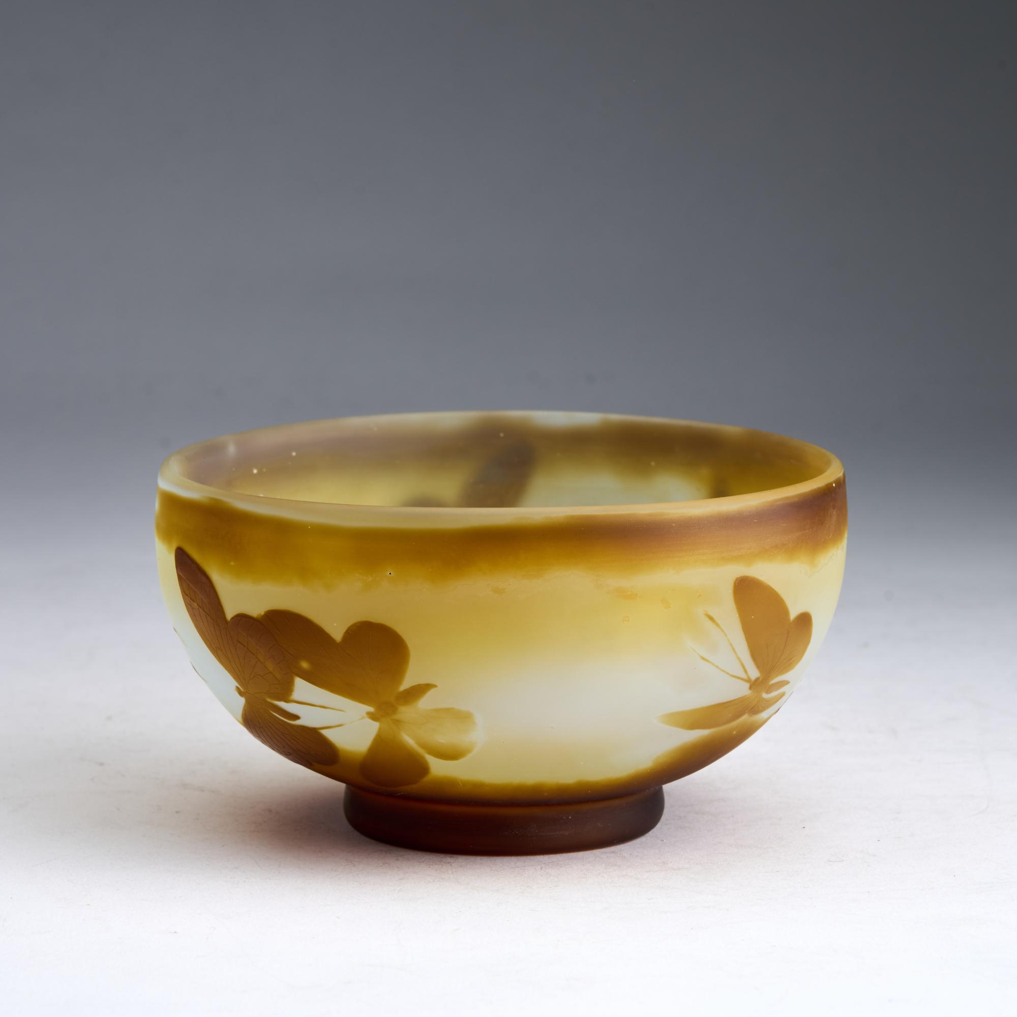 H. 7 cm, Ø 13 cm. Überfangglas, farblos, bernsteinbraun, opalweiß und braun. Sign.: Gallé (hochgeätzt).