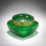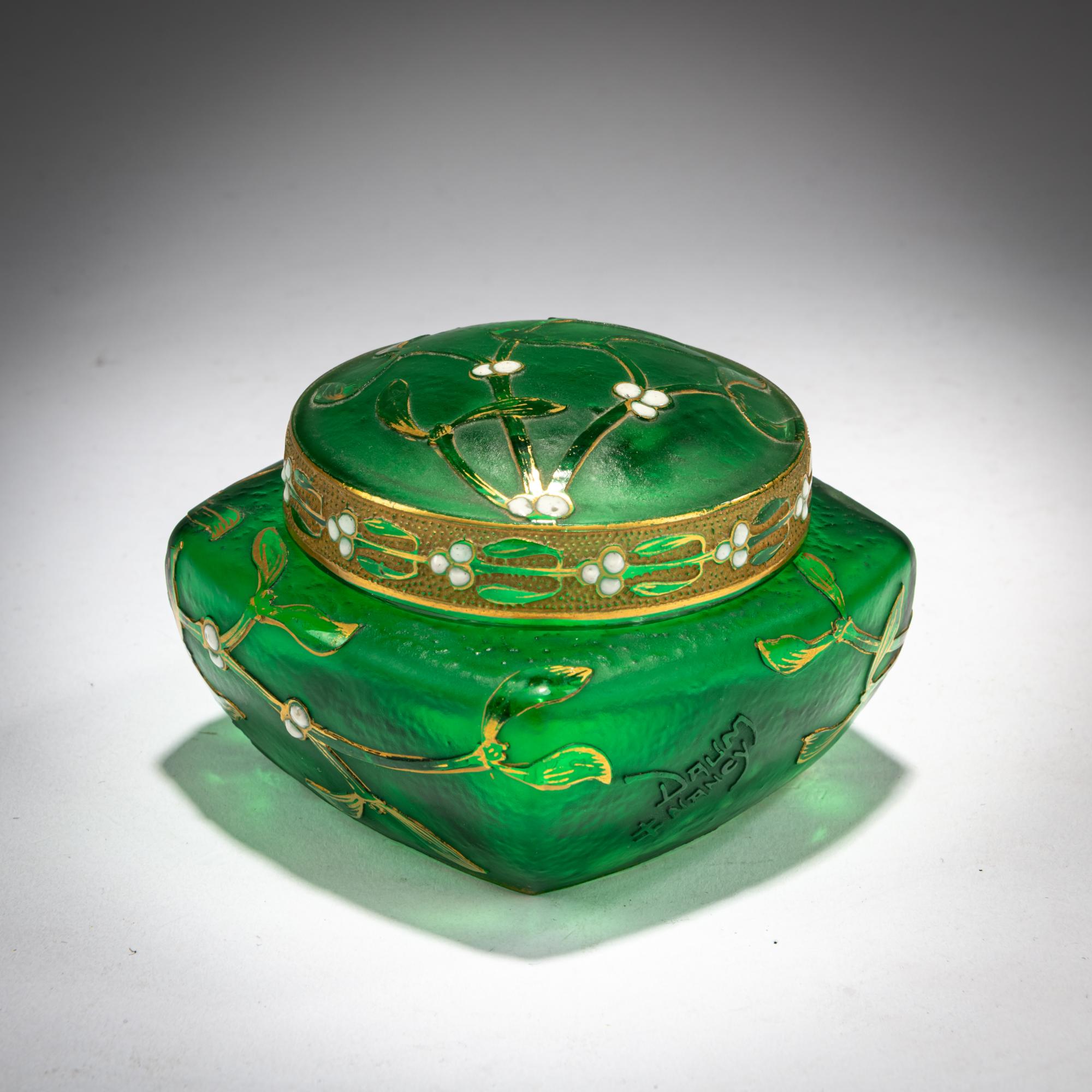 H. 6,3 cm. Ausführung: Daum Frères, Nancy. Überfangglas, farblos und grün. Geätzter, emaillierter und goldgehöhter Dekor mit Mistelzweigen auf rauem Grund. Am Deckelrand vergoldeter Fries mit Mistelmotiv. Sign.: Daum Lothringer Kreuz Nancy (hochgeätzt).