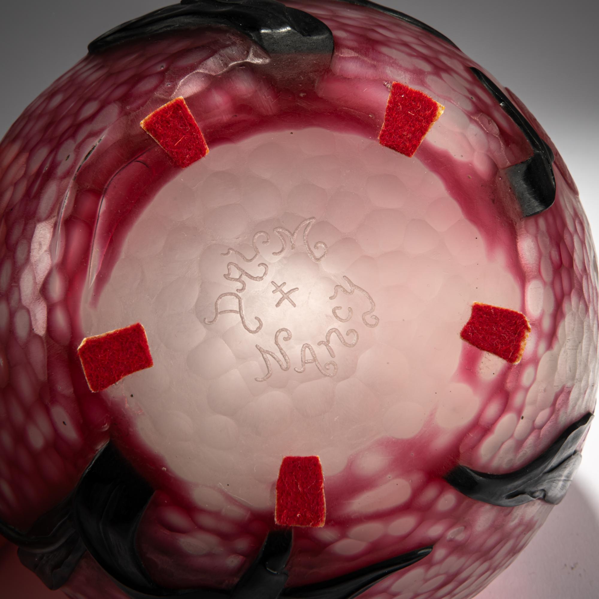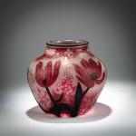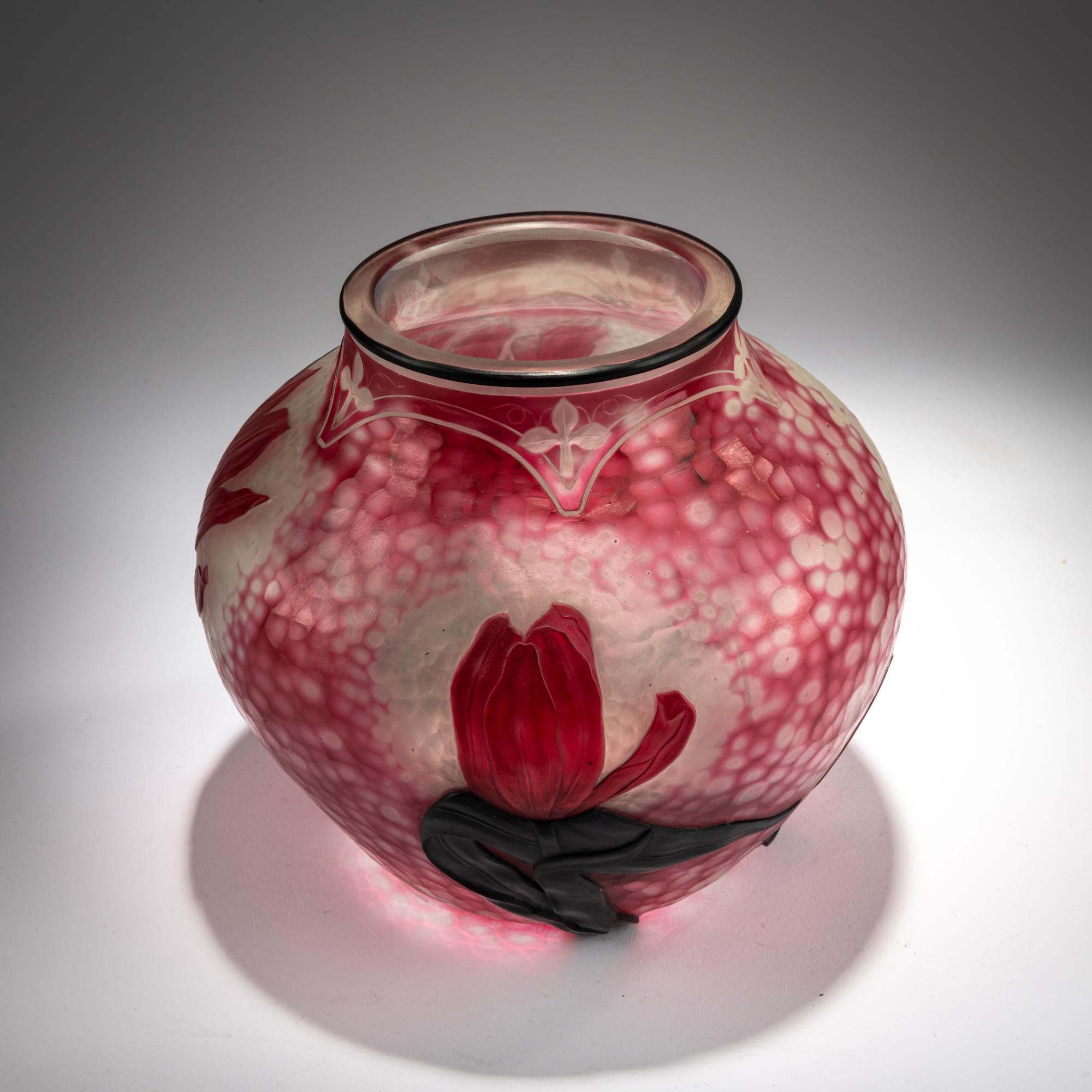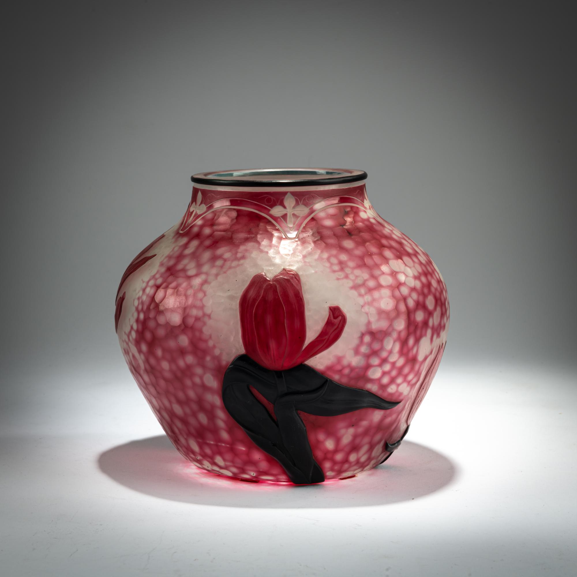 H. 15,6 cm. Ausführung: Daum Frères, Nancy. Überfangglas, farblos, opalweiß, rosa und tief grün. Geätzter Dekor mit blühenden Tulpen, nahezu vollständig in Martelétechnik mit dem Rad überarbeitet. Im ausgeschliffenen Abriss sign.: DAUM NANCY, Lothringer Kreuz (graviert).