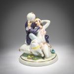 H. 16,5 cm. Ausführung: Rosenthal Zweigwerk Bahnhof Selb, 1921/22. Porzellan, weiß, glasiert, polychrome Aufglasur mit Gold. Boden bez.: Manufakturmarke (grün, unter Glasur), R.FÖRSTER 75 3 (geprägt).