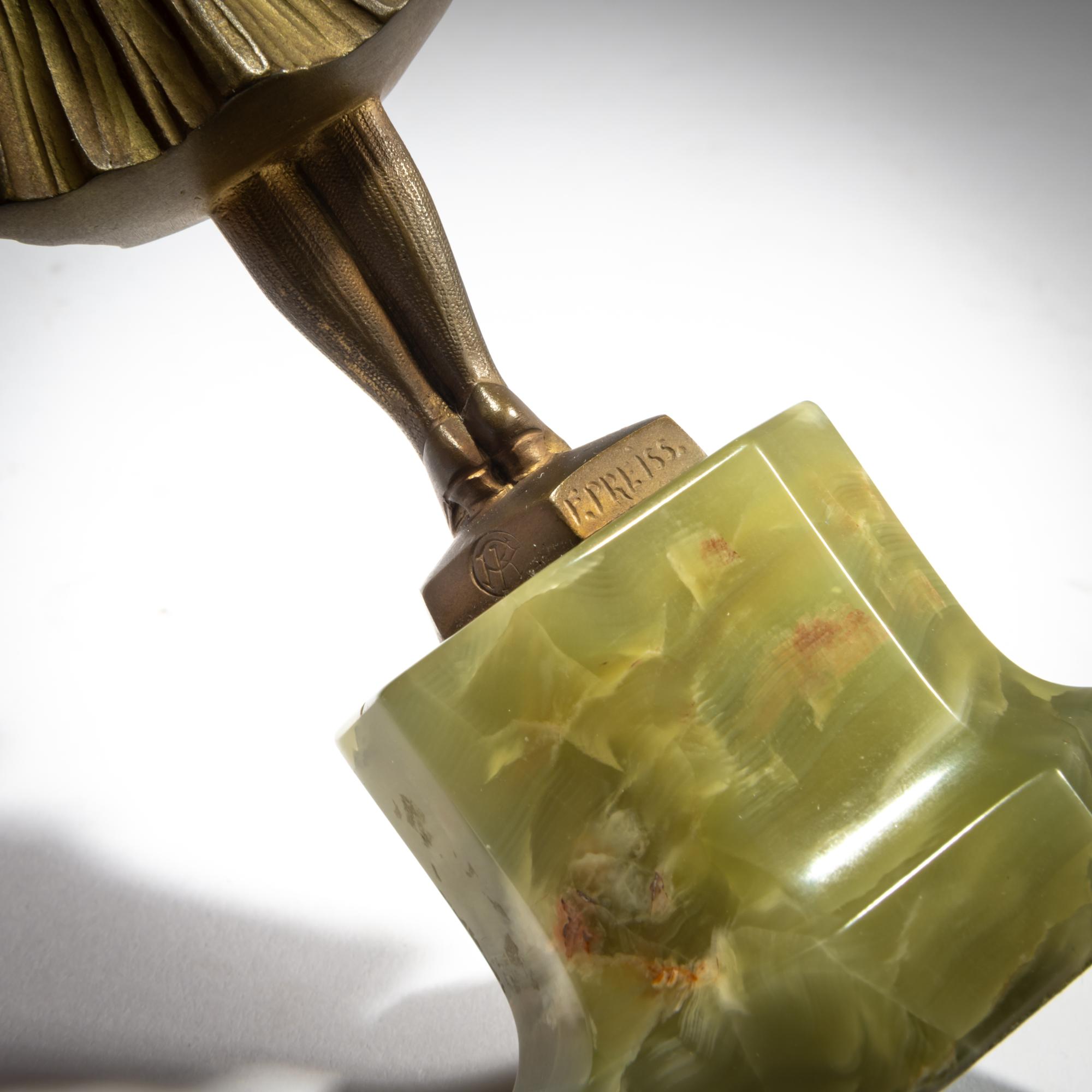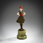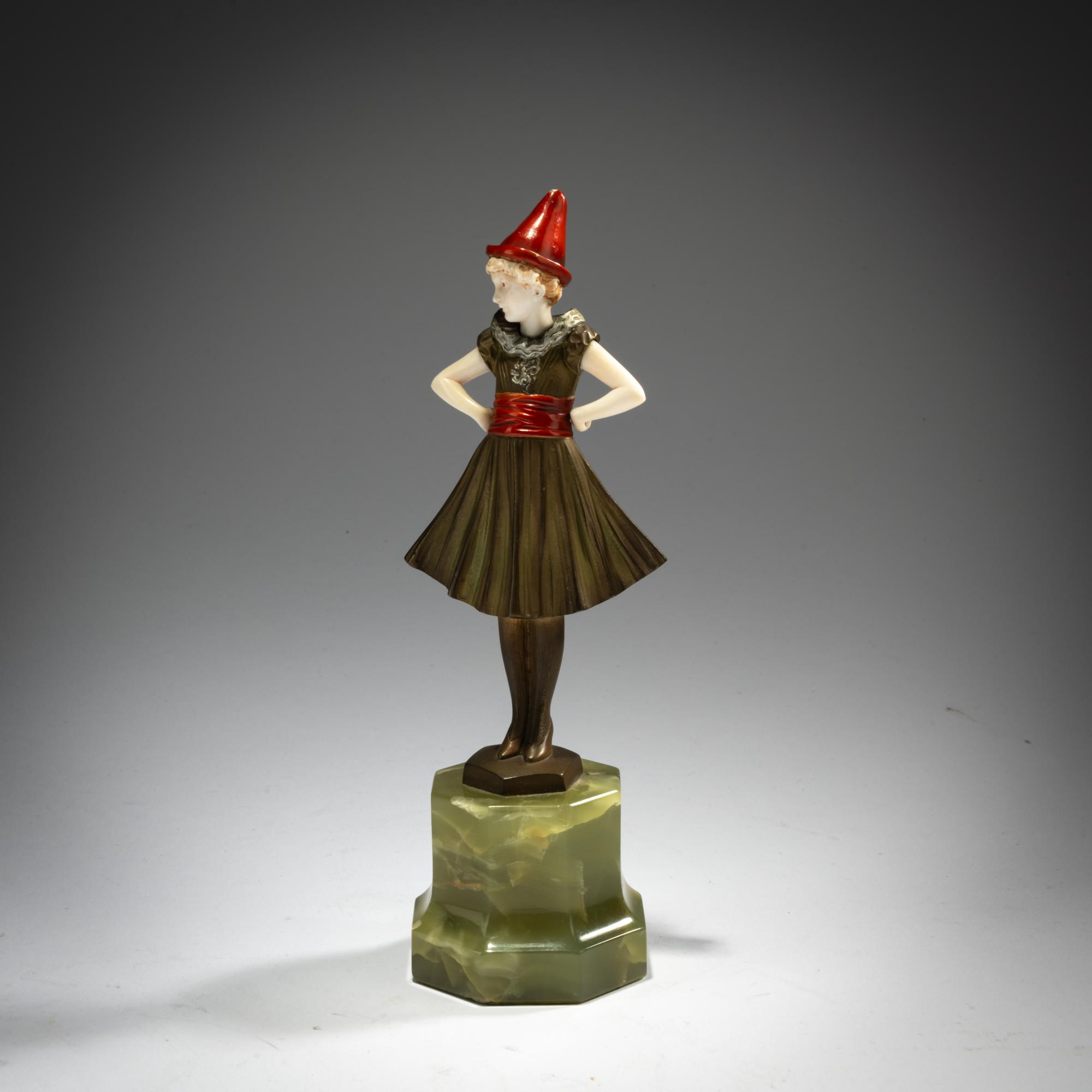 H. 18,1 cm (gesamt). Bronze, kalt bemalt, Kopf und Arme aus geschnitztem Elfenbein. Plinthe sign.: F. PREISS, Signet von Preiss & Kassler (geprägt). Onyxsockel.