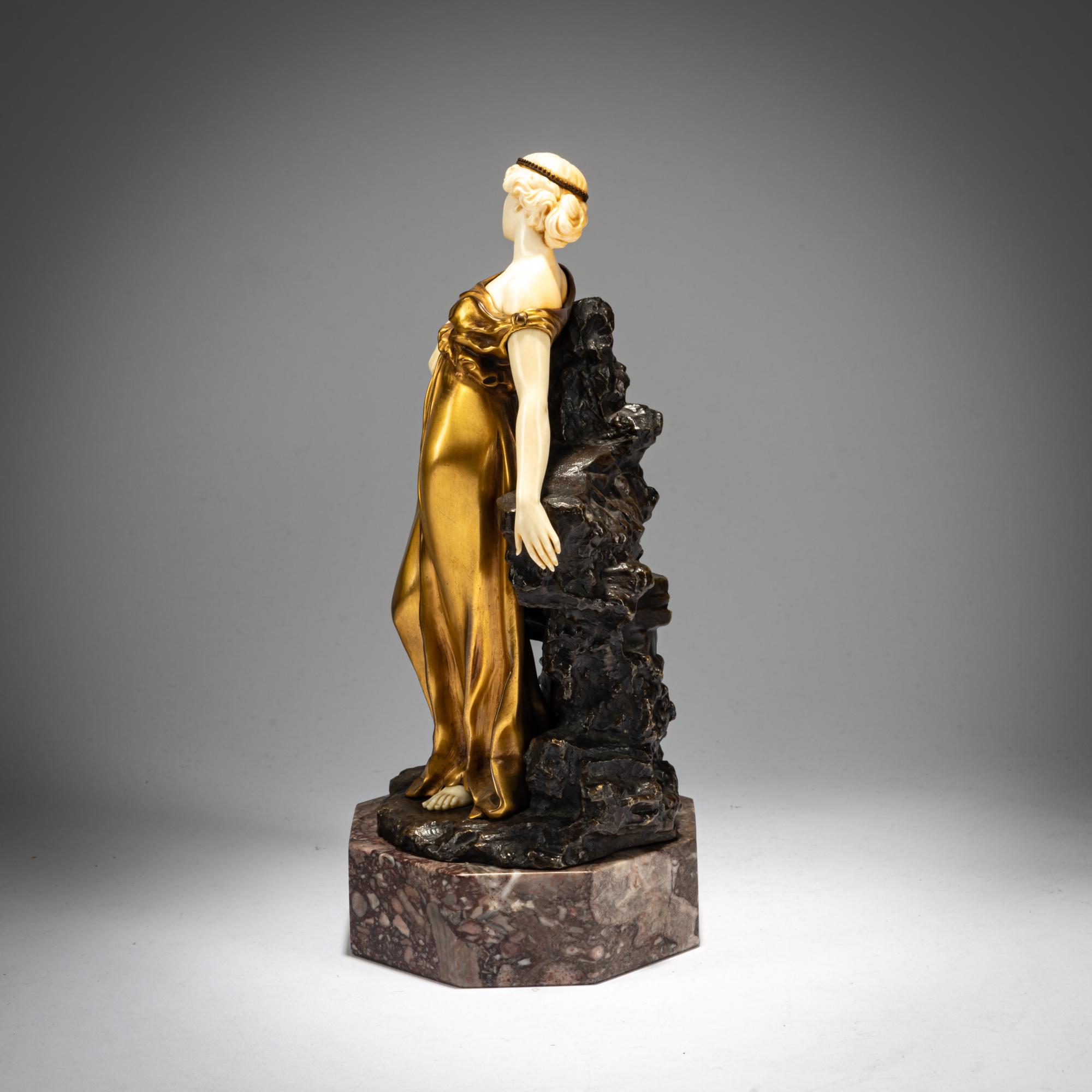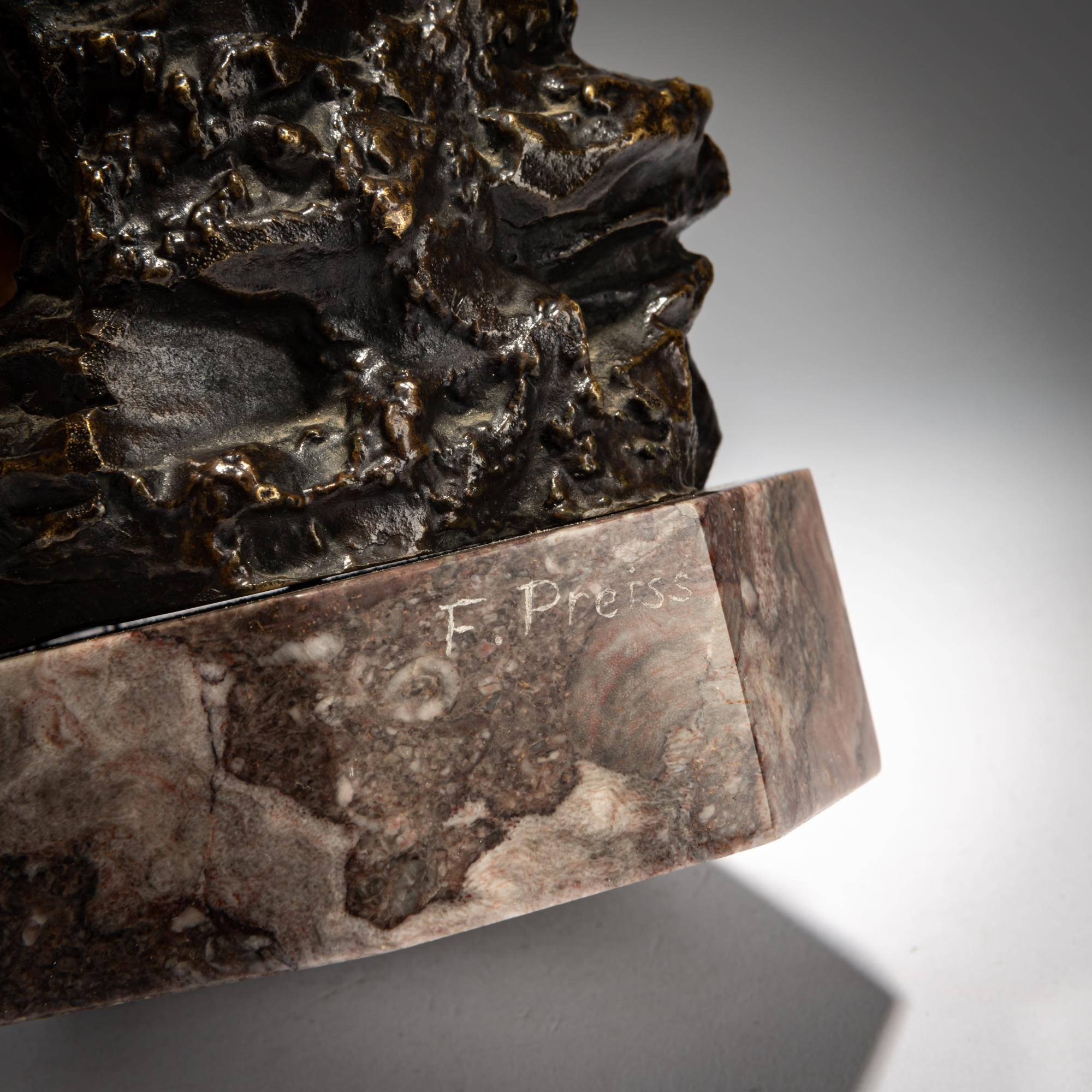 H. 22,5 cm (gesamt). Bronze, dunkel patiniert bzw. vergoldet, Kopf mit Dekolleté, Arme und sichtbarer Fuß aus geschnitztem Elfenbein. Sockel sign.: F. Preiss (geritzt). Roter Marmorsockel.