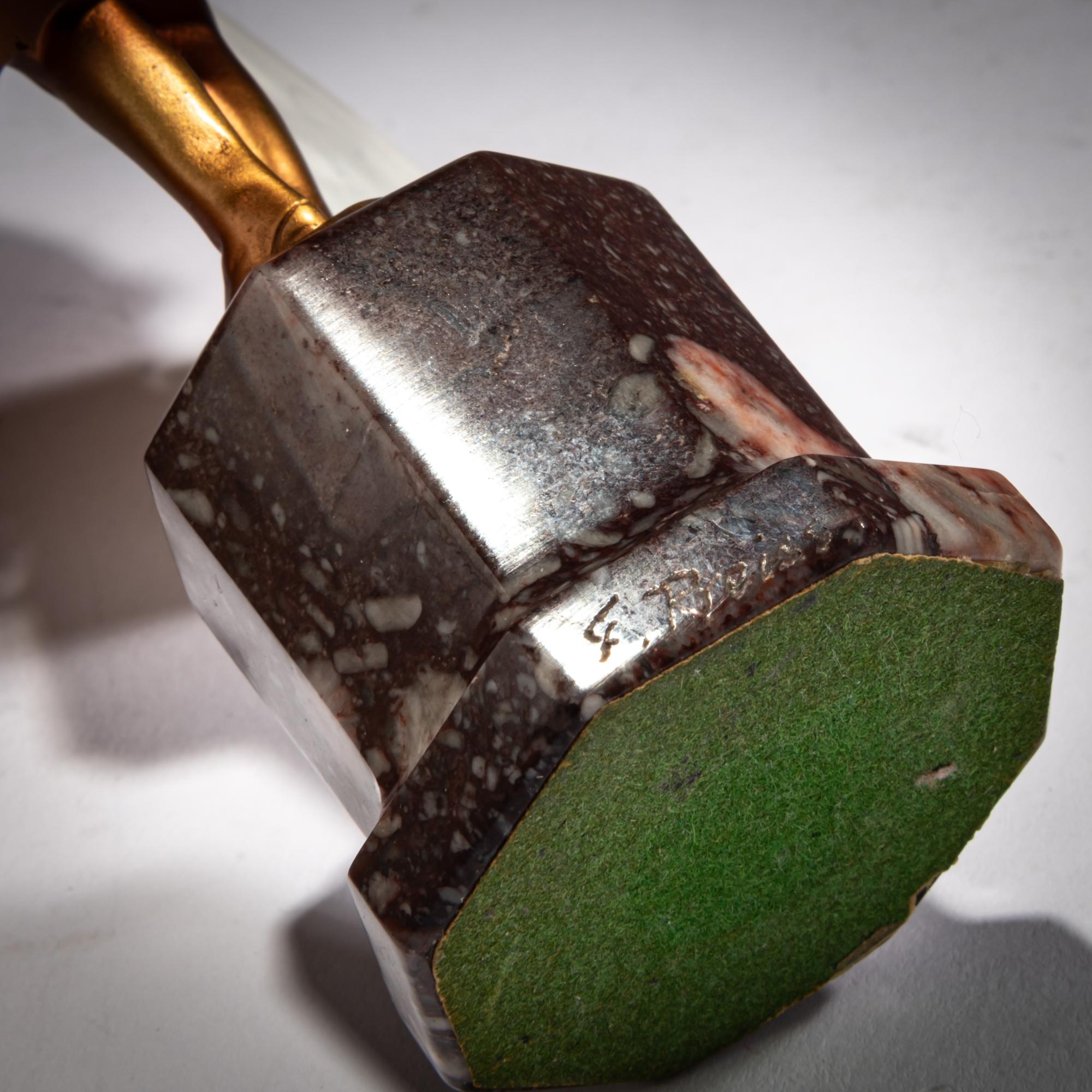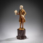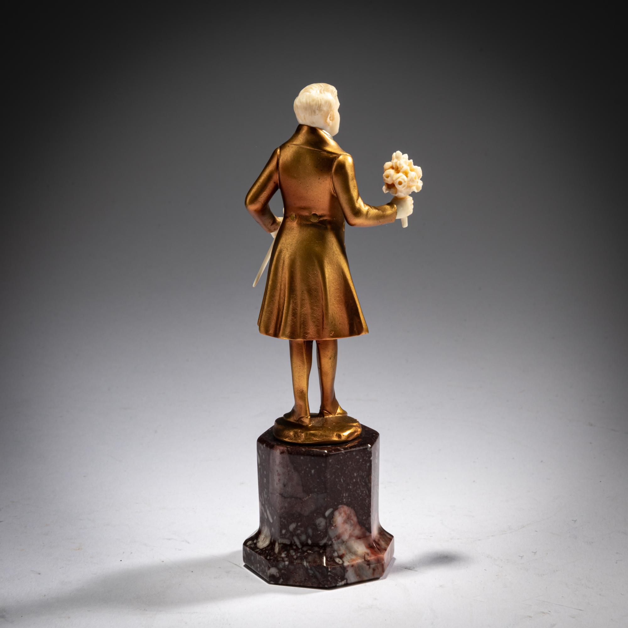 H. 14,5 cm (gesamt). Bronze, kalt bemalt, Kopf, Hände, Blumenstrauß und Stock aus geschnitztem Elfenbein. Sockel sign.: F. Preiss (geritzt). Roter Marmorsockel.