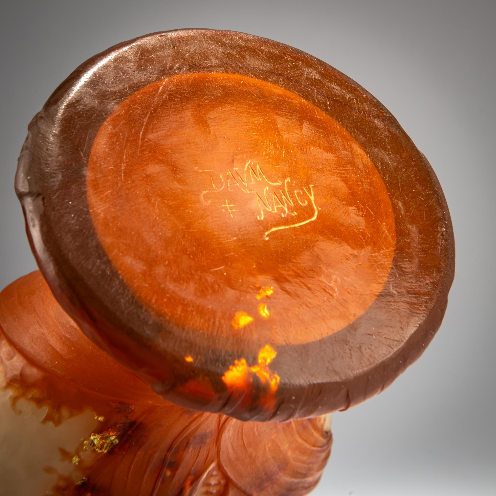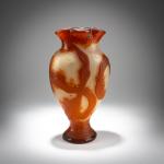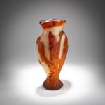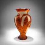 Zweiseitig abgeflachte Balusterform. H. 29,7 cm. Überfangglas, farblos, opalweiß und orangerot mit eingeschlossener zerplatzter Edelmetallfolie. Geätzter und geschnittener, vollständig mit dem Rad in Marteléschnitt überarbeiteter Dekor mit Maiskolben. Boden sign.: DAUM, Lothringer Kreuz, NANCY (graviert).