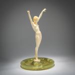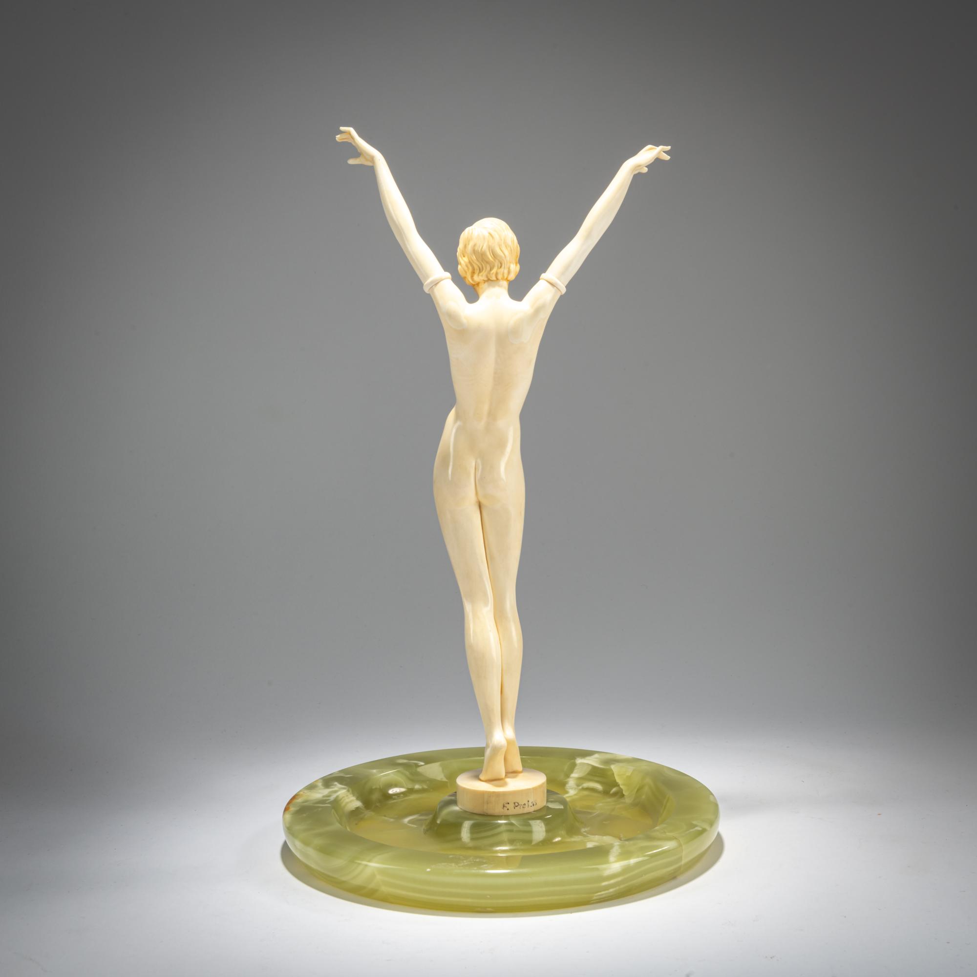 H. 33 cm, Ø 20 cm (gesamt). Geschnitztes Elfenbein. Plinthe sign.: F. Preiss (geritzt). Onyxschale.