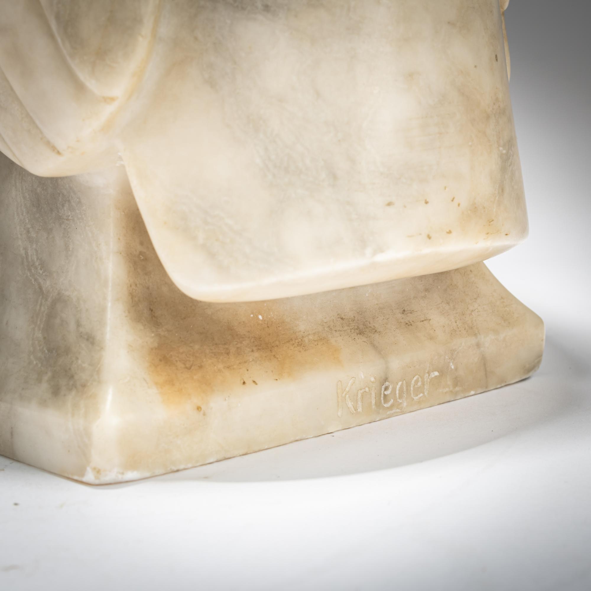H. 41 cm. Geschnitzter weißer und grauer Alabaster, teilweise bemalt. Sockel hinten bez.: KRIEGER (geritzt). Am Boden Signet der Hessische Kunstwerkstätten Altmorschen.