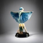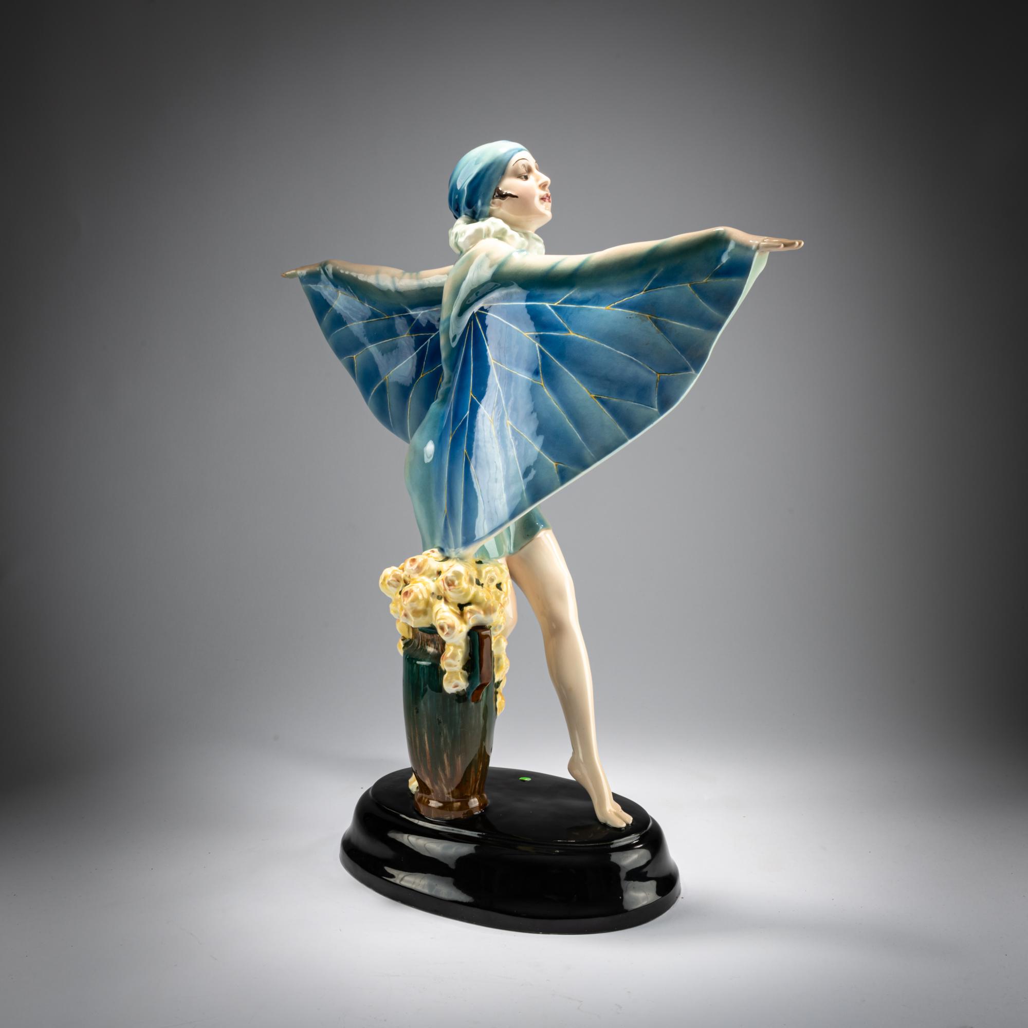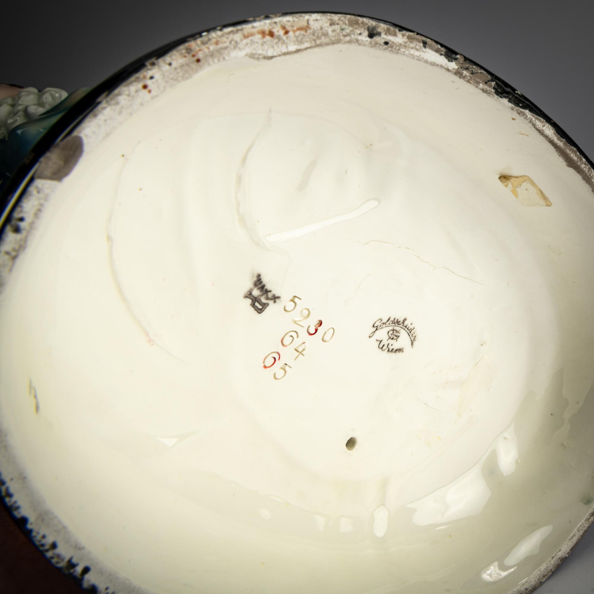 H. 47,2 cm. Ausführung: Friedrich Goldscheider, Wien. Steingut, polychrom glasiert. Sockel sign.: Lorenzl (geprägt) Boden bez.: Goldscheider Wien, (schwarzer Glasurstempel) 5230 64 65 (geprägt), XXVII, weitere handschriftliche Zeichen (schwarz).