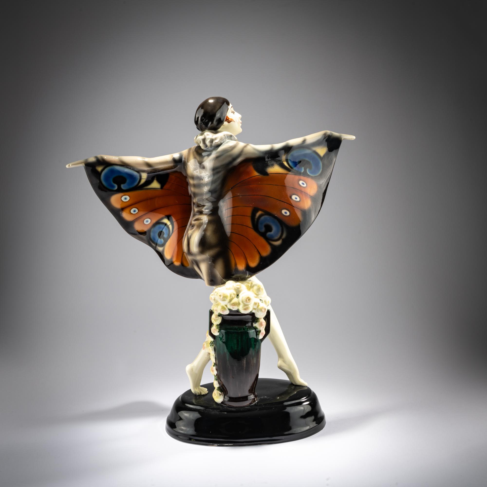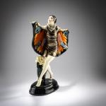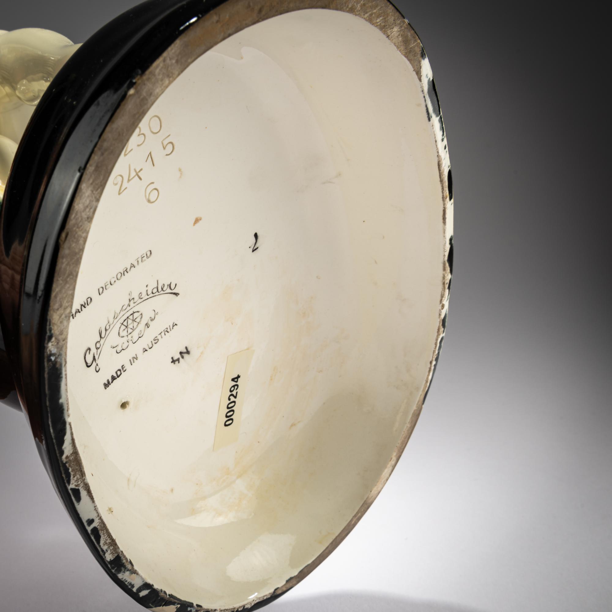 H. 45 cm. Ausführung: Friedrich Goldscheider, Wien. Steingut, polychrom glasiert. Boden bez.: MADE IN AUSTRIA, Goldscheider Wien, Hand Decorated (schwarze Glasurstempel) 05 5230 2415 6 (geprägt), handschriftliche Zeichen (schwarz).