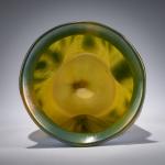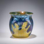 Schnitt-Nr. 810, auf rundem Stand dreifach eingedellte Wandung mit ausschwingender Mündung. H. 11 cm. Ausführung: Lötz Wwe., Klostermühle. Überfangglas, opalgelb und farblos, Dekor aus senkrecht gestricheltem silbergelben Fäden, im oberen Wandungsbereich blauer und silbergelber Fadendekor, wellenförmig verzogen mit tropfenartigen Spitzen, metallgelb, stark perlmuttfarben mattlüstriert. Phänomen Gre 353. Im ausgeschliffenen Abriss sign.: Loetz Austria (graviert).