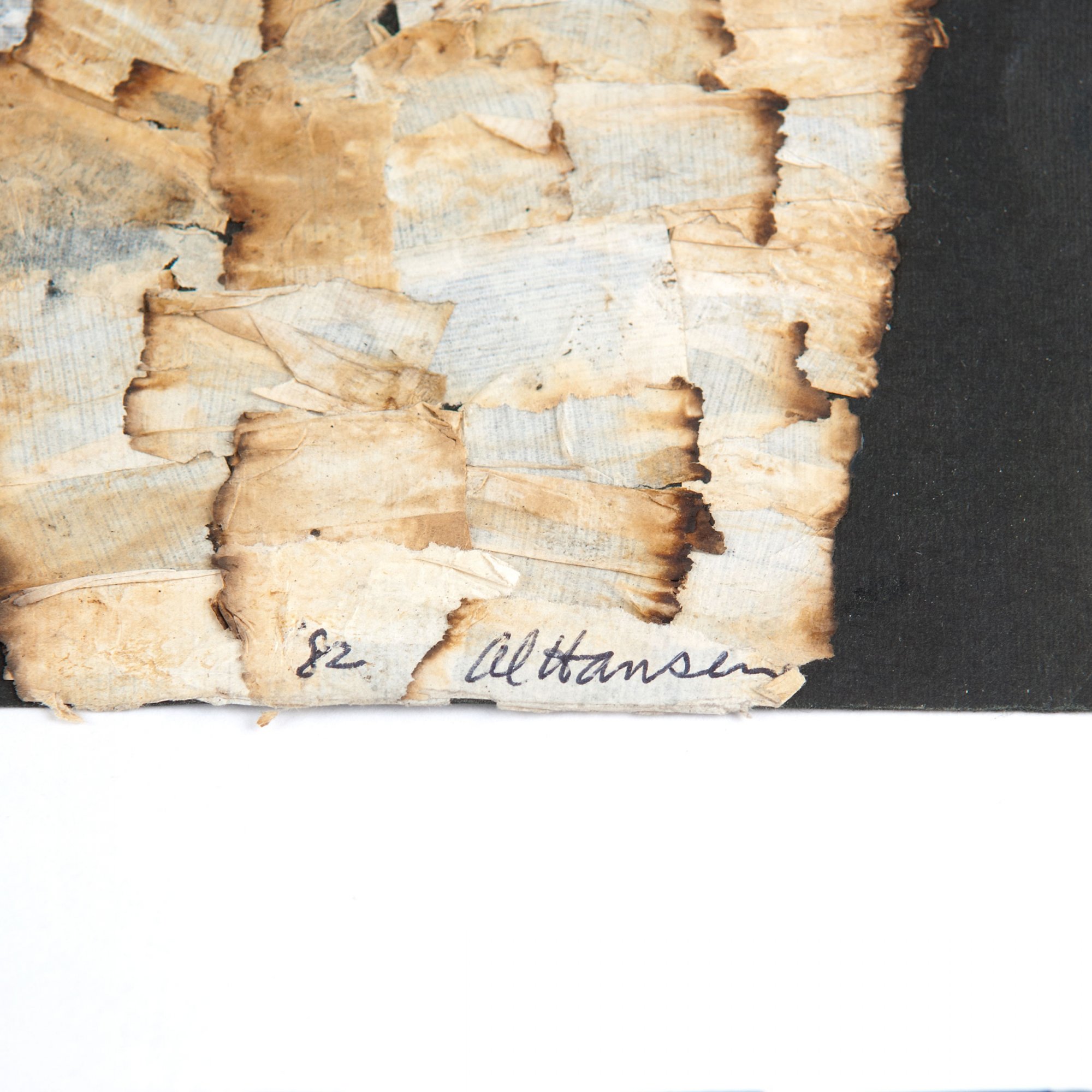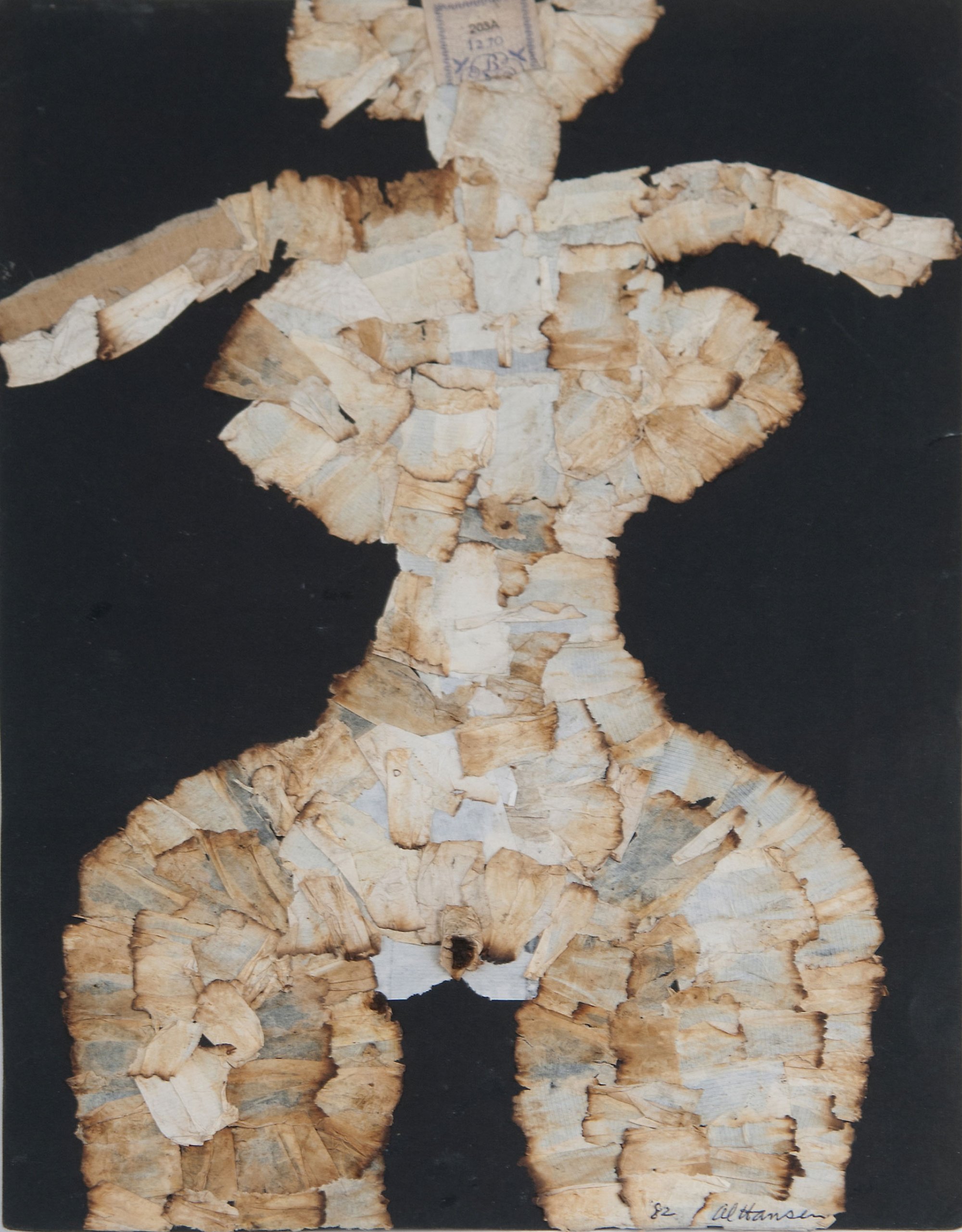 Venus-Collage aus gebrauchtem Zigarettenpapier und einer Tabaksteuerbanderole aus Luxemburg auf schwarzem Karton. Rechts unten sign.: Al Hansen und datiert (19)82 (Filzstift). Diese Collage war 2002 in der Ausstellung "Vierzig Jahre Fluxus: Joseph Beuys, Dieter Roth, Emmett Williams, Al Hansen, Nam June Paik, Milan Knizak u.a." im Kunstverein in Weiden/Oberpfalz zu sehen.