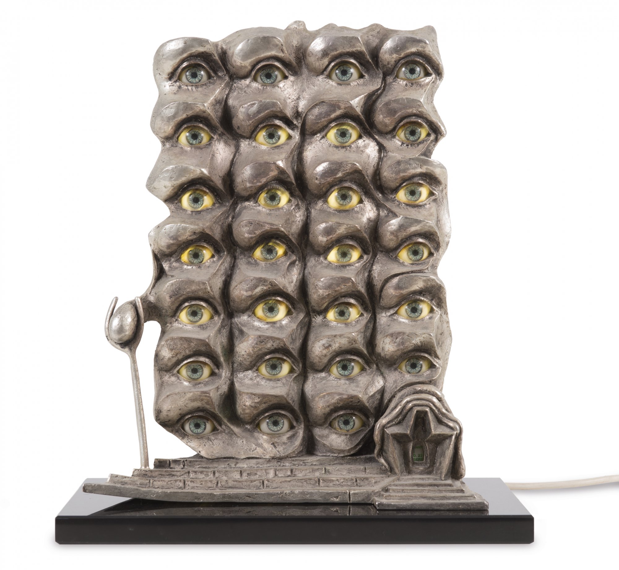 Bronze mit silberner Patina und integrierten Kunststoffaugen. H. 34,0 x 22,0 x 5,5 cm. Auf der Rückseite sign.: Dalí (Stempel), nummeriert und mit dem Gießerstempel VENTURI ARTE, links unten am Sockel mit dem Editionsstempel TE und der gestempelten Datierung und Bezeichnung DALART N. V. Ex. 213 von 999 Exx. Mit originaler Verkabelung, funktionsfähig u. mit Originalzertifikat (Nr. 213/999).