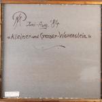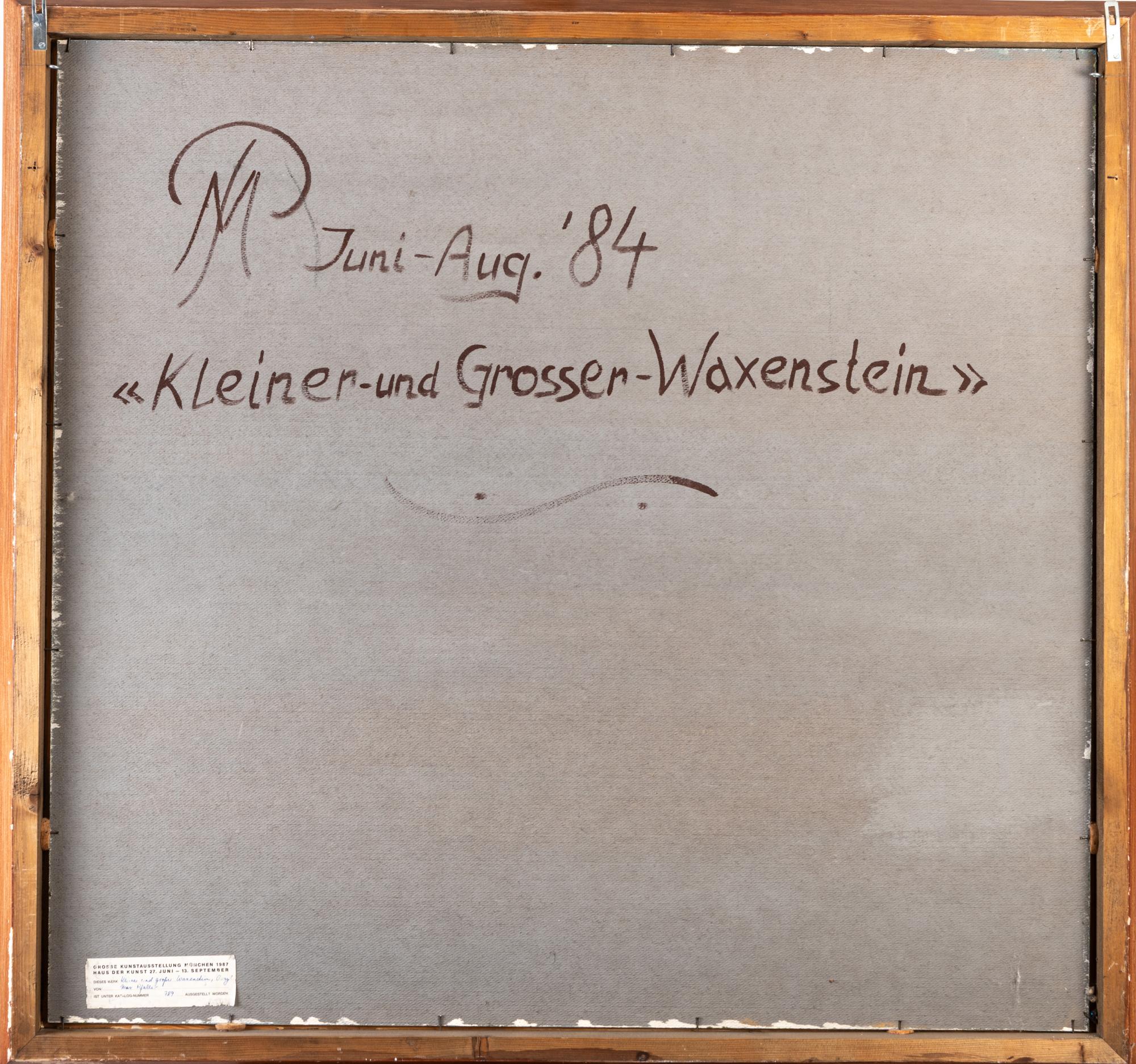 Öl auf Platte. 92,5 x 98,5 cm (Platte), 102,5 x 108,5 cm (Rahmen). Unten links monogrammiert: MP (Öl), verso monogrammiert: MP, datiert: Juni - Aug.'84 und betitelt: <<Kleiner - und Grosser - Waxenstein>> (schwarzer Faserstift) sowie auf einem Klebeetikett vom Haus der Kunst bezeichnet. Gerahmt.